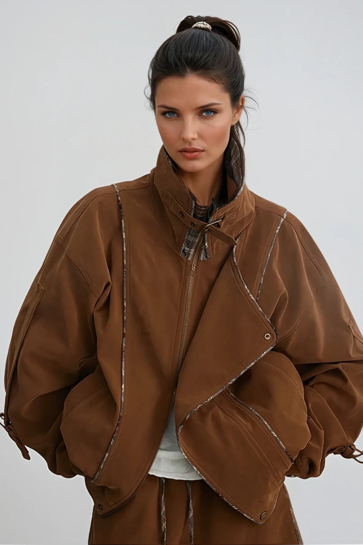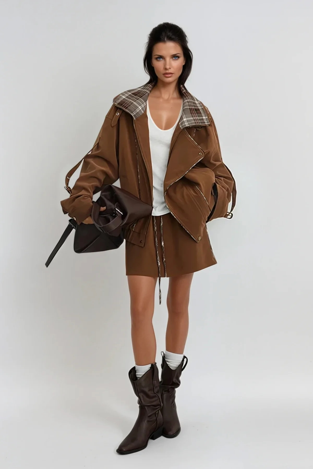 Indulge in the sophisticated elegance of the stylish Brown Grid Pattern Asymmetric Skirt Set . This set boasts a modern grid pattern and an asymmetric hemline, designed to flatter various body types with a unique silhouette. Whether for professional meetings or social events, this versatile set is meticulously crafted for comfort and movement. Its structured fabric elevates mobility while maintaining a polished look, ideal for those desiring contemporary elegance with a tailored touch. Look chic and feel confident with this non-stretch set. Gentle machine wash recommended. Due to lighting, color may vary. True color represented in product images without models.
