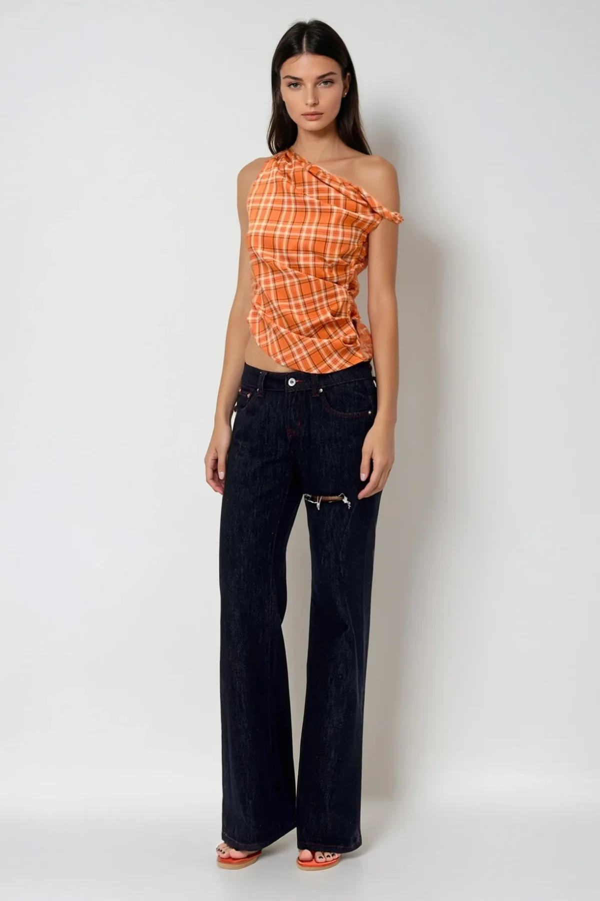 Elevate your wardrobe with our Grid Ruched One Shoulder Top in vibrant orange. Crafted with precision, this top features an asymmetrical design and strategic ruching to enhance your silhouette. The distinctive grid texture adds visual appeal while maintaining a sleek profile that effortlessly transitions from casual to evening wear. Made from 50% Polyester and 50% Cotton for comfort. Style effortlessly and command attention with its contemporary design. This top is gentle machine washable, however, color may vary due to image lighting. Add a modern flair to your outfit now!
