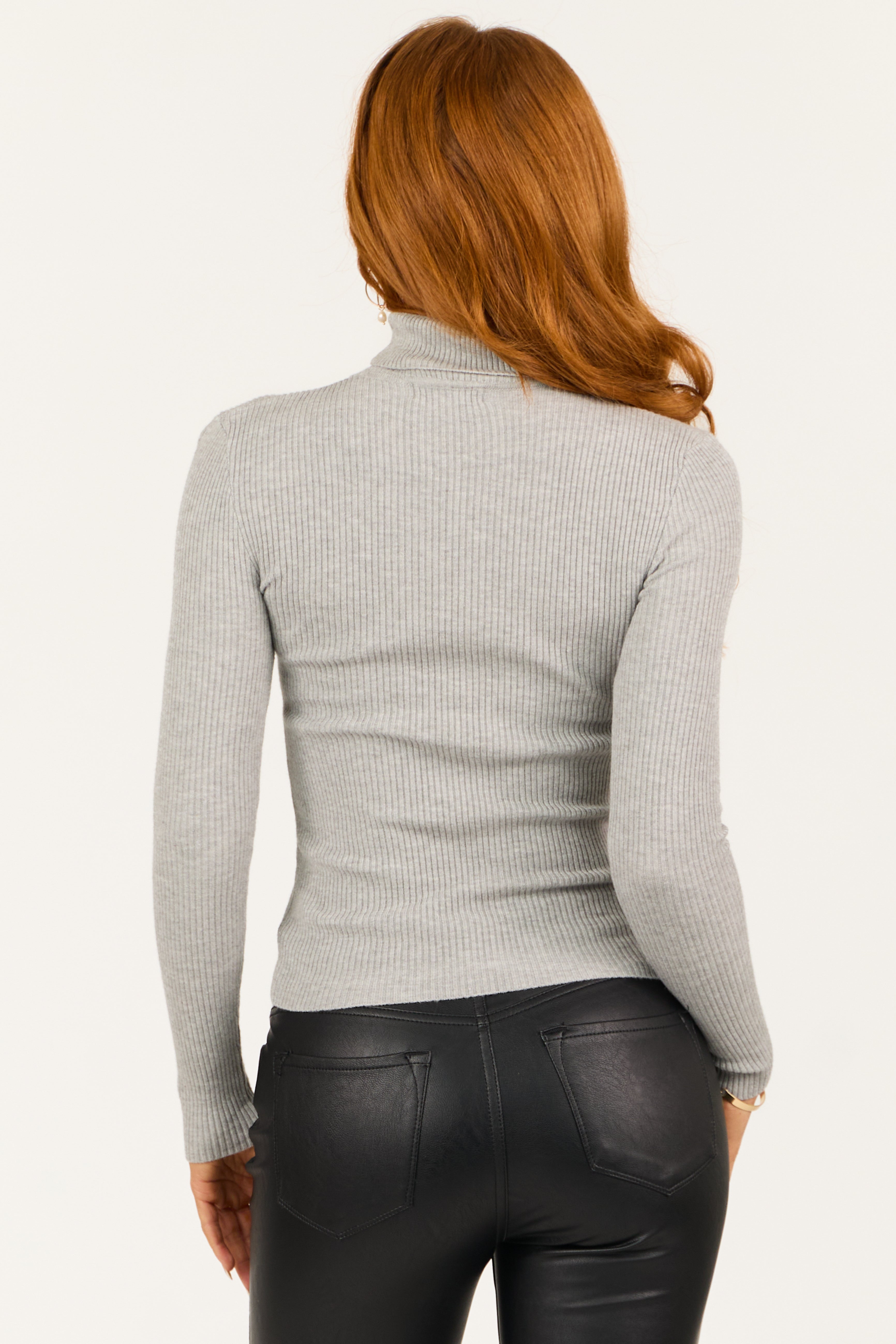 Stay stylish and comfortable in this Heather Grey Ribbed Knit Long Sleeve Top . Made with a blend of 50% Viscose, 30% Polyester, and 20% Nylon, this top features a turtleneck and banded trim for a fitted look. The stretchy ribbed knit ensures a flattering fit while providing flexibility for all-day wear. Perfect for the winter season, pair it with your favorite bottoms for a chic ensemble. Available in sizes S, M, and L.