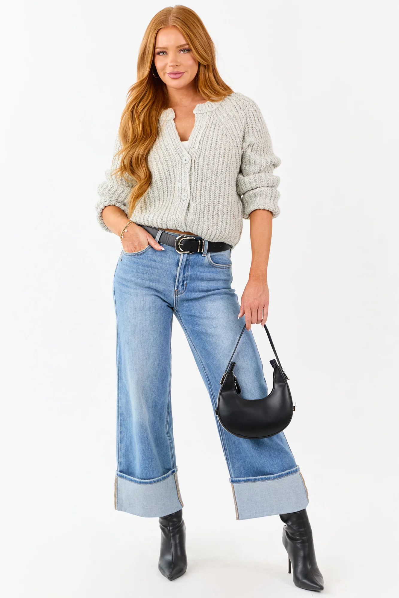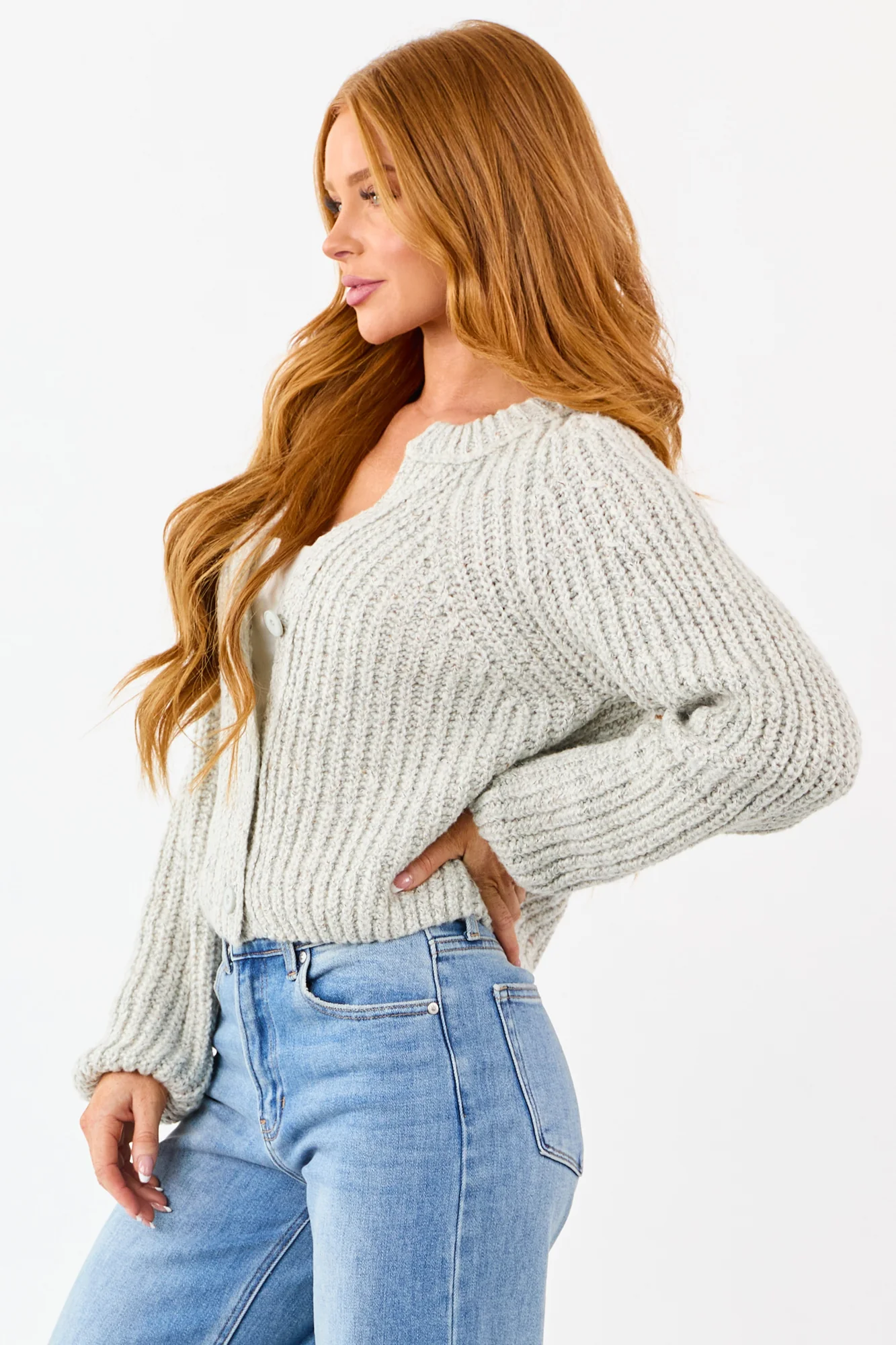 Stay cozy and chic with our heathered grey ribbed knit button-up cardigan. Crafted from a soft ribbed knit blend of 63% Acrylic, 20% Cotton, and 1% Polyester, this cardigan is perfect for casual outings or office wear. The relaxed fit and stretchy texture provide comfort, while the button-up design adds versatility. Available in sizes S, M, and L. The length ranges from 21″ to 22″, with bust sizes of 40″ to 46″ and sleeve length of 26″. Imported. Model is wearing a size Small.Model #1 Profile: Size 1, Height 59″, Bust 34″, Waist 26″Model #2 Profile: Size 1, Height 55″, Bust 33″, Waist 24″