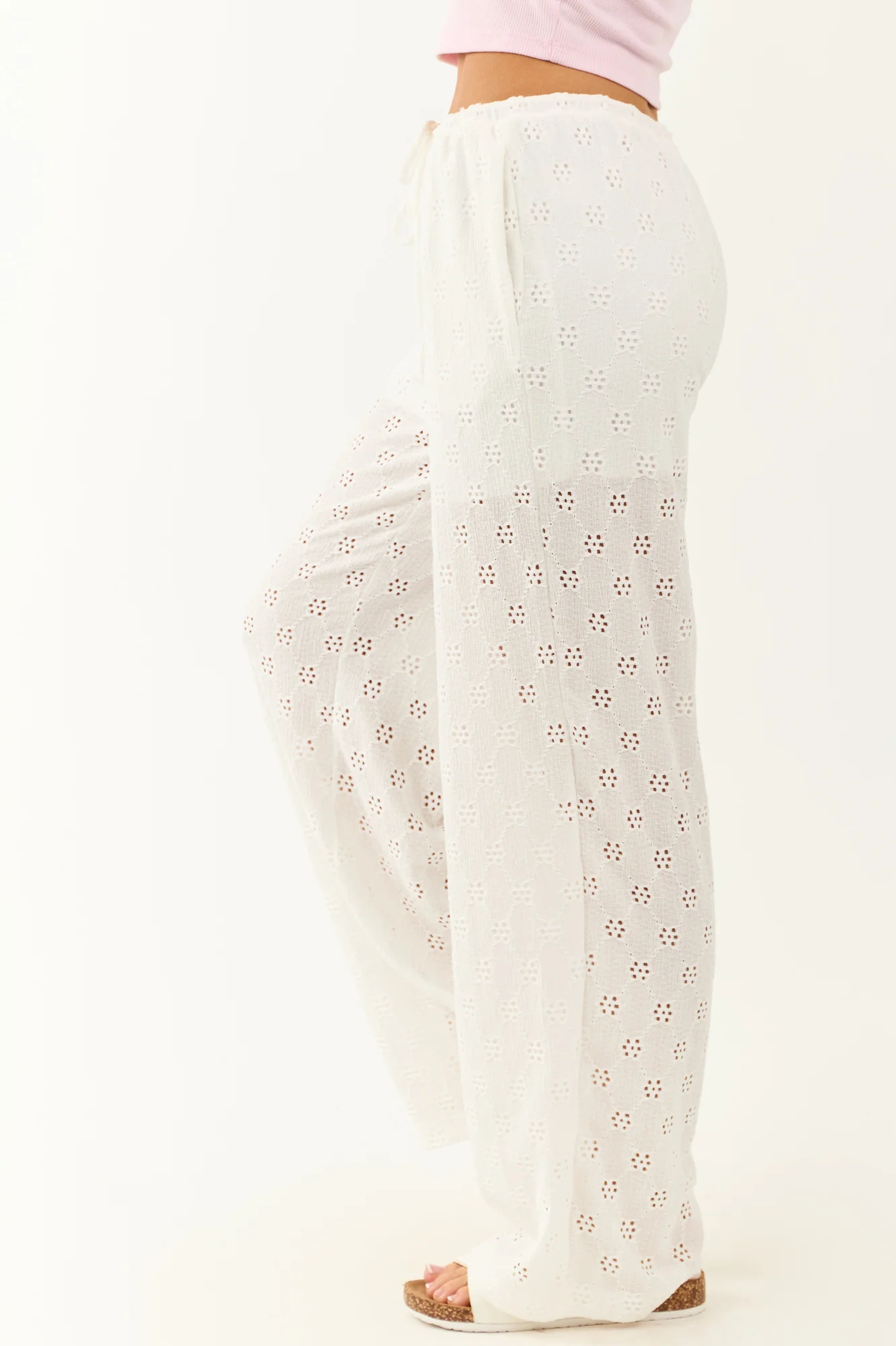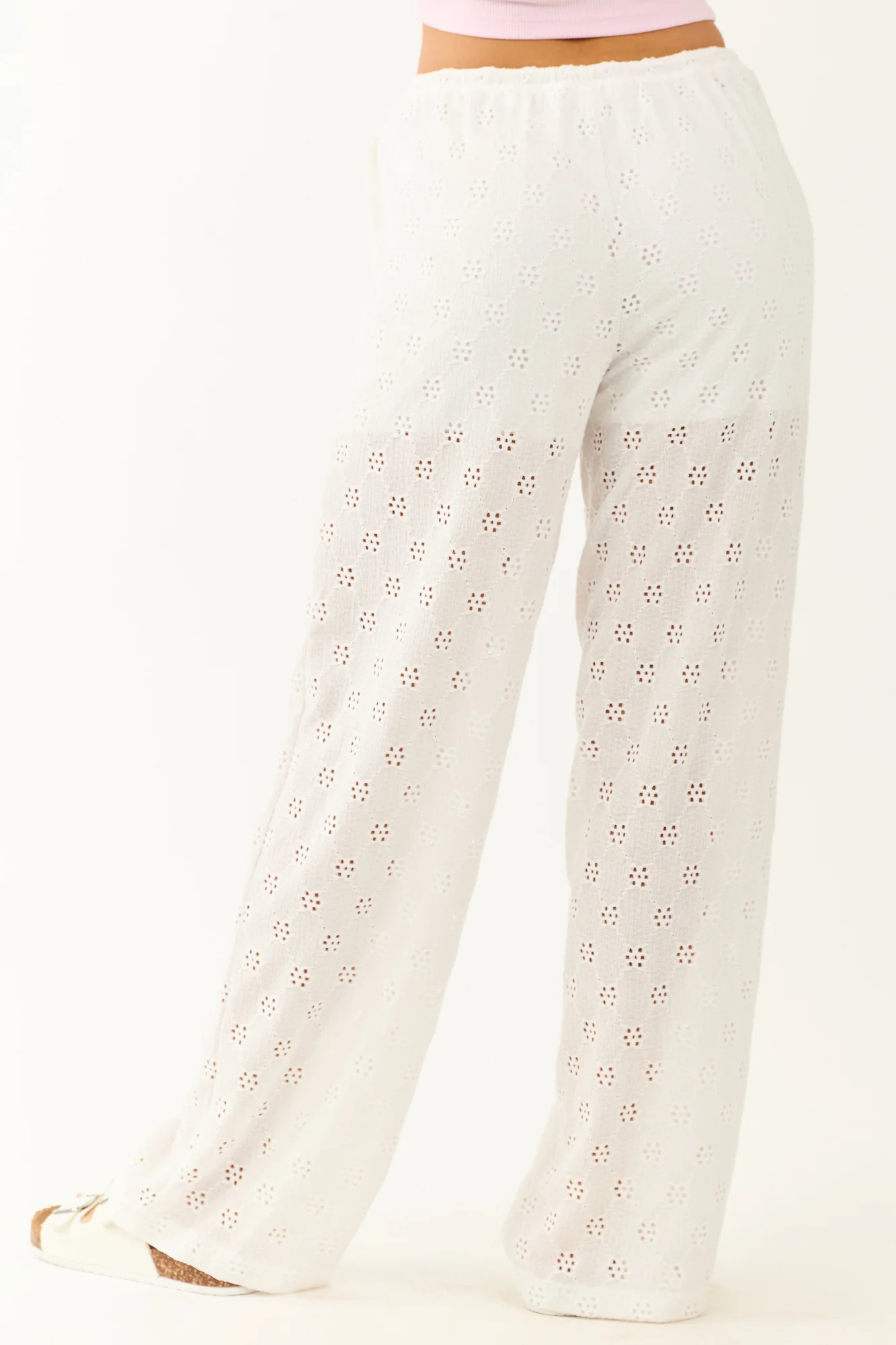 Indulge in style with these high-rise ivory knit drawstring pants, available in sizes Small, Medium, and Large. Featuring a waist range from 30-40 inches and inseam options of 30-32 inches, these stretchy pants offer comfort and fashion in one. The drawstring elastic waistband, two pockets, and unlined design add practicality to the chic look. Crafted from 99% polyester and 1% spandex, these imported pants are perfect for casual outings. Note: Hand wash cold, do not bleach, do not iron, dry flat. Model is wearing a size Small. Model’s Profile: Size 1, Height 57″, Bust 34″, Waist 26″.