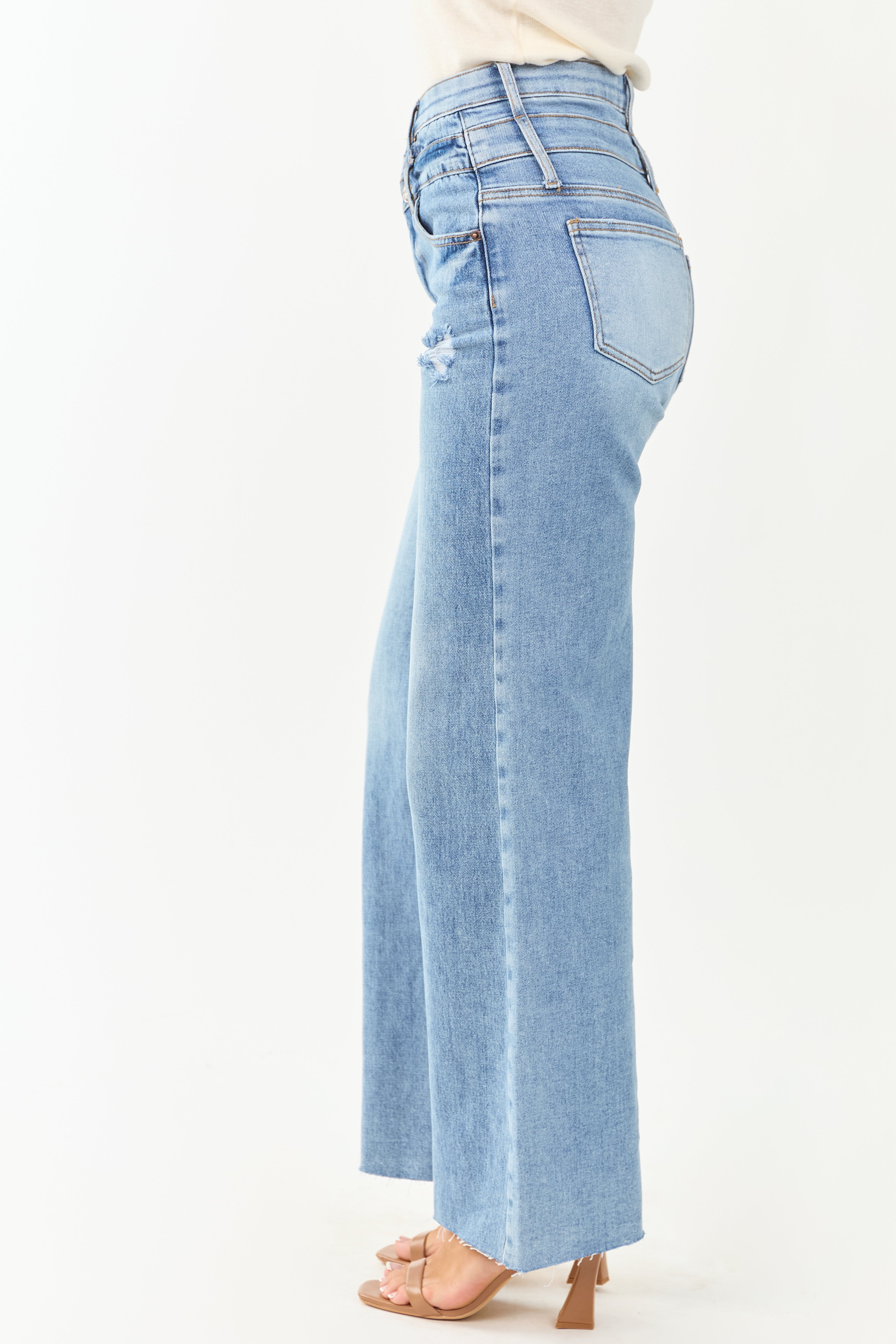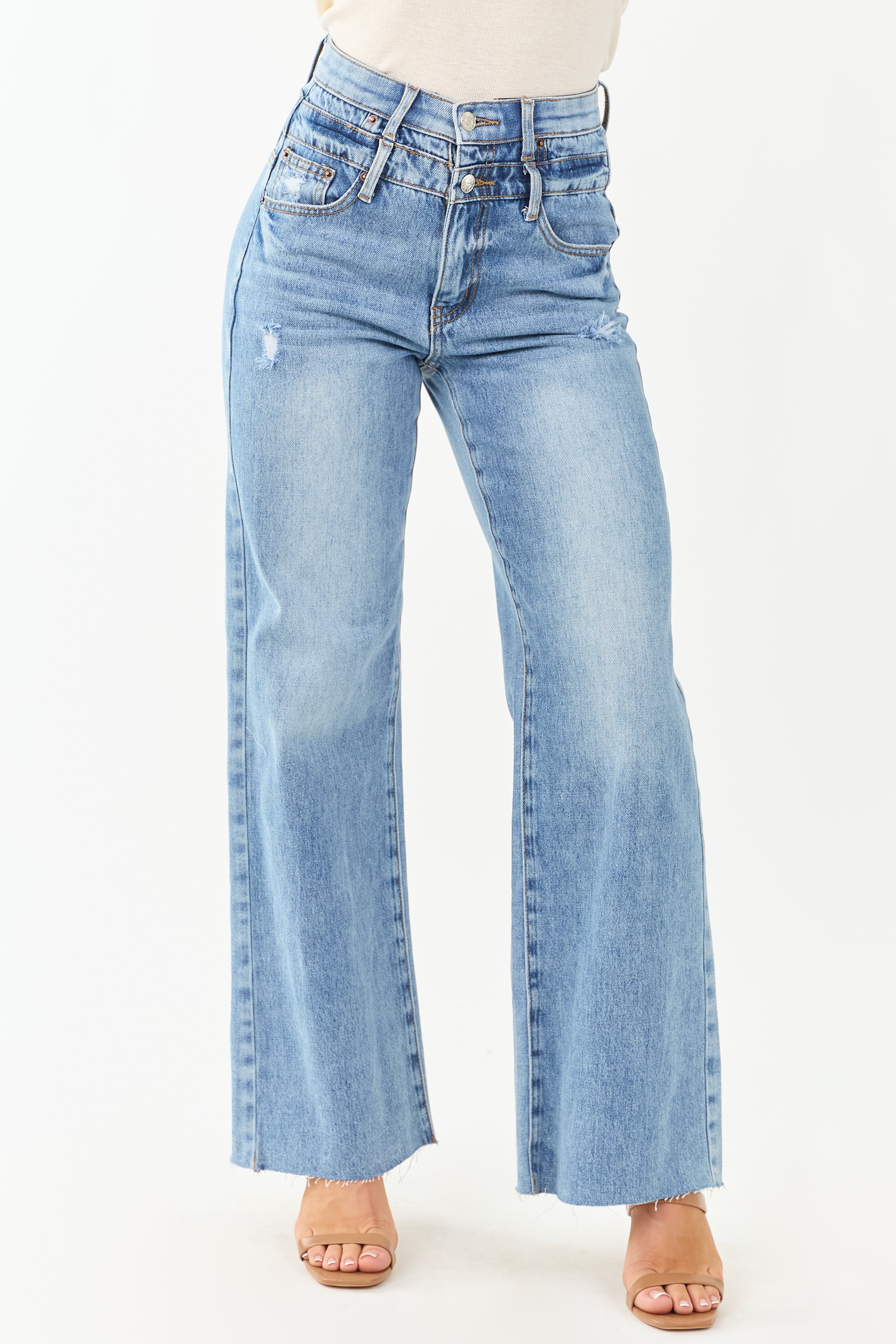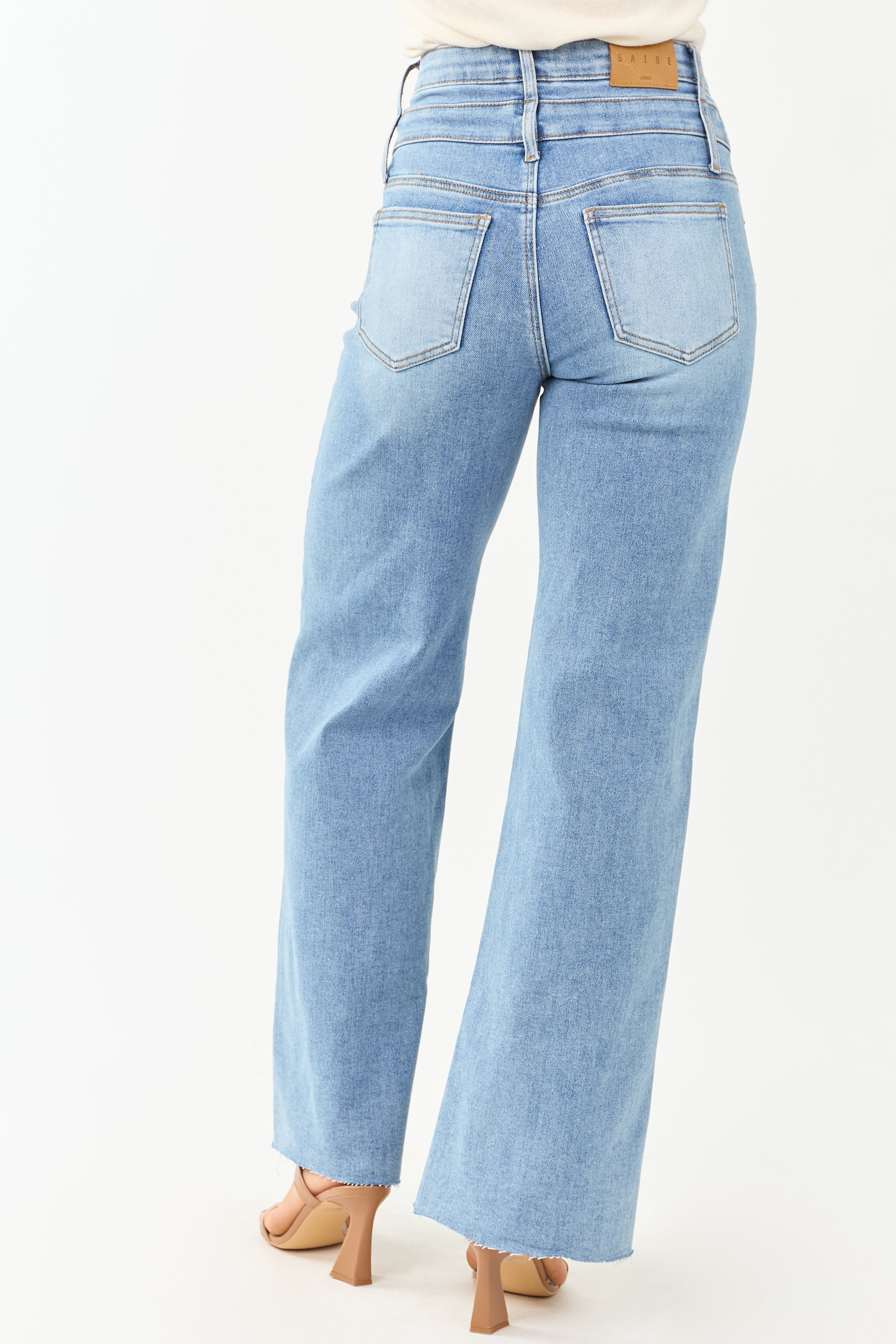 Experience the ultimate blend of style and comfort with our High Rise Stretchy Back Denim Straight Jeans. With a structured front for support and a stretchy back for flexibility, these jeans are designed to be your go-to denim secret weapon. The super high rise fit, raw hem, and slight distressing add a trendy edge to your look. Made with a mix of cotton, polyester, and spandex, these jeans offer a non-stretchy front and a stretchy back. Complete with 5 pockets, belt loops, and a zipper fly with a double button closure, these jeans are as functional as they are fashionable. Imported.