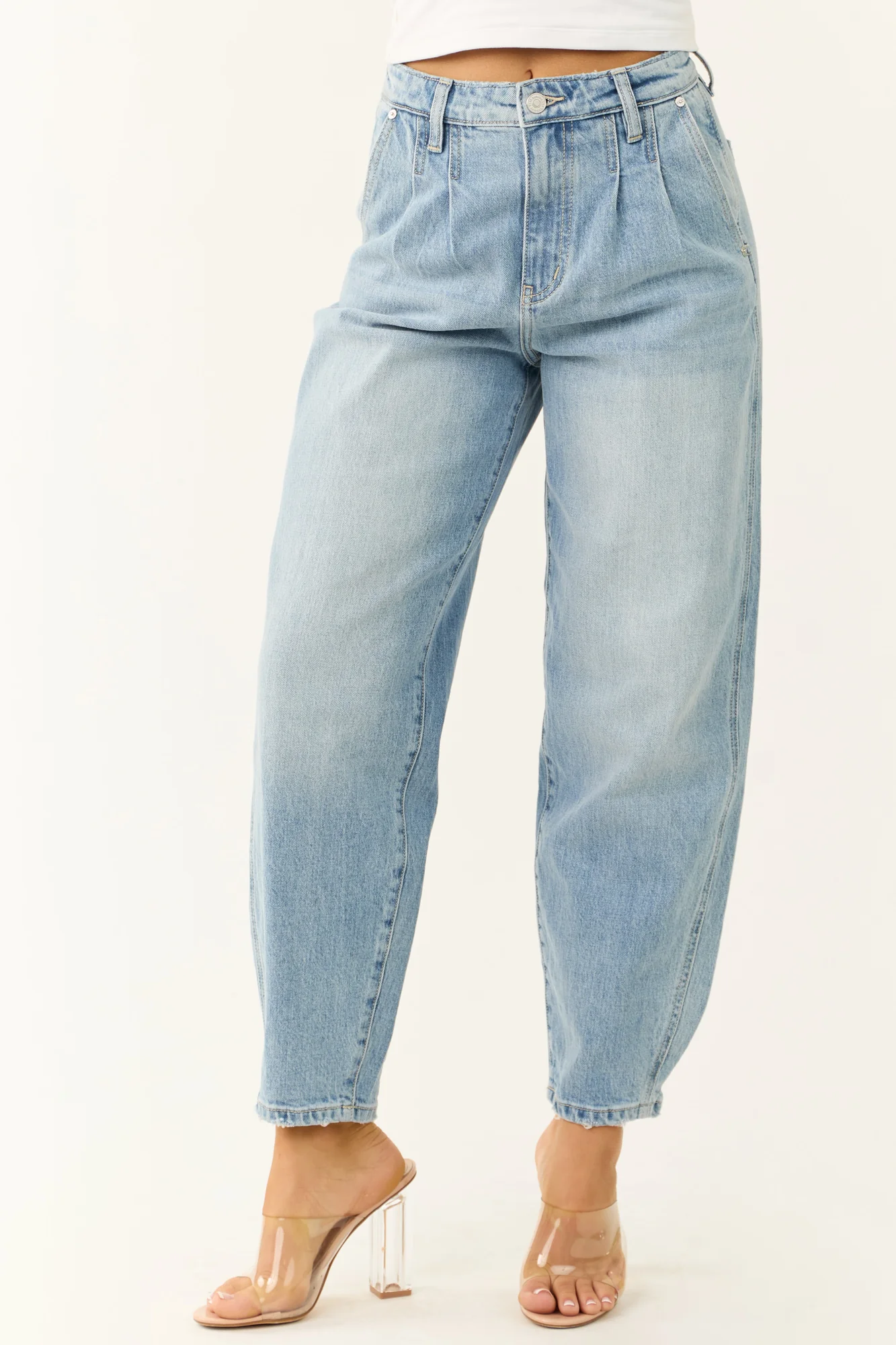 These High Rise Tapered Barrel Jeans are a must-have addition to your denim collection. Crafted from 99% Cotton and 1% Spandex, these jeans offer a stylish and comfortable fit. The waistband fits large, so consider sizing down for the perfect fit. Get that trendy ankle-length look with light distressing and extra seam detail on the waist. The pleated waist adds a unique touch while the 4 functional pockets and belt loops provide practicality and style. Experience the perfect blend of fashion and comfort with these imported denim jeans.