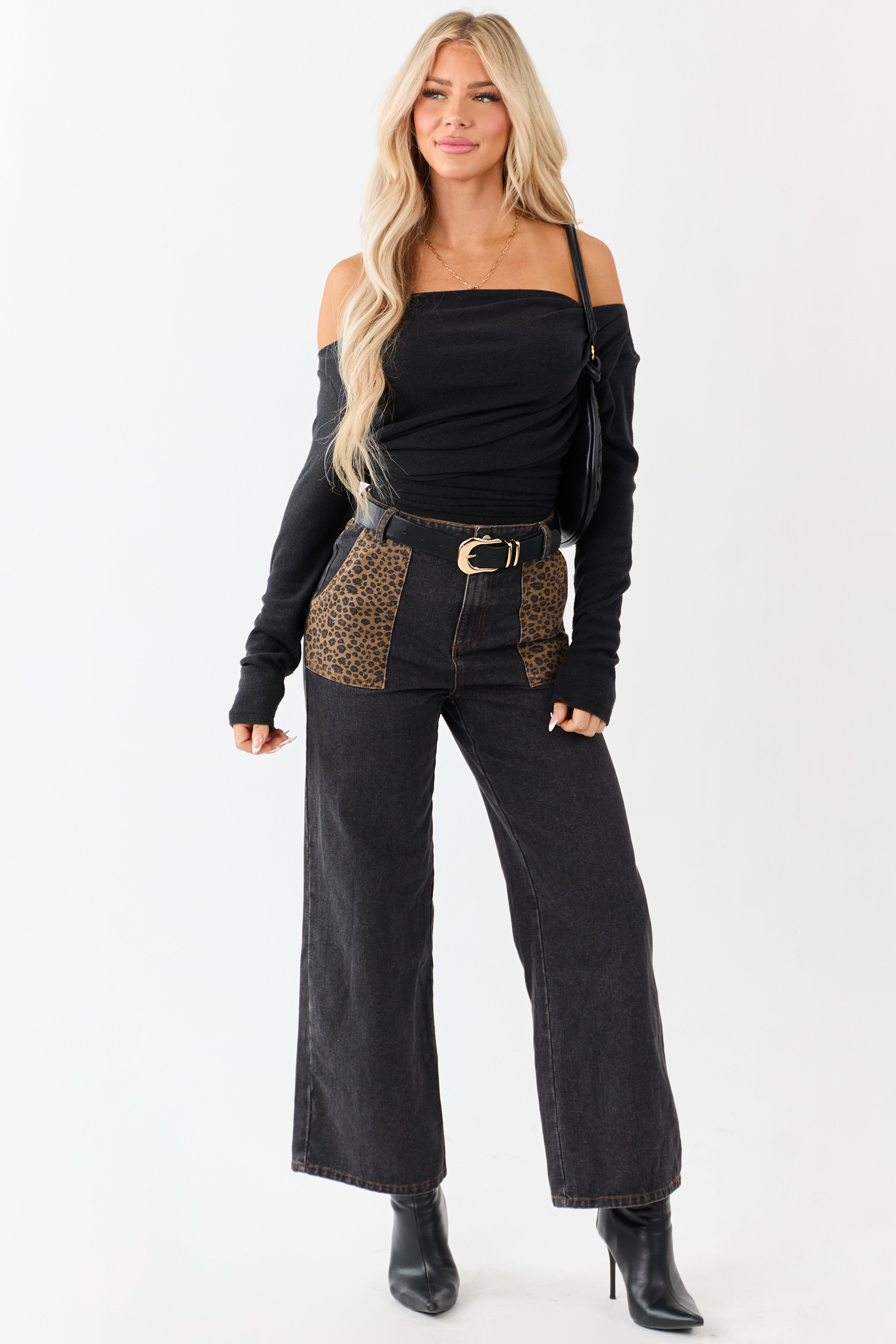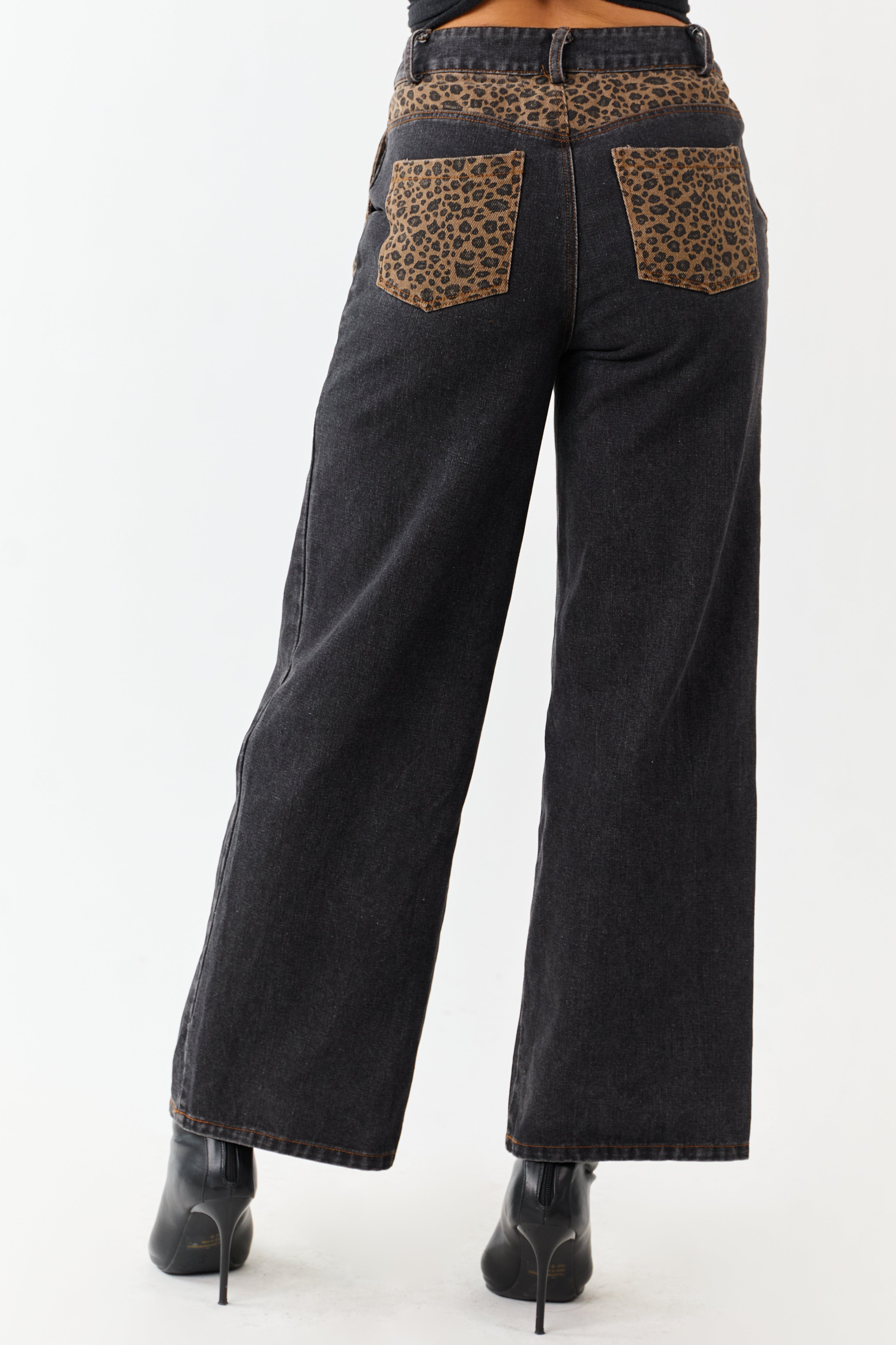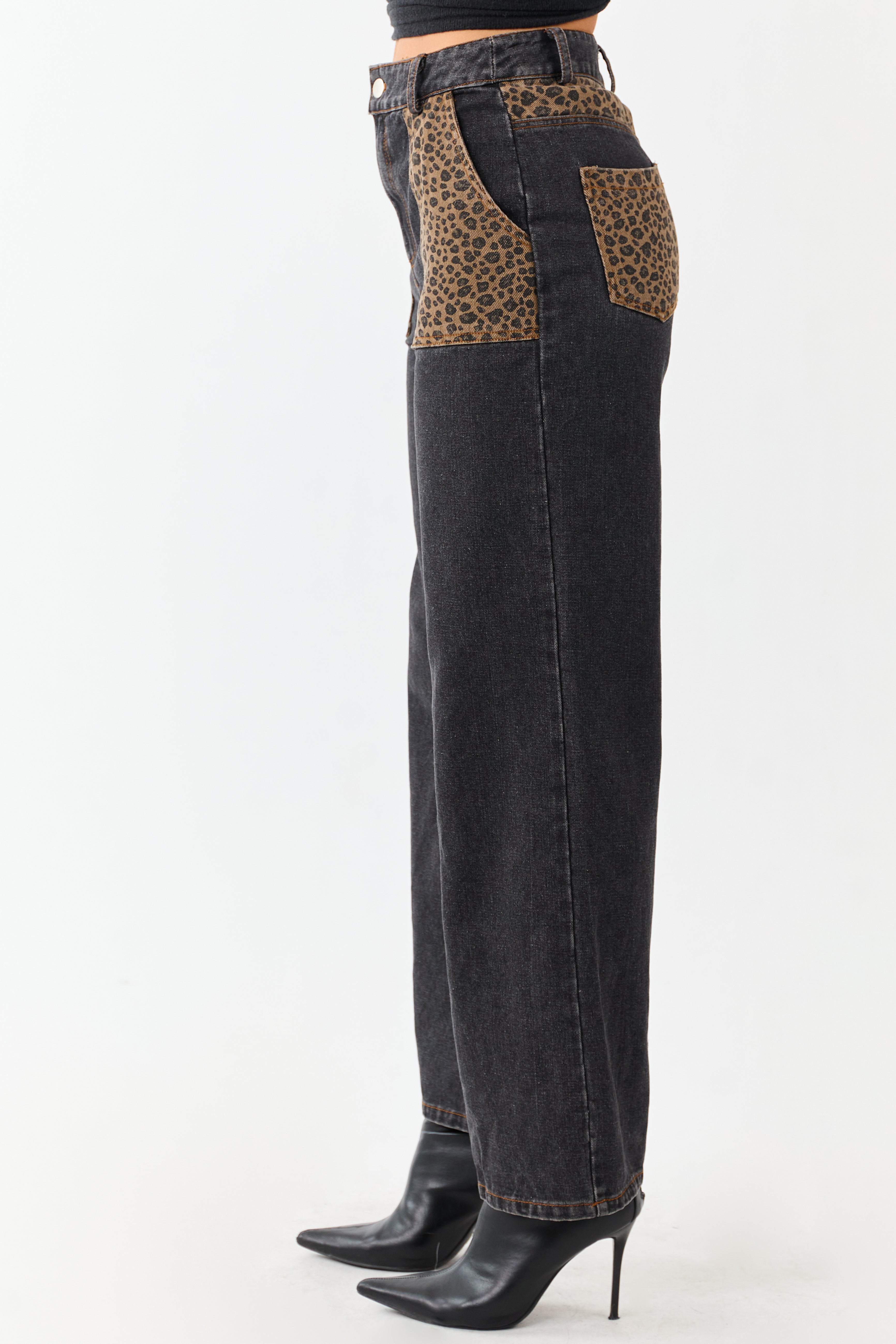 Step out in fierce style with these high-rise jeans featuring bold leopard print detailing in shades of coffee and black. The wide-leg silhouette offers a flattering fit, while the non-stretchy denim ensures a structured look. These jeans come with a zipper fly, button closure, belt loops, and four pockets for added functionality. Embrace the trend with these stylish jeans made from 100% cotton. Model is wearing size Small.