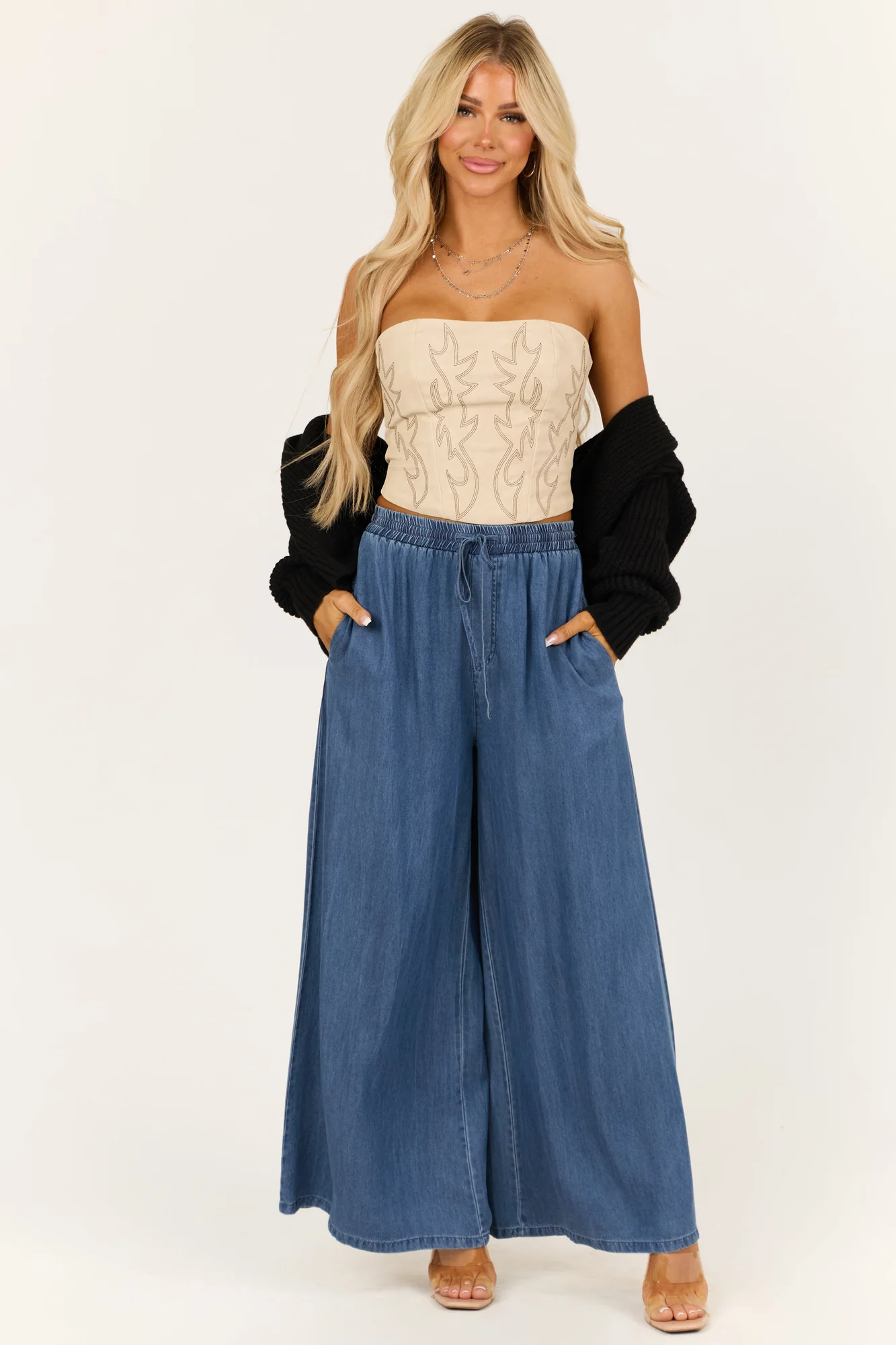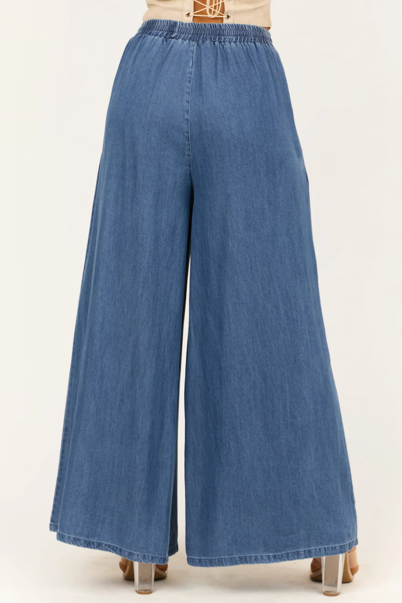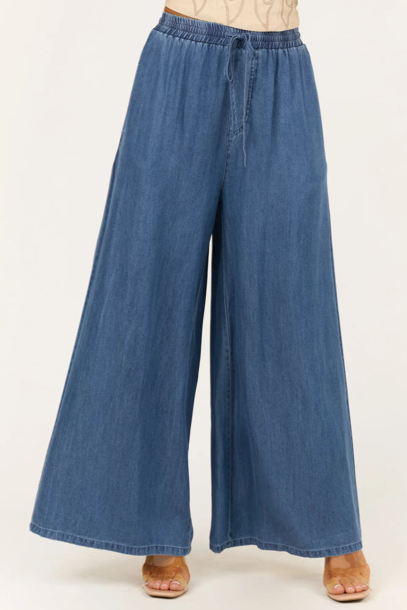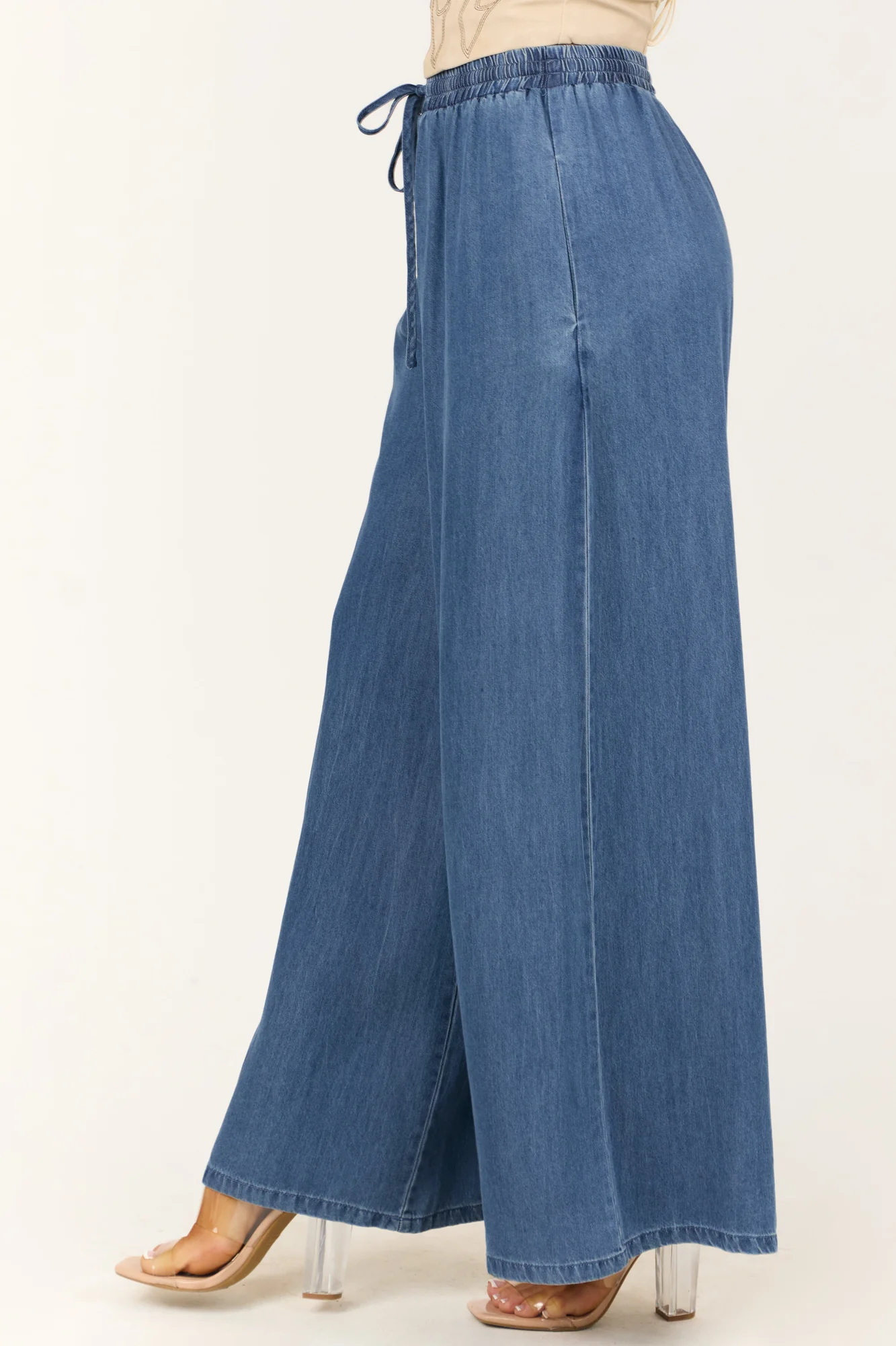 These versatile High Rise Wide Leg Tencel Denim Pants in Dark Wash offer both style and comfort. Made from semi-stretchy tencel, they feature a smocked waist with an adjustable tie for a customized fit. With convenient side pockets and a composition of 95% Polyester and 5% Spandex, these pants are perfect for everyday wear. Available in sizes S, M, and L with inseam options of 27 inches. Hand wash cold separately to preserve color. Embrace the effortlessly chic look with these wide-leg pants!