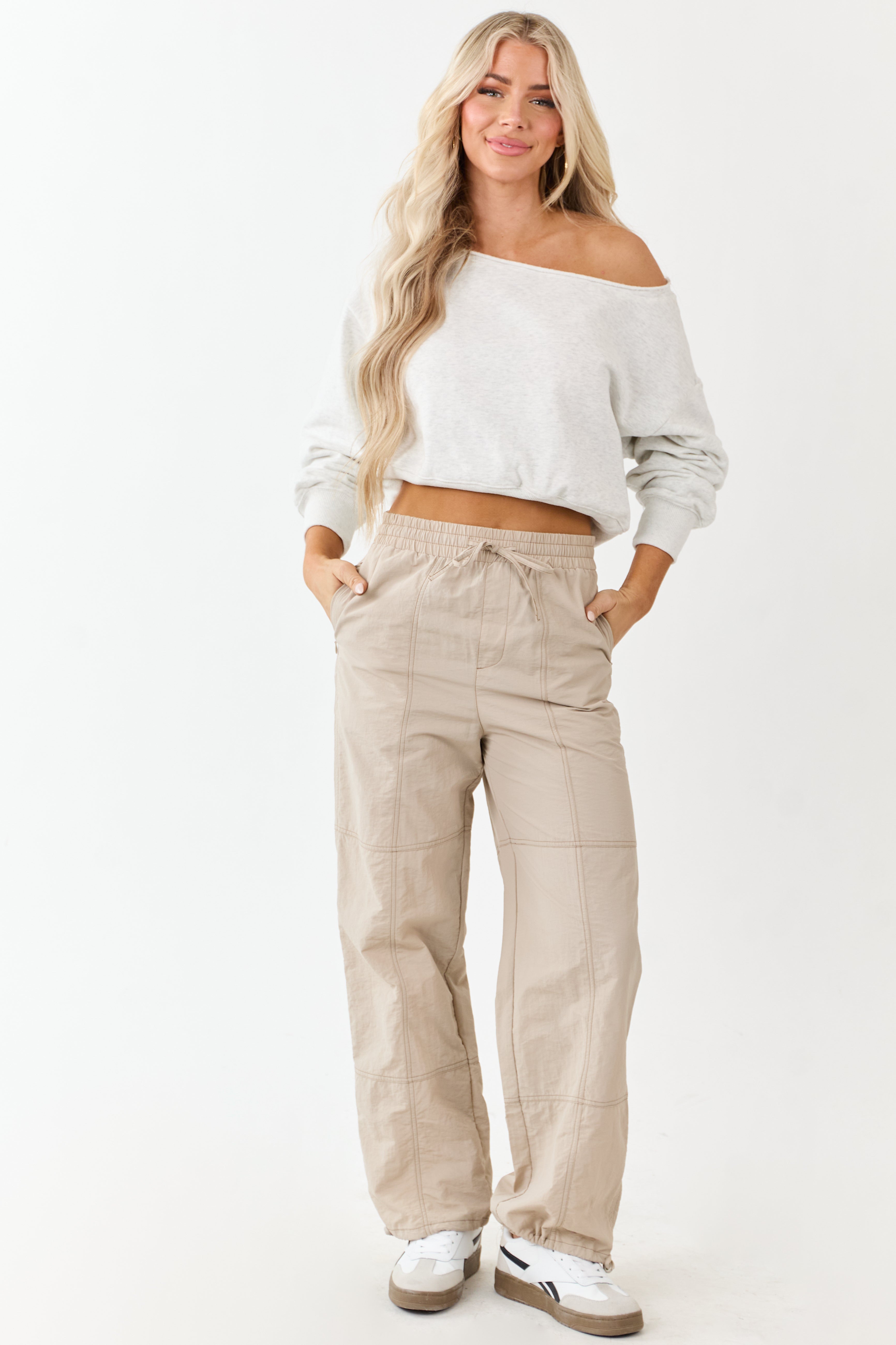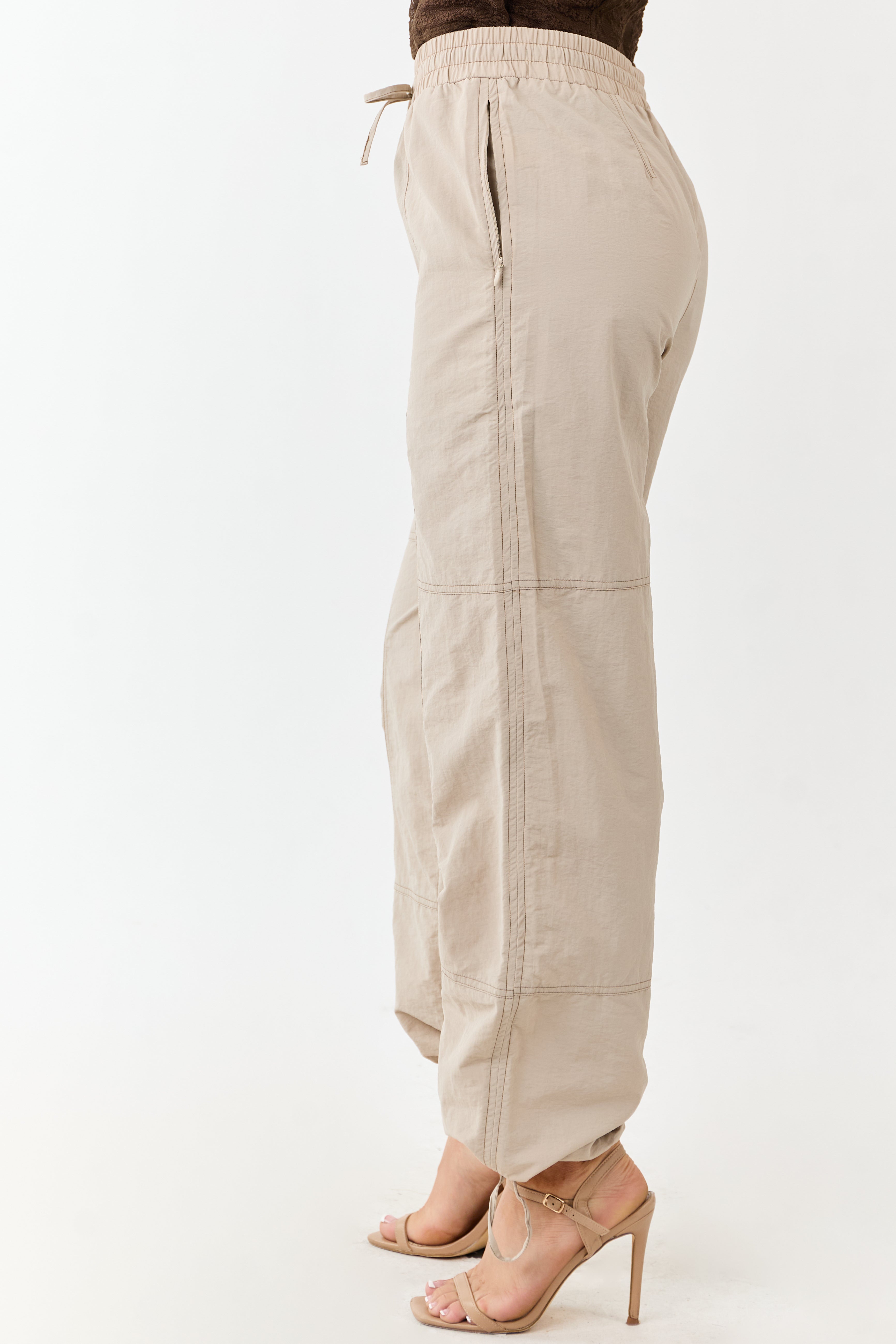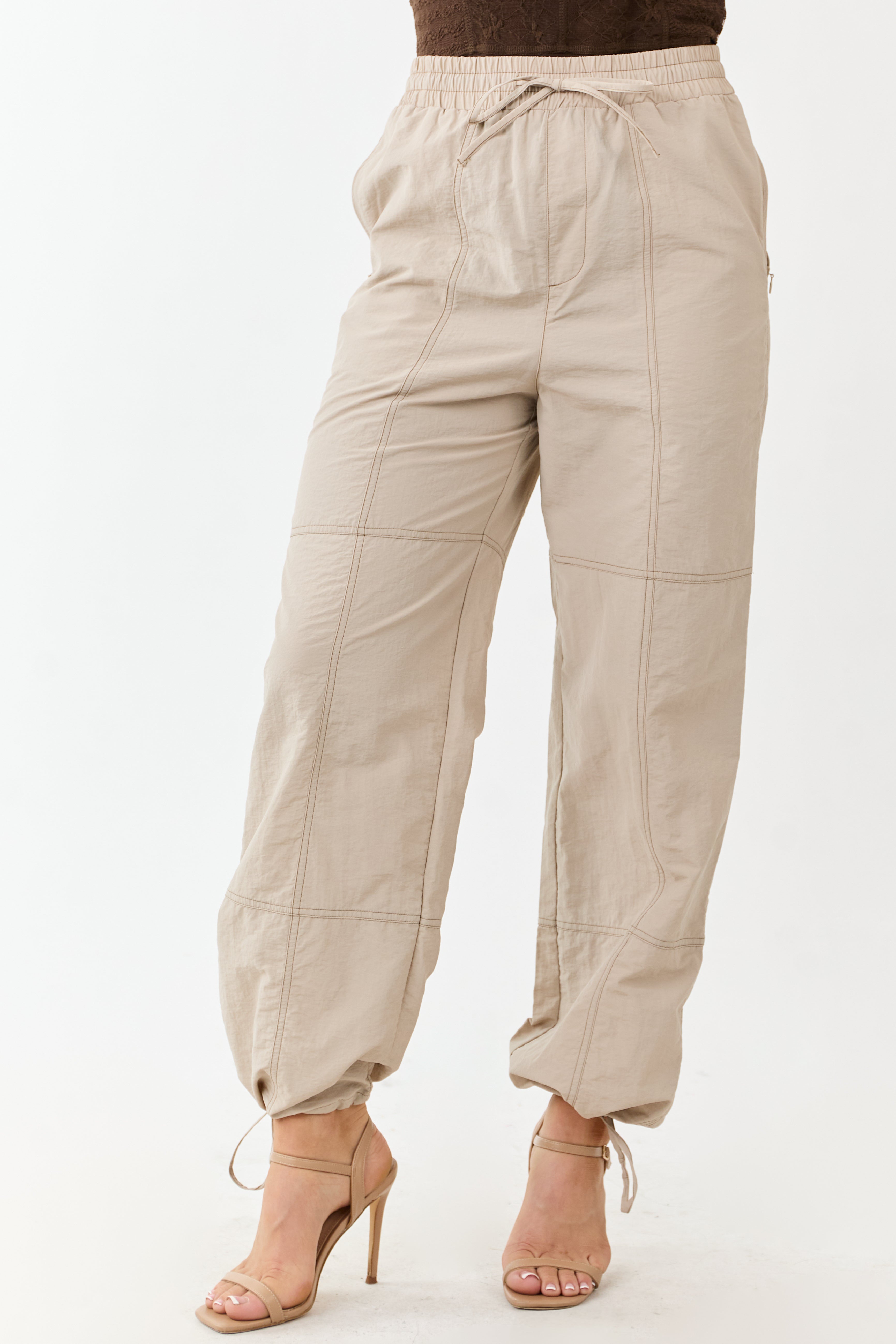 Experience ultimate comfort and style with these almond wide leg pants featuring adjustable drawstring waist, zipper pockets, and chic contrast stitching. Crafted from 100% polyester, these pants offer a smocked waistband and cinching cuffs for a flattering fit. The high-waisted design and lined finish ensure both fashion and functionality. Perfect for casual outings or relaxed days. Embrace the trend!