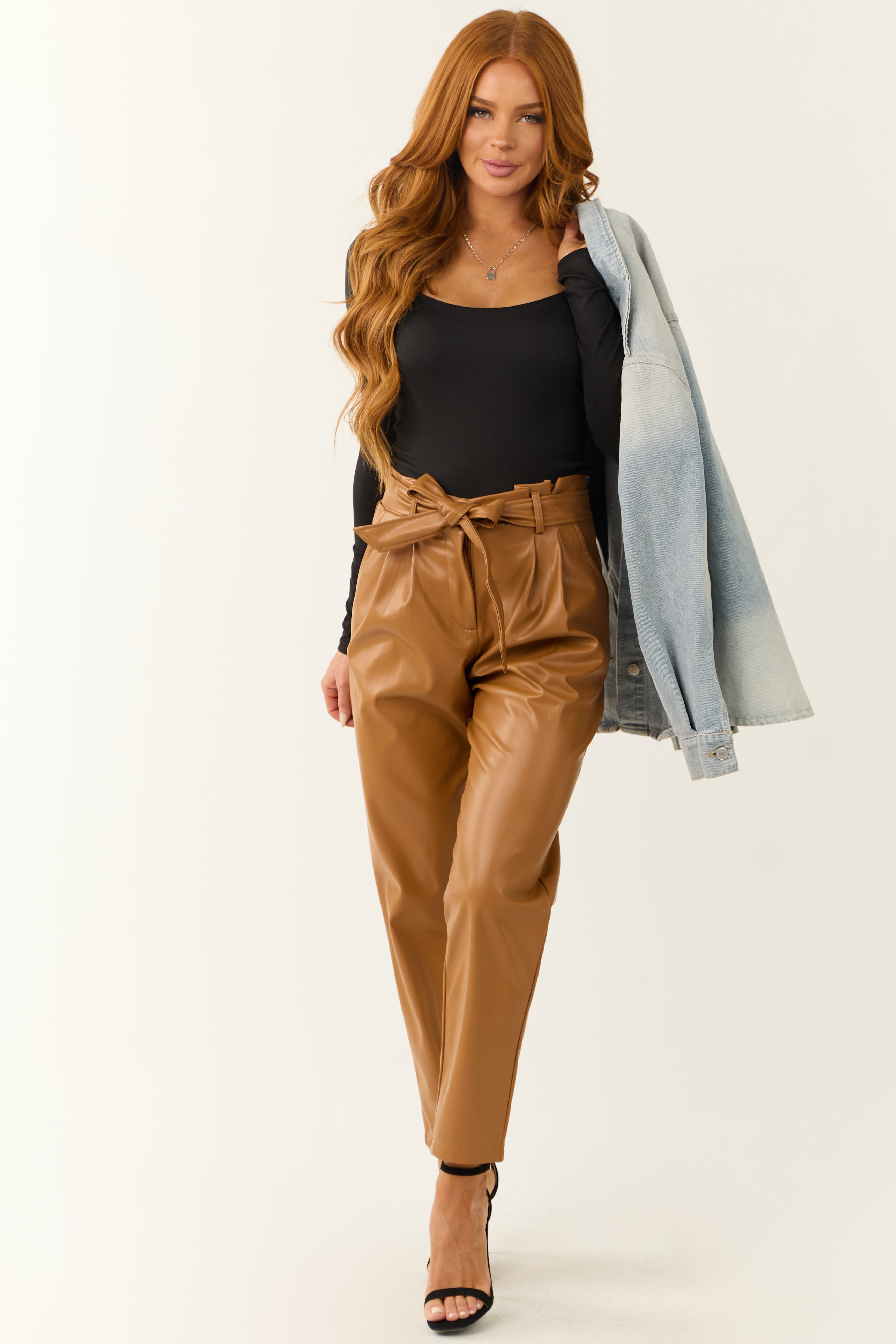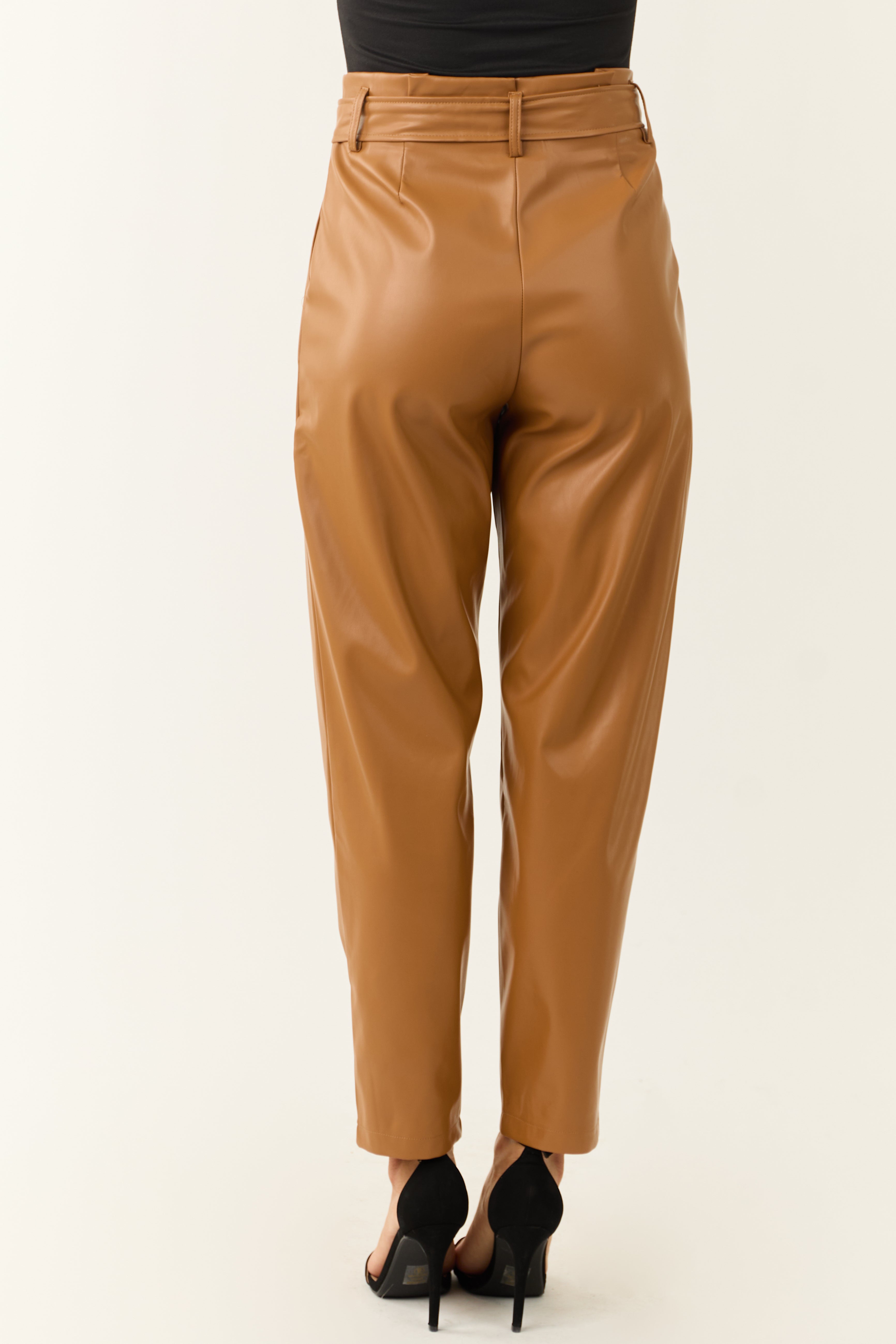 Indulge in the sleek sophistication of these high waist brown faux leather pants. Crafted with a blend of 55% Polyester and 45% PU, these semi-stretchy pants feature a removable waist belt, belt loops, and a gathered waistband for a flattering fit. The zipper fly with hook closure, side pockets, and unlined design add stylish convenience. Hand wash cold, avoid bleach, and line dry for lasting beauty. Available in sizes S, M, and L. Model is wearing size Small. Ideal for day or date night looks.