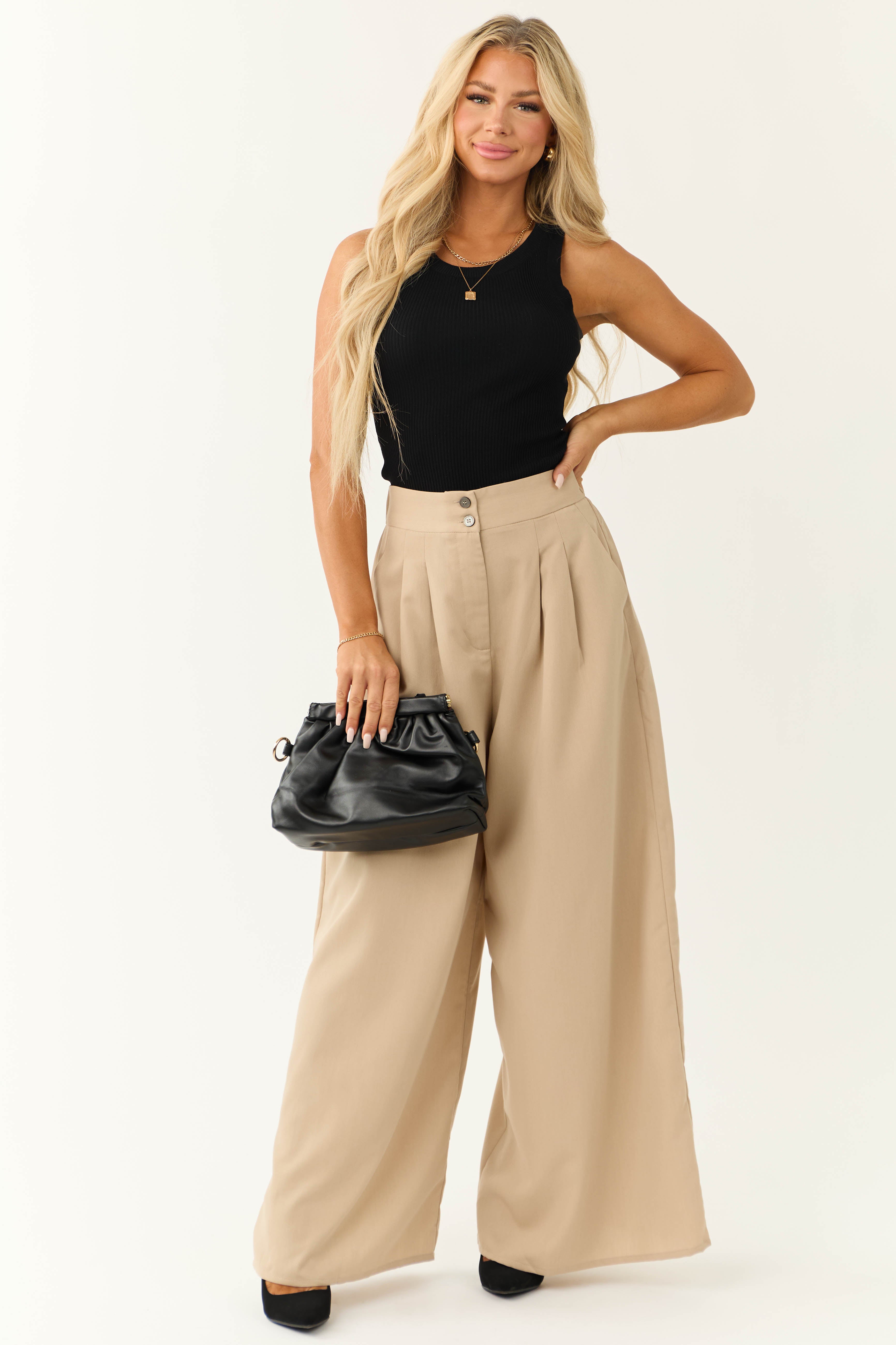 Indulge in style and comfort with our High Waist Brown Wide Leg Trousers. Available in sizes Small, Medium, and Large, these non-stretchy woven trousers feature a pleated design, zipper front with a double button closure, side pockets, and an elastic waistband for a perfect fit. Crafted from 95% Polyester and 5% Rayon, these trousers are ideal for everyday wear. Please note that they require hand washing in cold water to prevent color bleeding. Elevate your wardrobe with these chic trousers today!