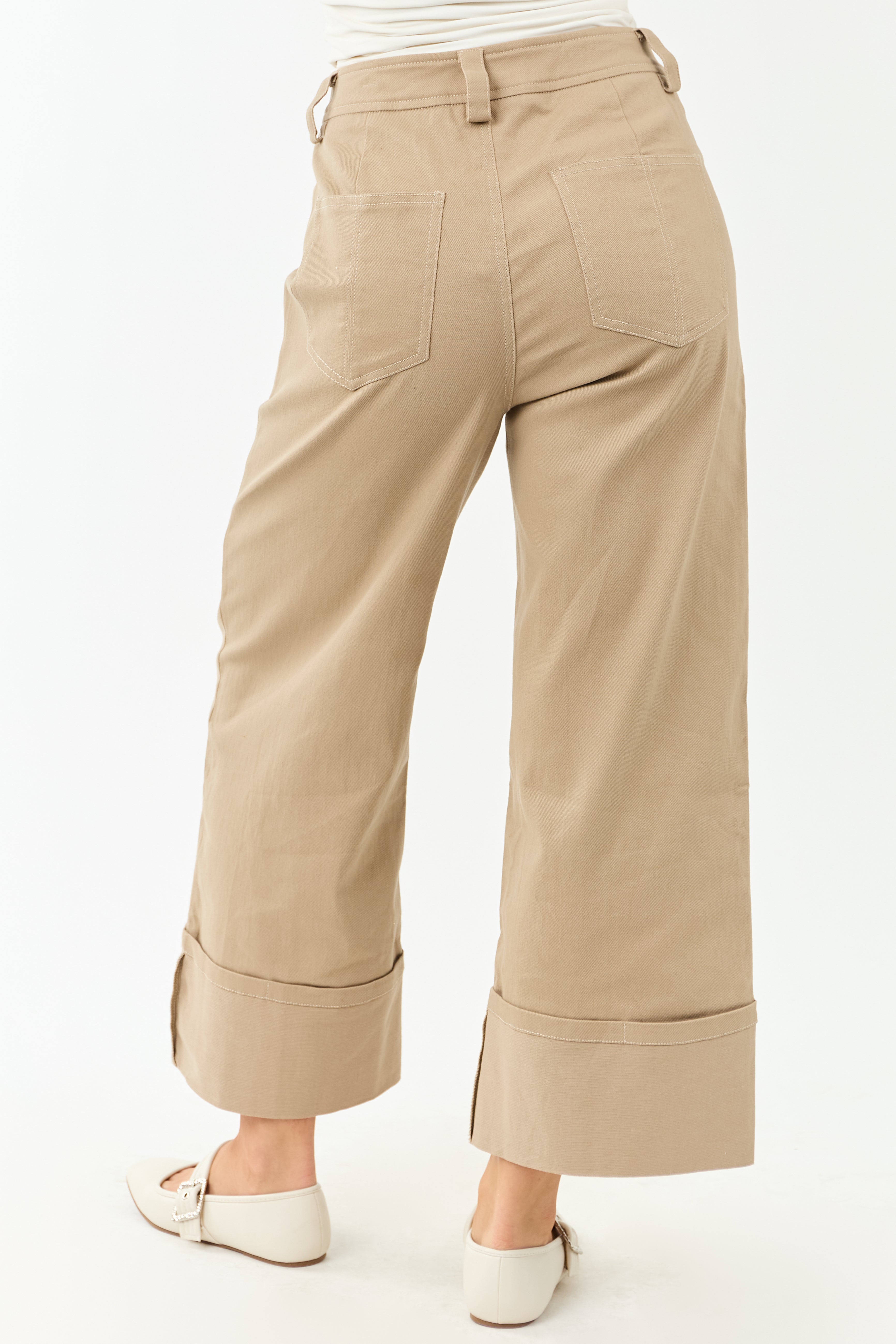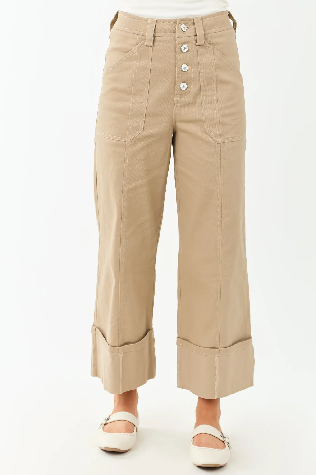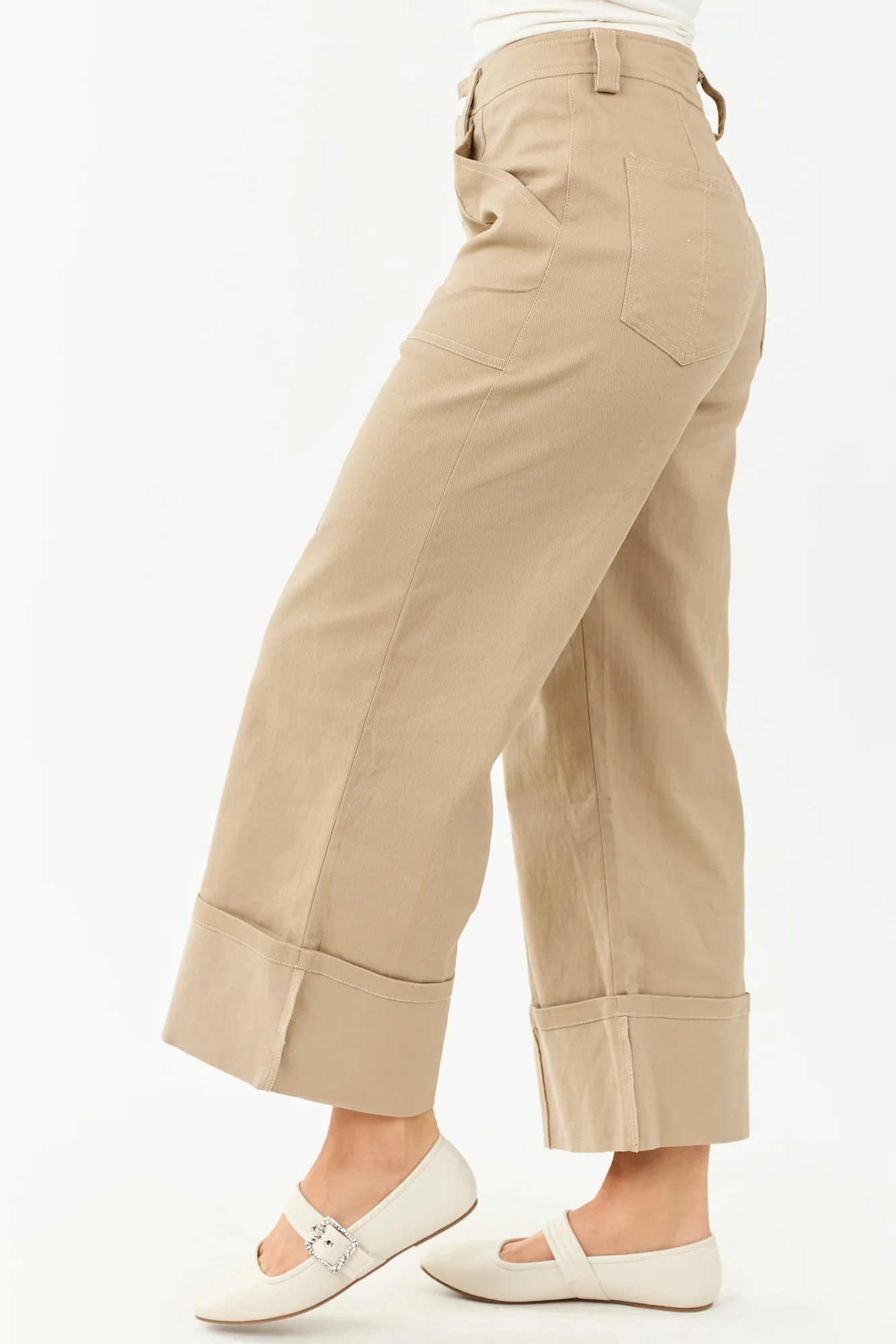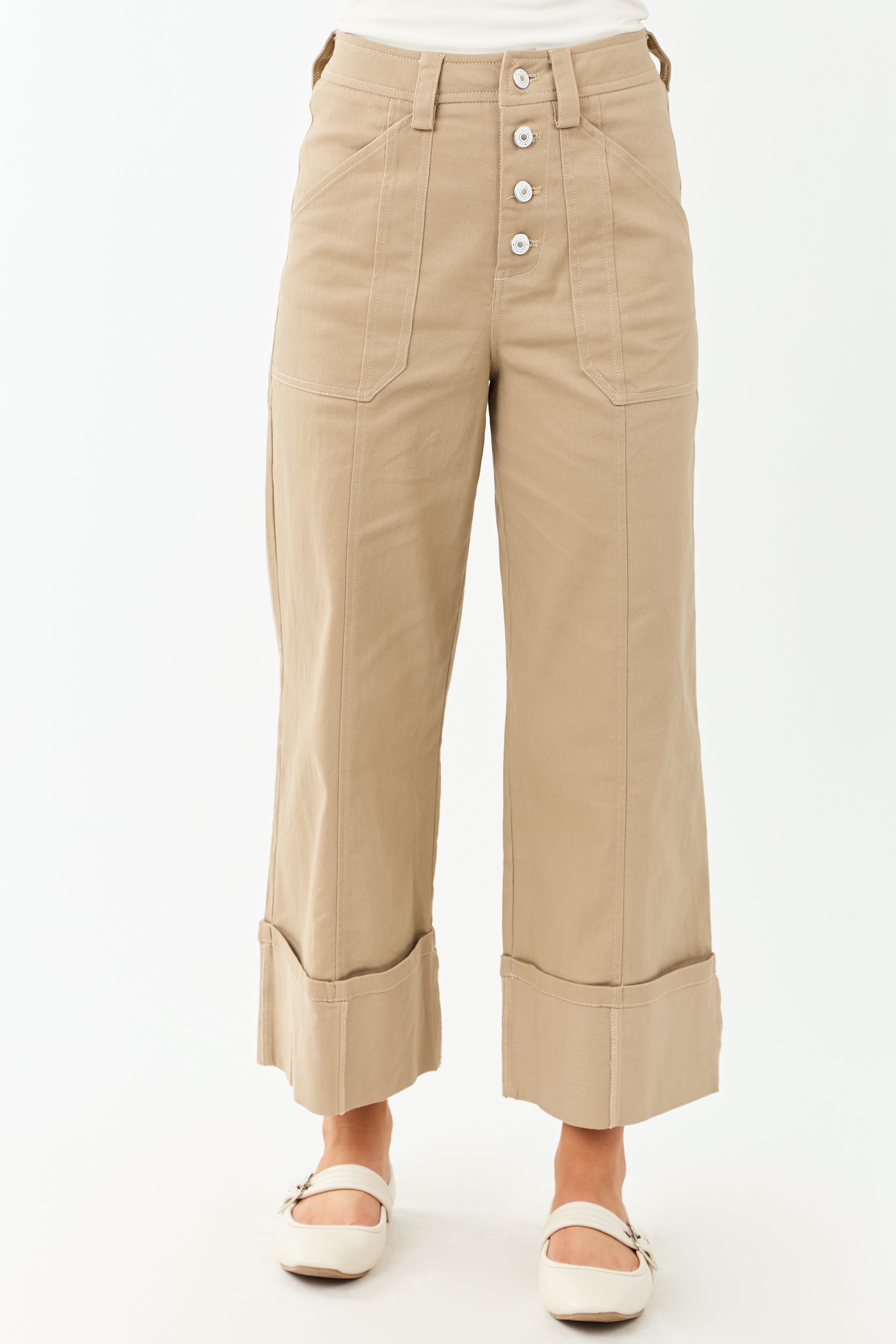 Elevate your style with these latte neutral tone wide-leg pants featuring a high waist design and cuffed hems. Made from a semi-stretchy cotton blend, these flattering trousers offer a comfortable fit with a flowy silhouette. The pants feature a white button fly, belt loops, and four pockets for added convenience. Perfect for various occasions, these pants add a touch of sophistication to your wardrobe. Available sizes: S, M, L.