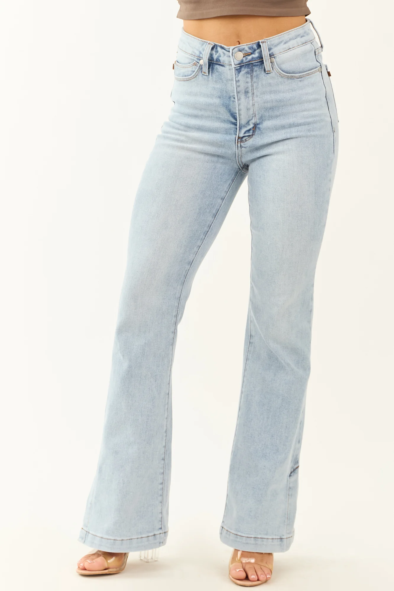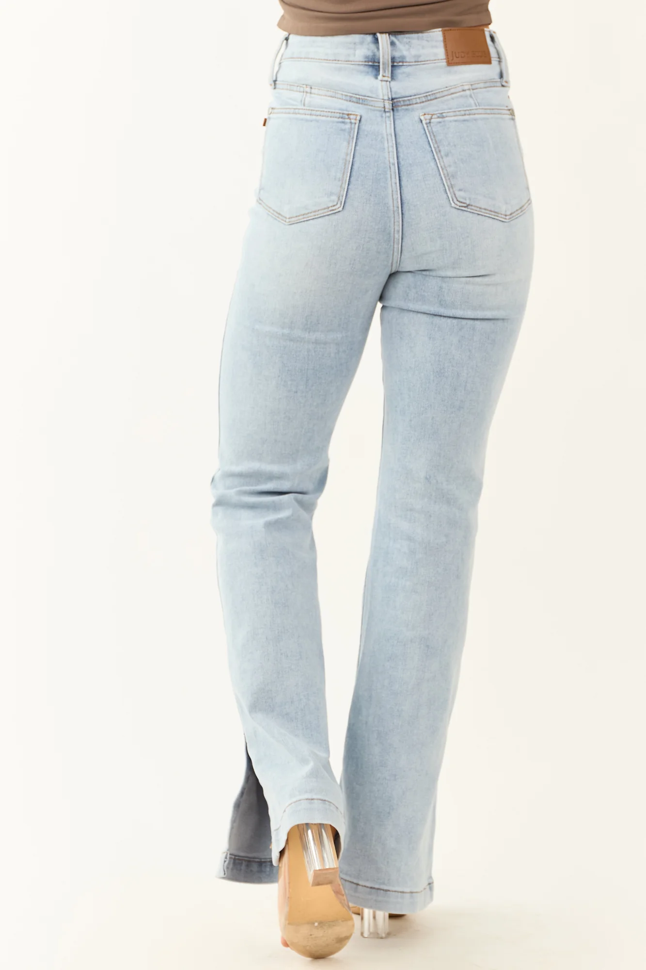 Elevate your style with these on-trend High Waist Bootcut Jeans ! Crafted from semi-stretchy denim for all-day comfort. Featuring a flattering tummy control design, loose waistband with a high rise fit, and a light vintage wash. These jeans offer a stylish side slit hem detail and come with five functional pockets. Whether youre hitting the town or running errands, these jeans are the perfect blend of fashion and comfort. Available sizes: 0/24, 1/25, 3/26, 5/27, 7/28, 9/29, 11/30, 13/31, 15/32