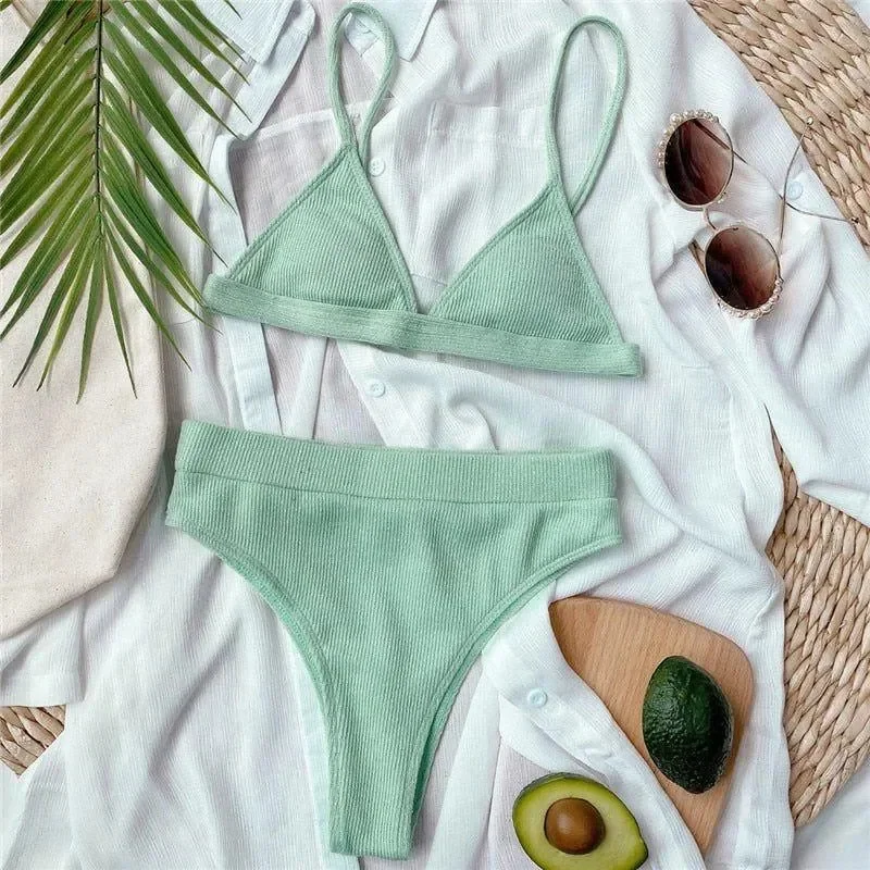 Elevate your beachwear collection with this stylish bikini set, featuring a high-waisted bottom and an adjustable triangle top for a personalized fit. Crafted with a ribbed texture from a blend of Polyester and Lycra, it offers comfort and a modern look, perfect for poolside relaxation or seaside outings. The high waist design creates a smooth silhouette, while the triangle top provides a comfortable fit and wire-free support. This wireless padded bikini effortlessly blends elegance with practicality. Ensuring a complimentary exchange for a different size if needed, this bikini set is an ideal choice for sunny days and beach adventures.