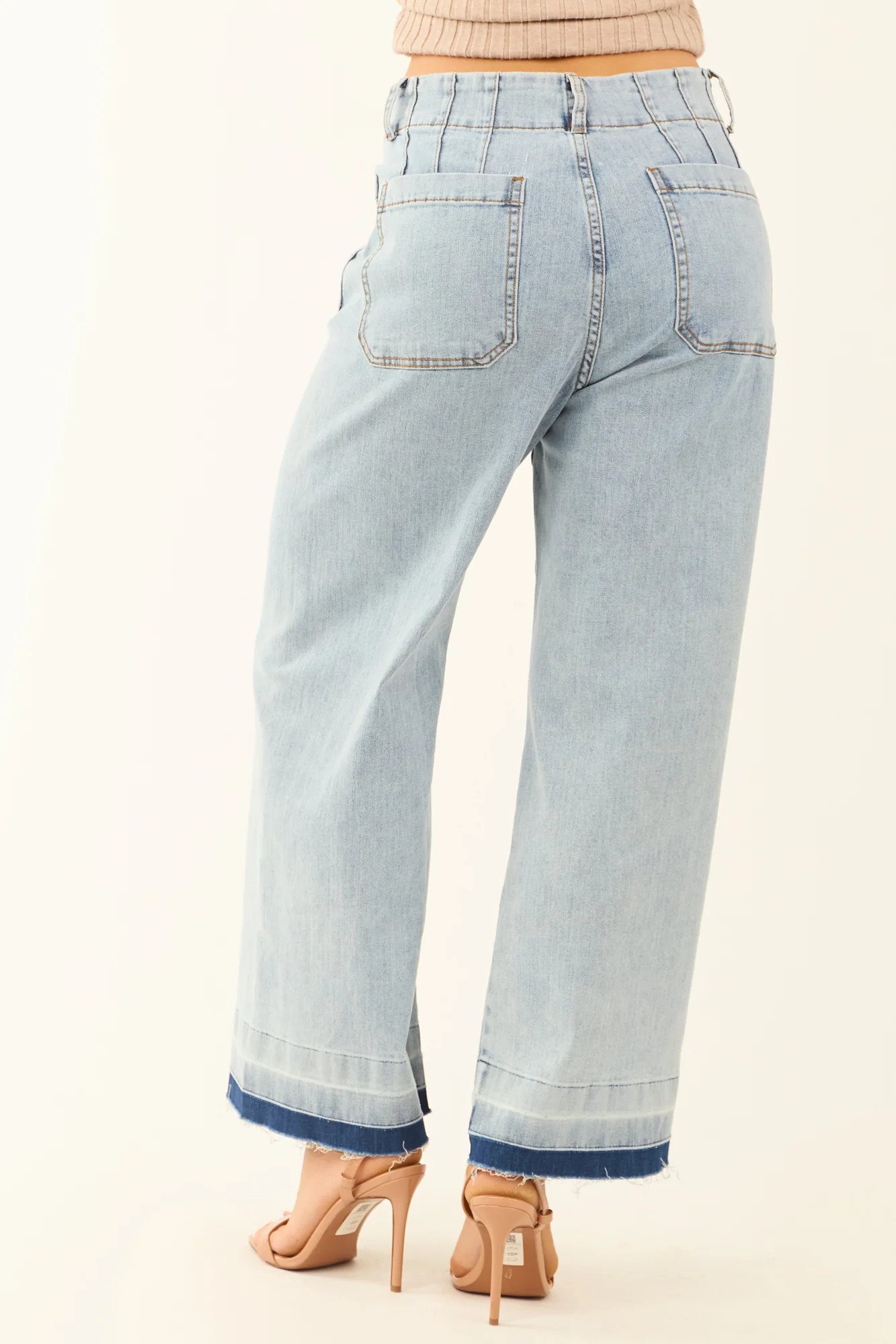 Discover the unique charm of our High Waisted Acid Wash Ombre Denim Jeans. These cropped jeans feature a raw release hem with a dark to light wash ombre effect. Crafted from stretch denim for a comfortable fit, they boast a pleated waist detail, wide leg silhouette, and high-rise design. Elevate your style effortlessly with these imported jeans that are perfect for the spring and summer seasons. Due to the individual dying and washing process, each piece is beautifully unique. Model is wearing a size Small. Waist measurements: S – 28″, M – 30.5″, L – 33″. Inseam: S – 26″, M – 26.5″, L – 27″. Front Rise: 13″, Back Rise: 16″. Material composition: 68% Cotton, 30% Polyester, 3% Spandex.