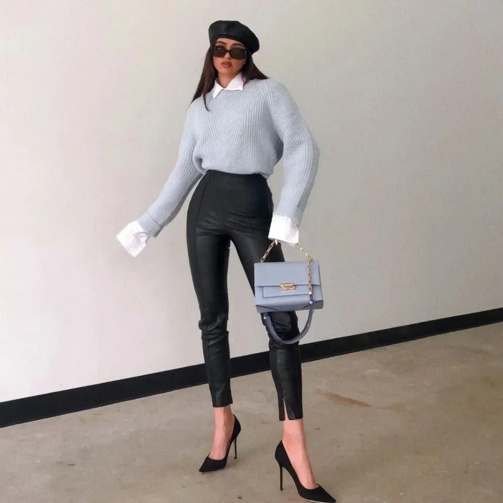 Elevate your style with our High-Waisted Faux Leather Pants in Black. Crafted from premium faux leather for a sleek, modern look, these pants feature a high-waisted design that enhances your silhouette and a smooth texture adding an edgy touch. The flattering fit makes them ideal for any occasion. Versatile, easy to dress up or down, and suitable for casual or formal events, these pants are a wardrobe essential. Step out in style and confidence with our stylish Faux Leather Pants!