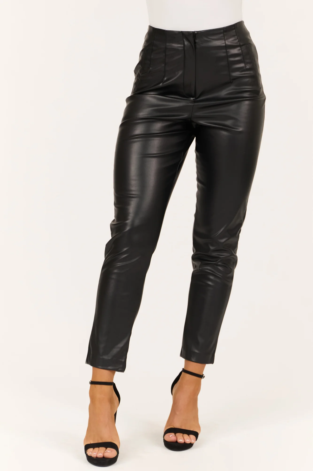 These stylish High Waisted Faux Leather Tapered Pants in Black come in S, M, and L sizes. The waist options are 27″, 28.5″, and 30″ with an inseam length of 27″ each. Crafted from non-stretchy faux leather, these pants feature faux pleated waist details, non-functional front pockets, a zipper fly with hook and bar closure, and a hidden front button closure. Easy to care for, these pants are made of 65% Polyurethane and 35% Polyester. Perfect for a wide range of occasions from casual to formal wear. Hand wash cold, do not bleach, line dry, iron on low heat. Model is wearing a size Small.
