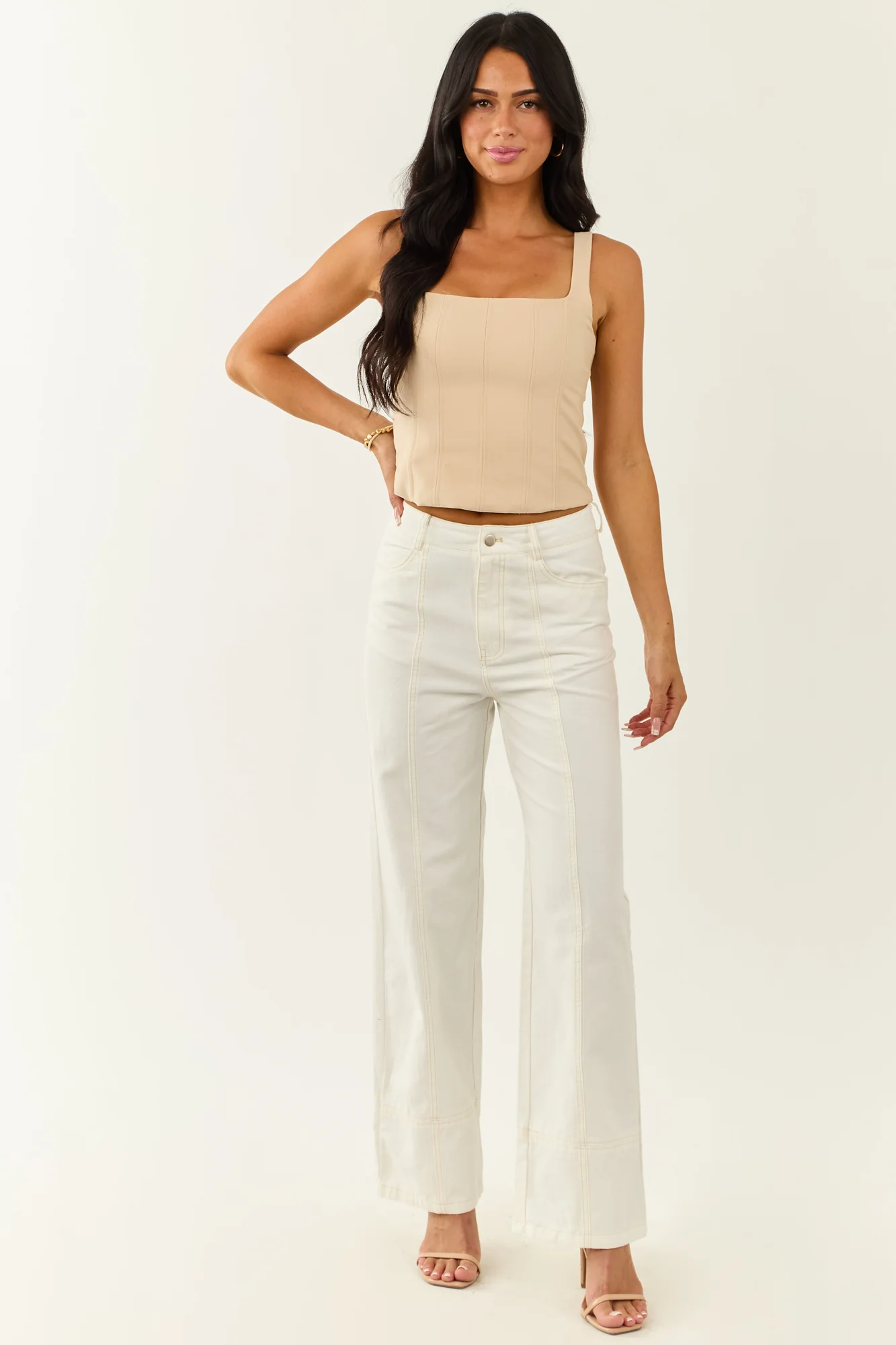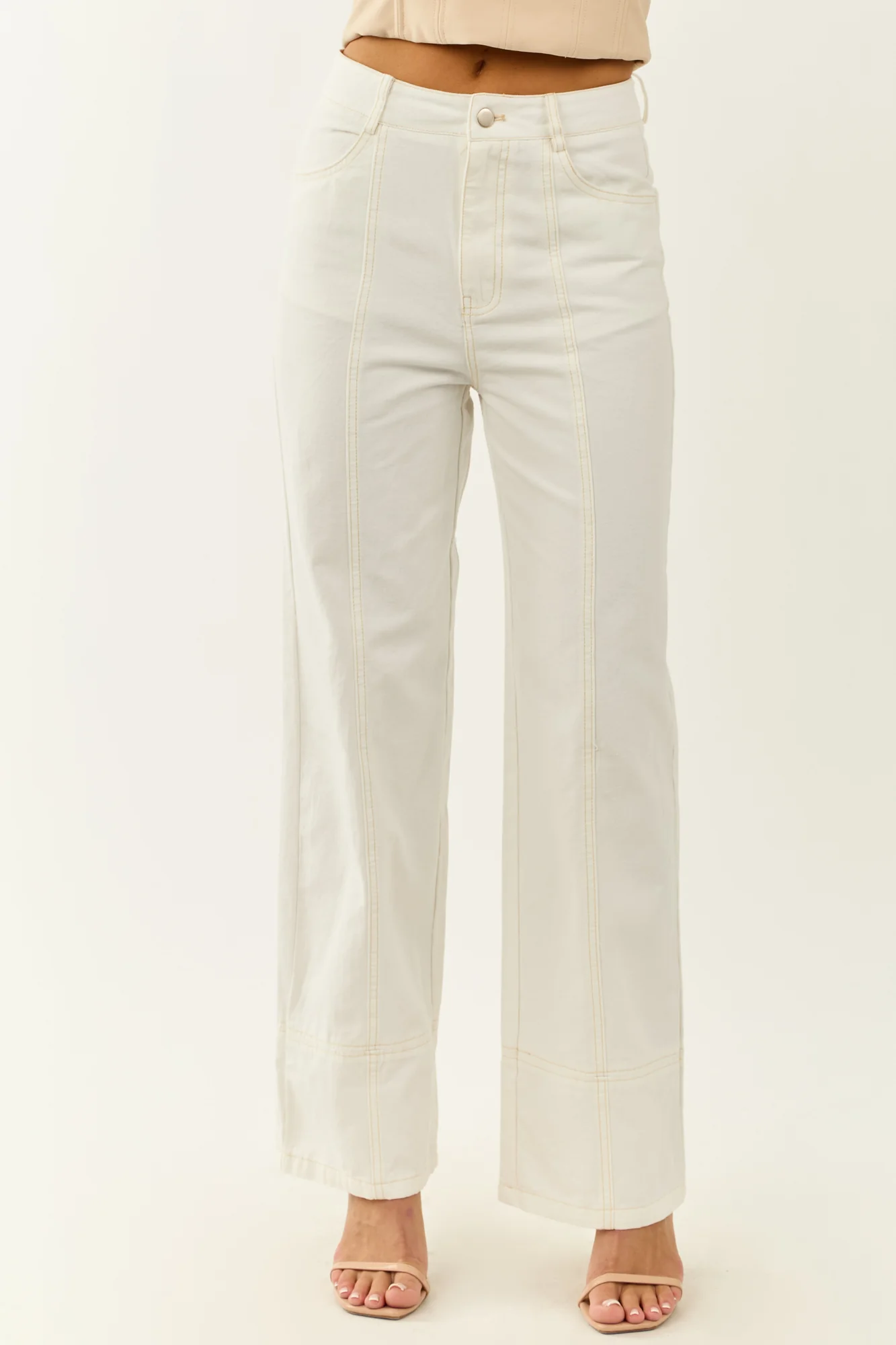 Update your wardrobe with these crisp and classic High Waisted White Straight Leg Cotton Pants . Featuring a non-stretchy denim construction with a slight loose fit, these pants are perfect for everyday wear. The high-rise design and contrast copper stitching add a touch of style to your outfit. Complete with a zipper fly, button closure, belt loops, and convenient front pockets. Made of 100% imported cotton. Stay true to size for the ideal fit. Inseam: 30.