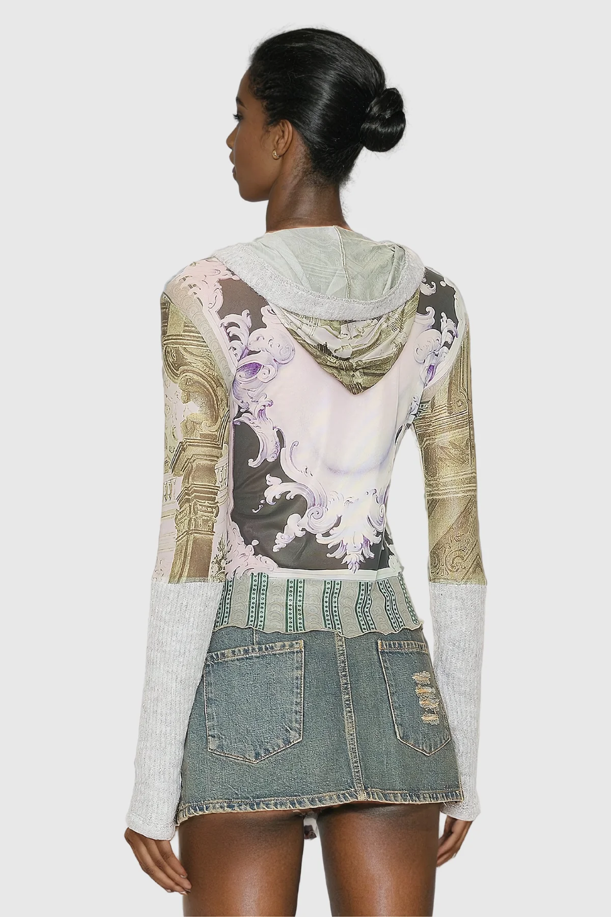 Experience ultimate comfort and style with this top crafted from premium materials. The unique Abcde print design adds a trendy touch, while the flattering bodycon fit accentuates your figure. Stay fashionable and cozy with the added hood for a practical edge. This versatile piece is a wardrobe essential. Material: 50% Polyester, 50% Cotton Stretch Factor: High stretchability Care Instructions: Machine wash gentle cycle. Please note, colors may appear differently due to lighting in images.