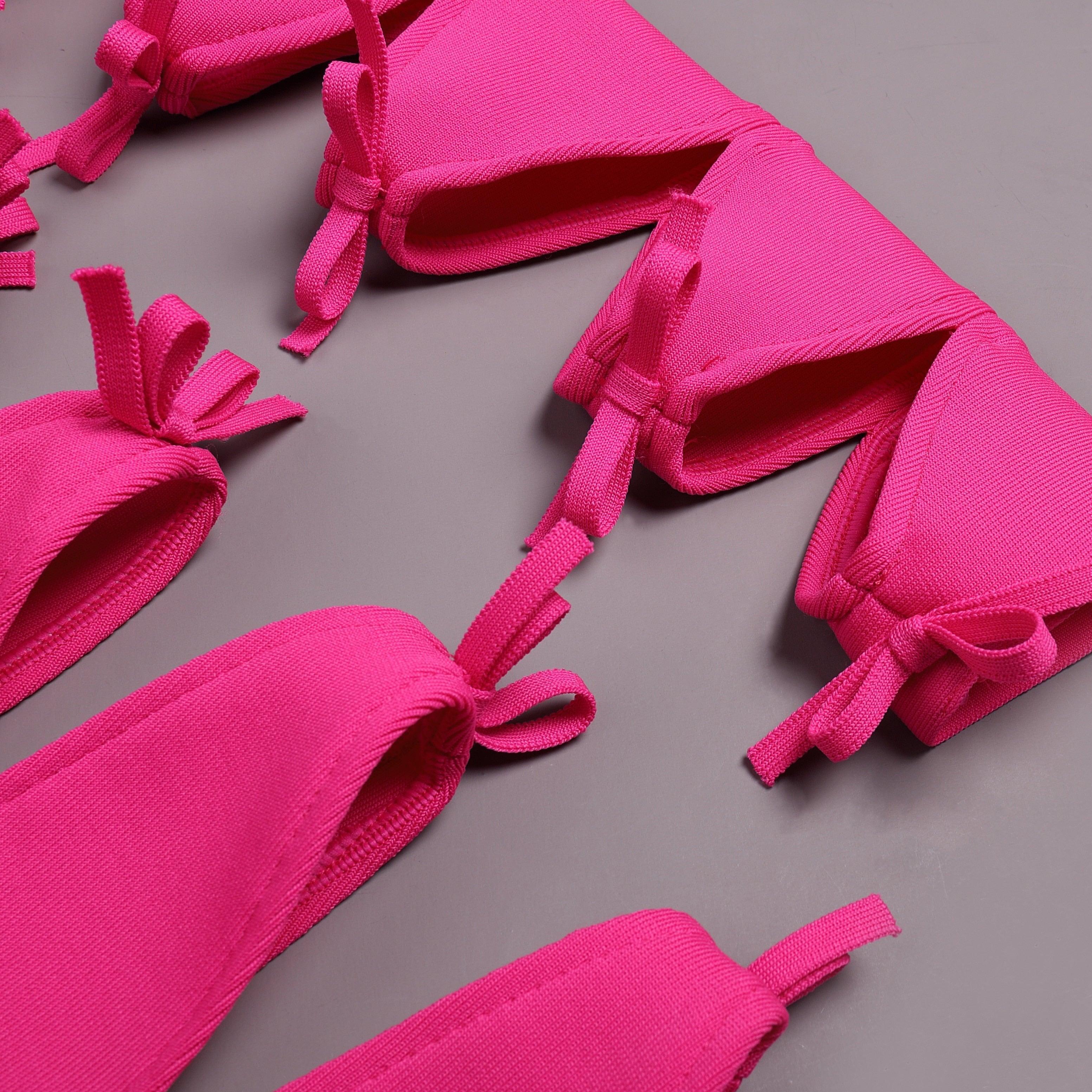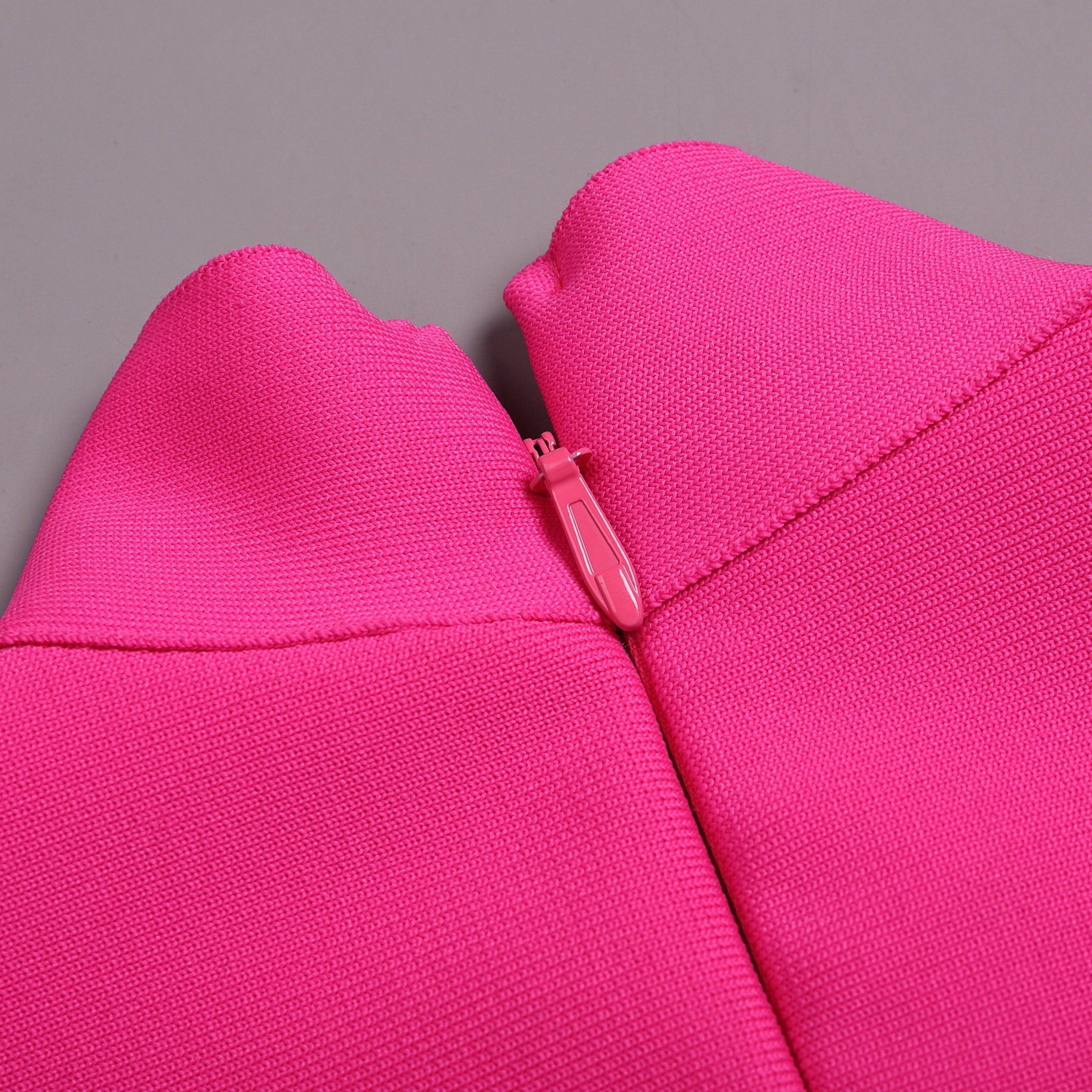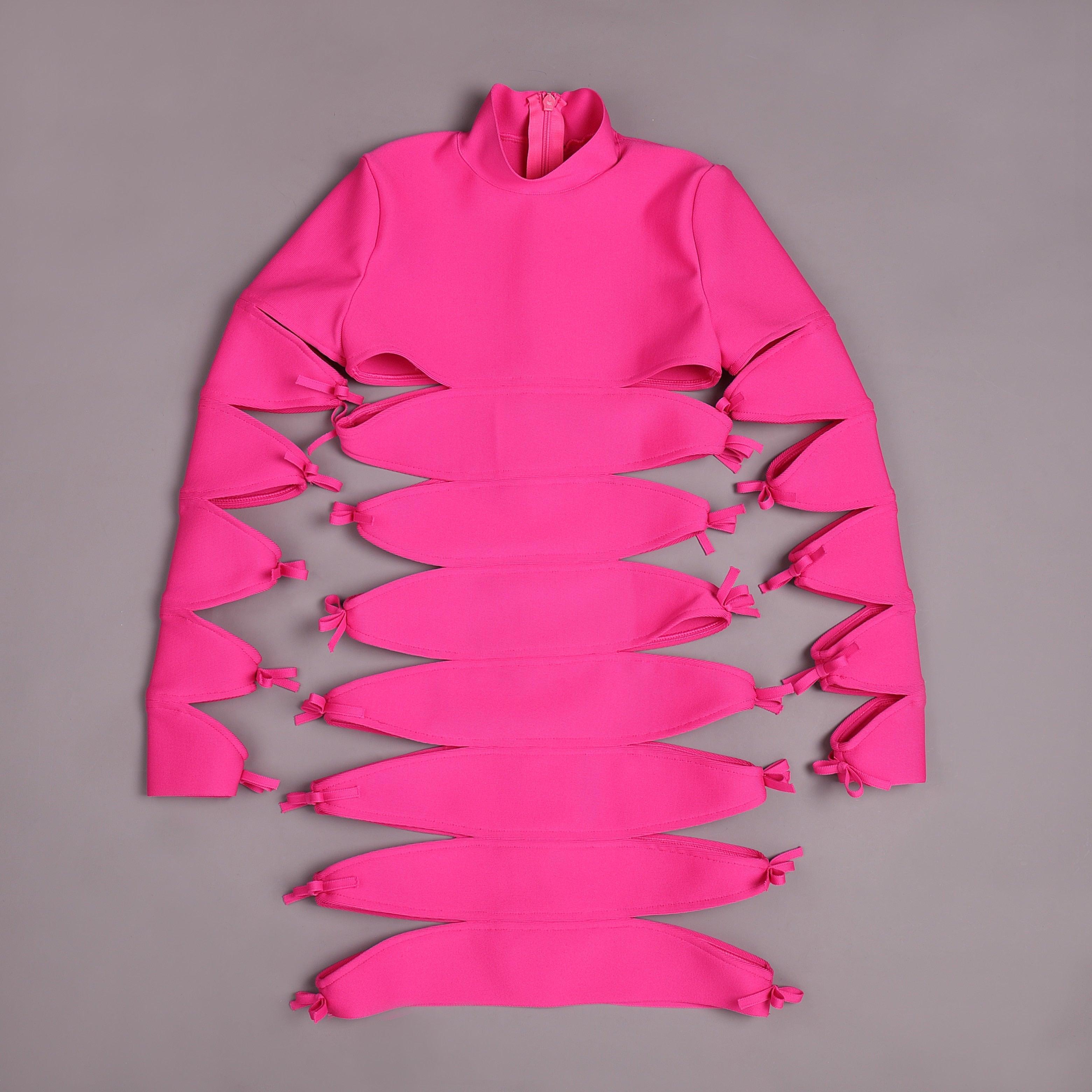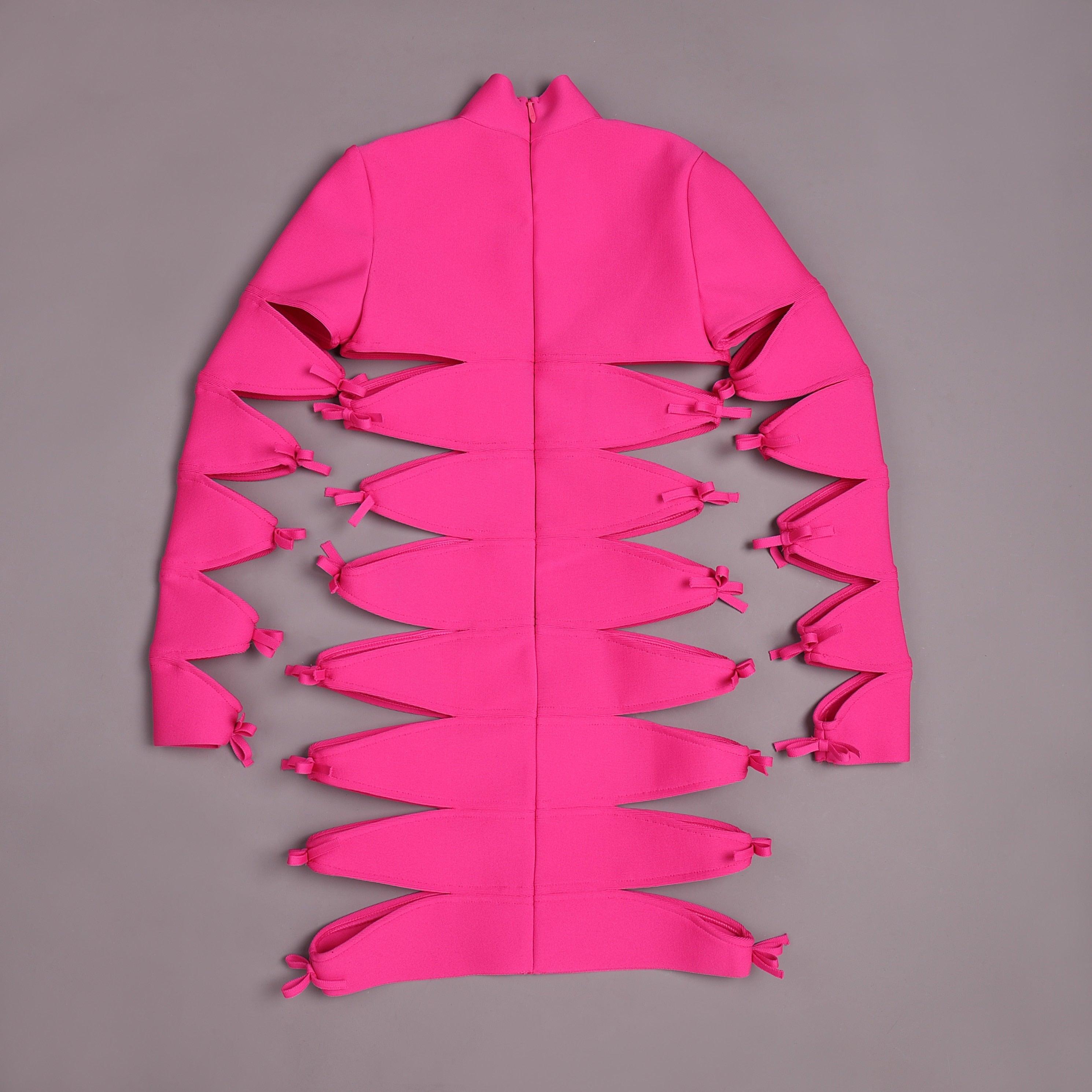 Elevate your wardrobe with this elegant hot pink bandage cutout mini dress. Crafted from satin, polyester, and spandex, this dress features exquisite lace detailing and a stylish high slit. Perfect for special occasions, it combines sophistication with a modern touch. The flowing silhouette ensures a flattering fit, while the intricate lace design adds a refined elegance, making it an ideal choice for glamorous events. Pair with your favorite heels for a polished look. Enjoy complimentary size exchanges if needed.