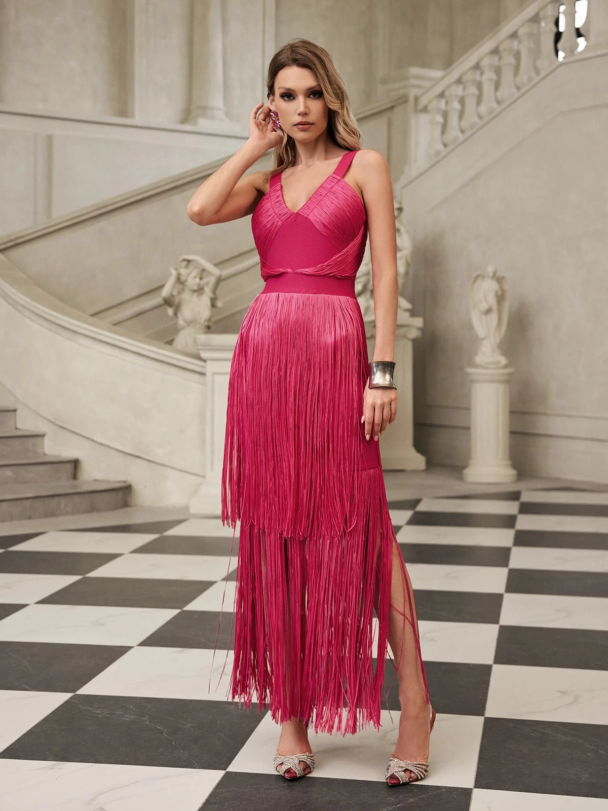Make a striking entrance with the Hot Pink Fringe Bandage Maxi Dress. Crafted from 100% Polyester, this dress features a flattering V-neckline and a figure-hugging bandage design that accentuates your curves with confidence. The playful fringe detailing adds movement and flair, making it perfect for lively events. Elevate your style with this unforgettable dress. It offers a slight stretch with an invisible zipper at the back for easy wear. Dry clean only. Model pictured is wearing size S.
