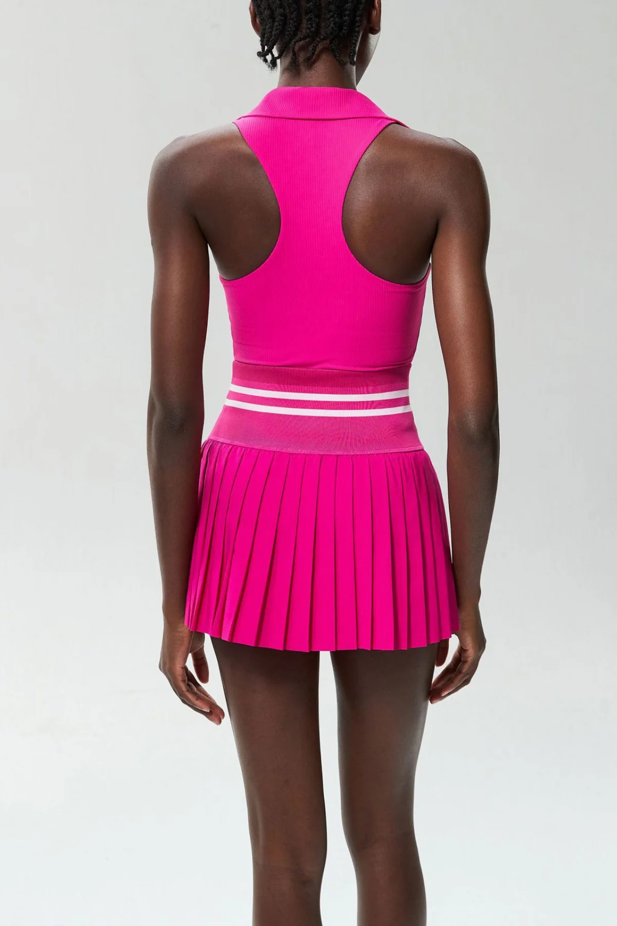 Elevate your style with the Hot Pink Lapel Sleeveless Ruch Stripe Skirt Set. This stunning ensemble features a flattering lapel neckline and a ruched stripe skirt in vibrant hot pink. Perfect for any occasion, this versatile set offers both elegance and comfort. Whether you dress it up or down, its a wardrobe essential. Crafted from 50% Polyester and 50% Cotton with a slight stretch for a perfect fit. Care: Gentle machine wash. Note: Color may vary due to lighting. Explore this chic essential now!