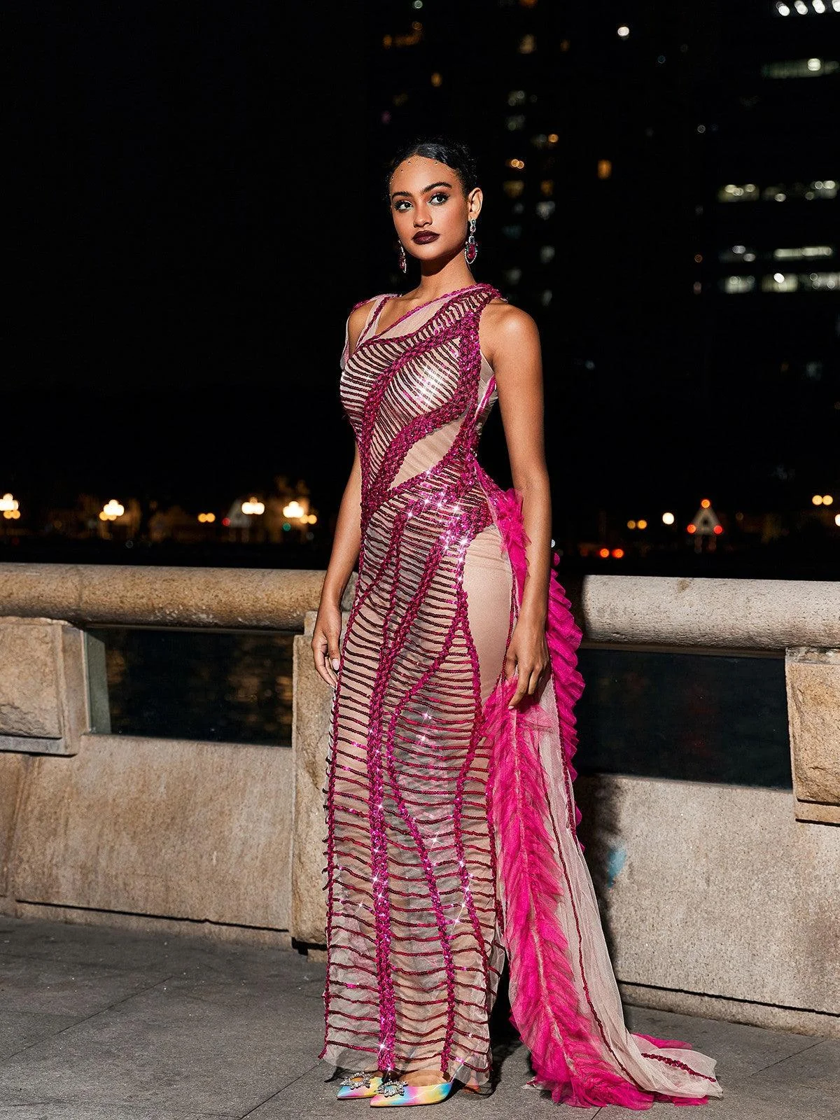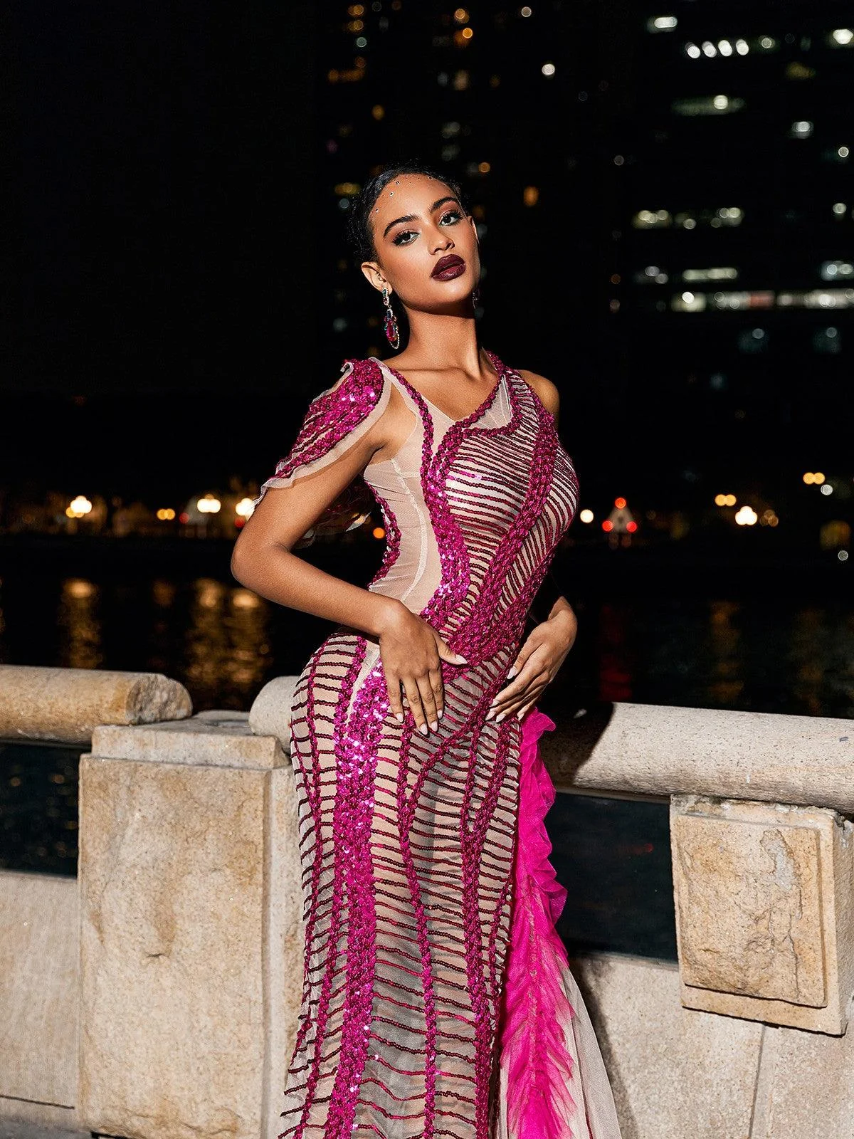 Make a stunning statement at any special occasion with this Hot Pink Sequin Mesh Draped Dress. Crafted with flowy mesh fabric, embellished with sparkling sequins, and featuring a unique draped design with cutout detailing, this dress ensures you stand out. The invisible zipper closure and non-stretch polyester material offer comfort and style in one. Dry clean only. Please note: Color may vary due to lighting. Model wears size M.