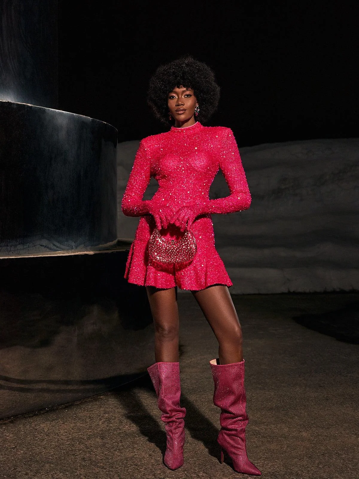 Make heads turn with this stunning Hot Pink Sequin Mini Dress paired with elegant Velvet Gloves. The eye-catching sequined pattern and tight-fitting design ensure you step into the spotlight in style. Experience slight stretch comfort and an invisible zipper closure for an easy fit. Dry clean only. Please note: Color may vary slightly due to lighting. Model is wearing size S.