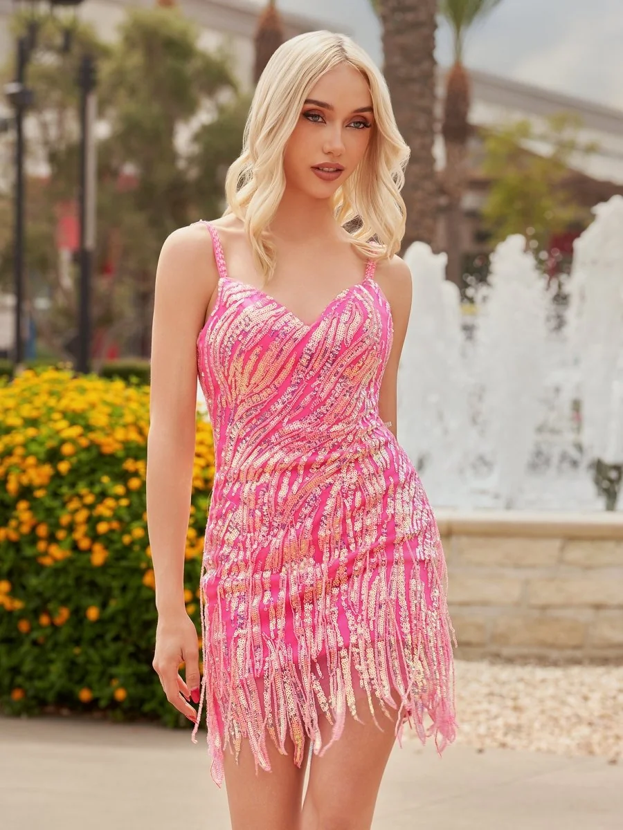Get ready to shine in the spotlight with this hot pink sequined sheath mini dress. The V-neckline and sleek silhouette bring allure, while shimmering sequins create a dazzling effect. Playful tassels add movement and fun, perfect for dancing. Features a lace-up back for a secure fit. Ideal for cocktail and party occasions. Discover the perfect balance of glamour and comfort. Suitable for any fashionable event. Bring out your unique charm with this striking dress. A must-have piece for your wardrobe collection. Stand out with style and elegance.
