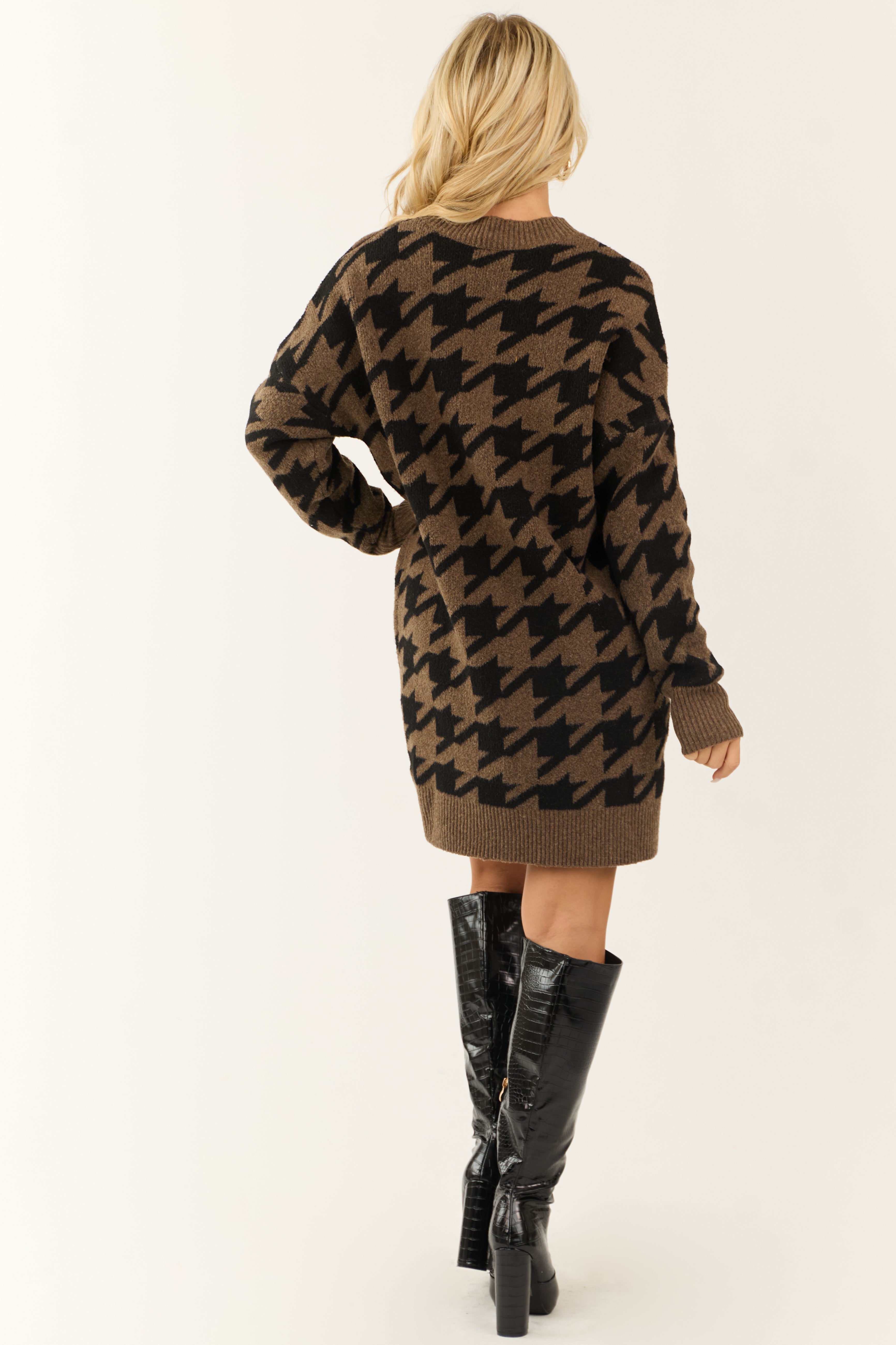 Indulge in the cozy elegance of our Houndstooth Rib Knit Short Sweater Dress in Black and Coffee. This shift-fit dress features a high neckline, long sleeves, and ribbed trim for a stylish look. Crafted with stretchy rib knit fabric for comfort and a flattering silhouette. Pair it with your favorite belt for added charm (belt not included). Hand wash cold, lay flat to dry. Ideal for winter dates or daytime outings. Available in sizes S, M, and L.