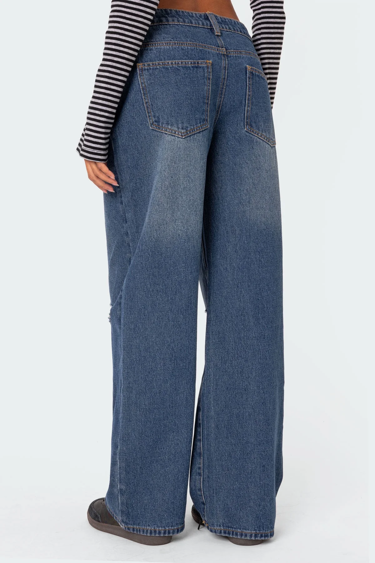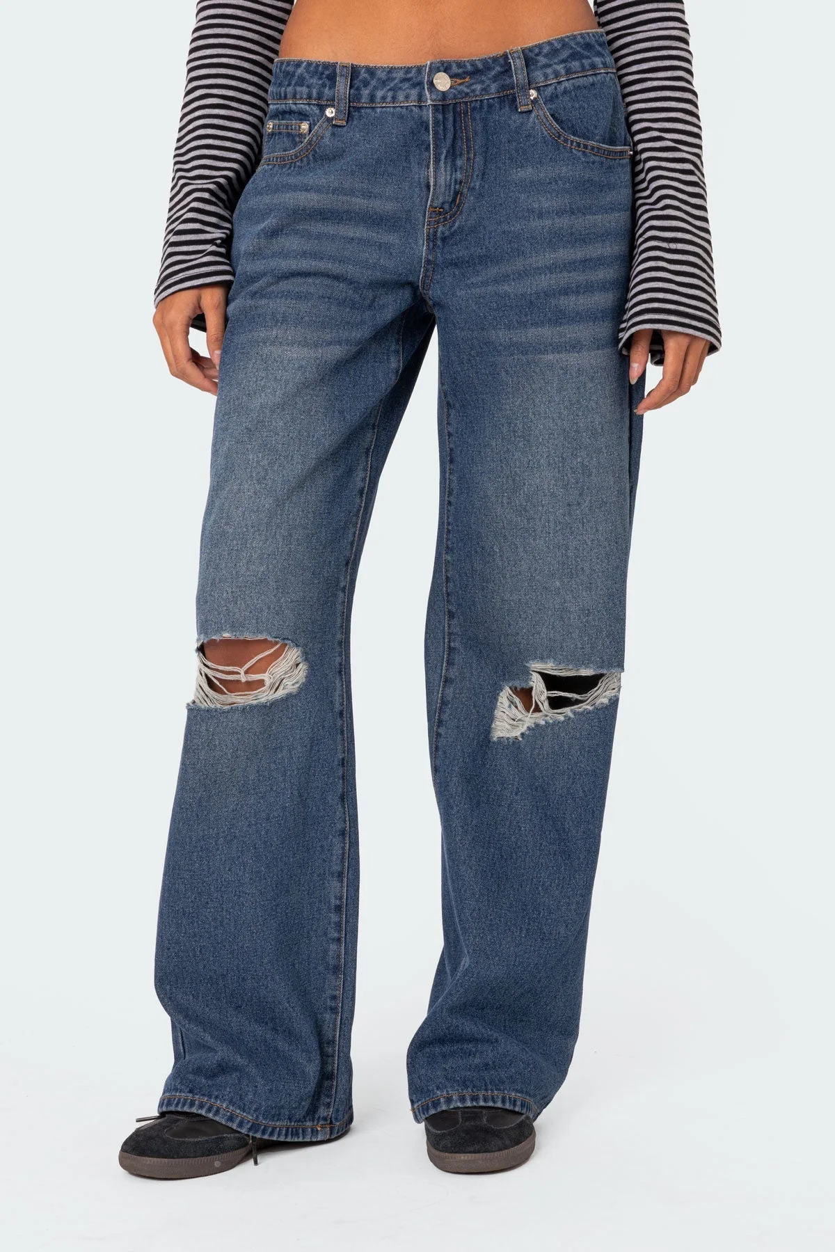 Upgrade your wardrobe with our Indigo Distressed Denim Low Rise Jeans. These jeans feature a low rise waist, loose fit, and stylish distressed knee design. Made from 100% cotton, they are perfect for any casual occasion. Available in sizes XS to XL. Wash with similar colors for easy care.