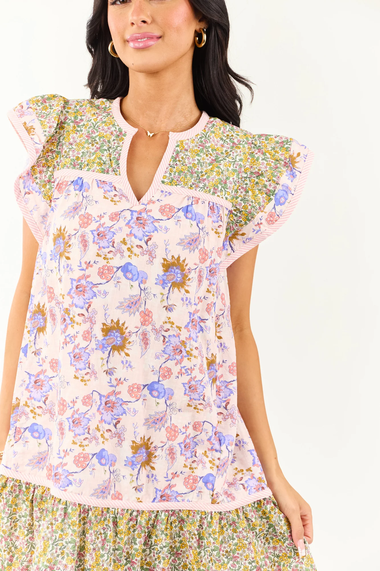 Embrace the charm of a bouquet in motion with this flowy tent fit mini dress adorned with mixed florals, ruffle cap sleeves, and contrast stripe trims. Made of a non-stretchy cotton blend in shades of Indigo, Mauve, Coral, Marigold, Jade, and Cognac. This dress is perfect for sunny days and outdoor gatherings. Garment specifications for size small: Bust – 38 inches, Length – 34 inches. Lined with 100% Polyester, contrast made of 100% Cotton for a stylish look. Imported and available in sizes XS to XL.