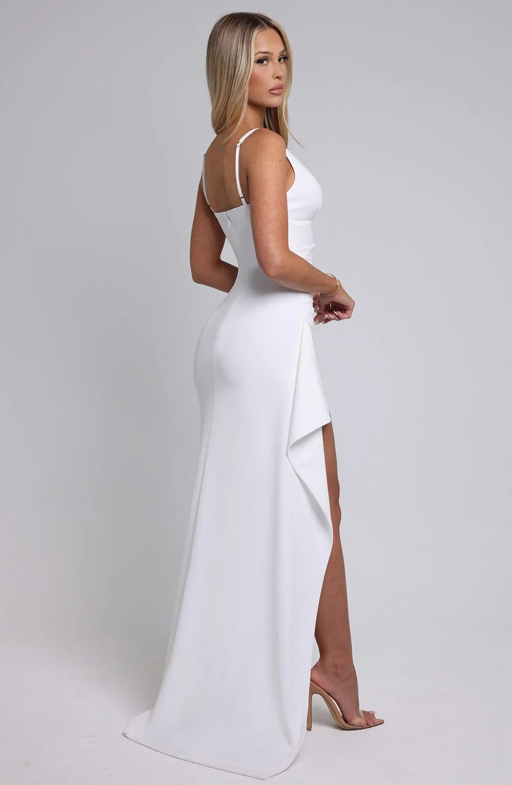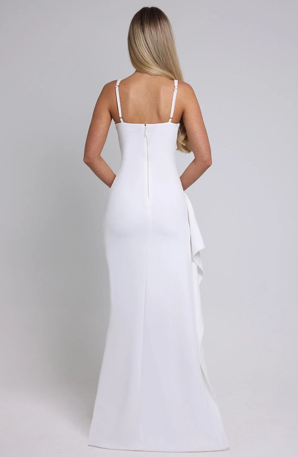 Elevate your style with our Ivory Asymmetric Pleated Maxi Dress made from luxurious premium crepe fabric. This plunging design features adjustable straps, draped thigh-high split, and body-hugging fit. Stay comfortable and chic at any formal event. Enjoy the confidence of a perfect fit. Fully lined for added quality and comfort. Add a touch of elegance to your wardrobe with this stunning dress. Find your ideal size from our range of XS to XXL.