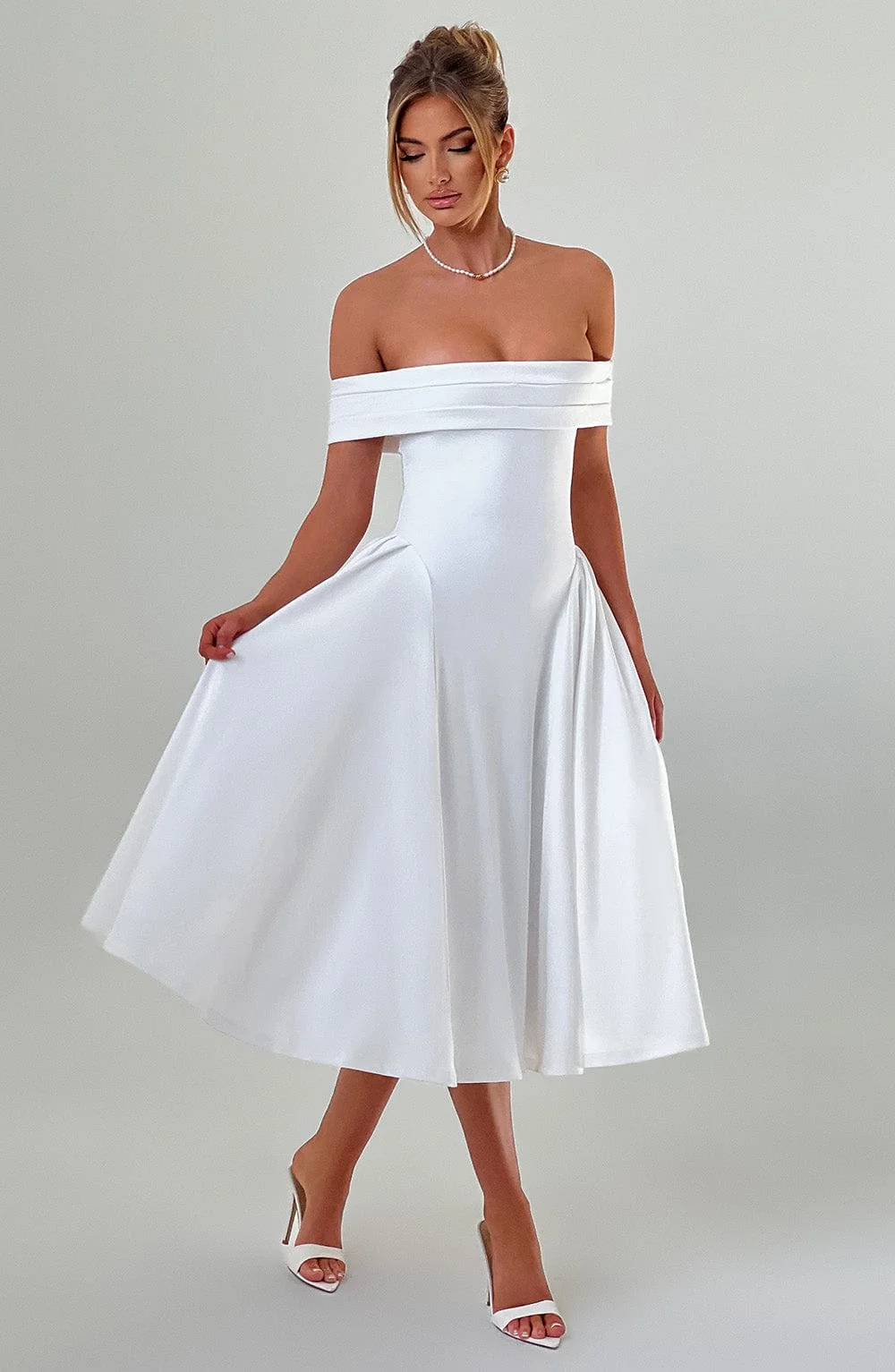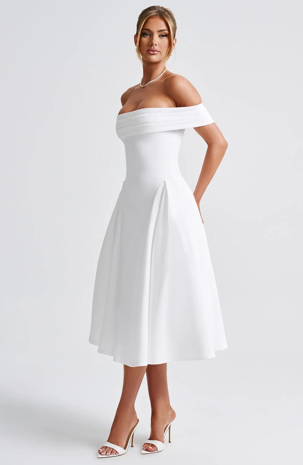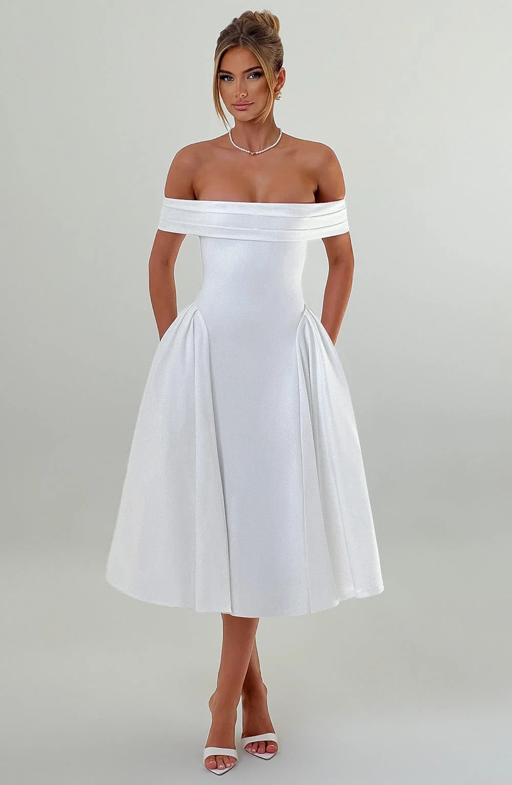 Ivory Bardot Neckline Midi Dress – Premium Stretch Crepe Fabric