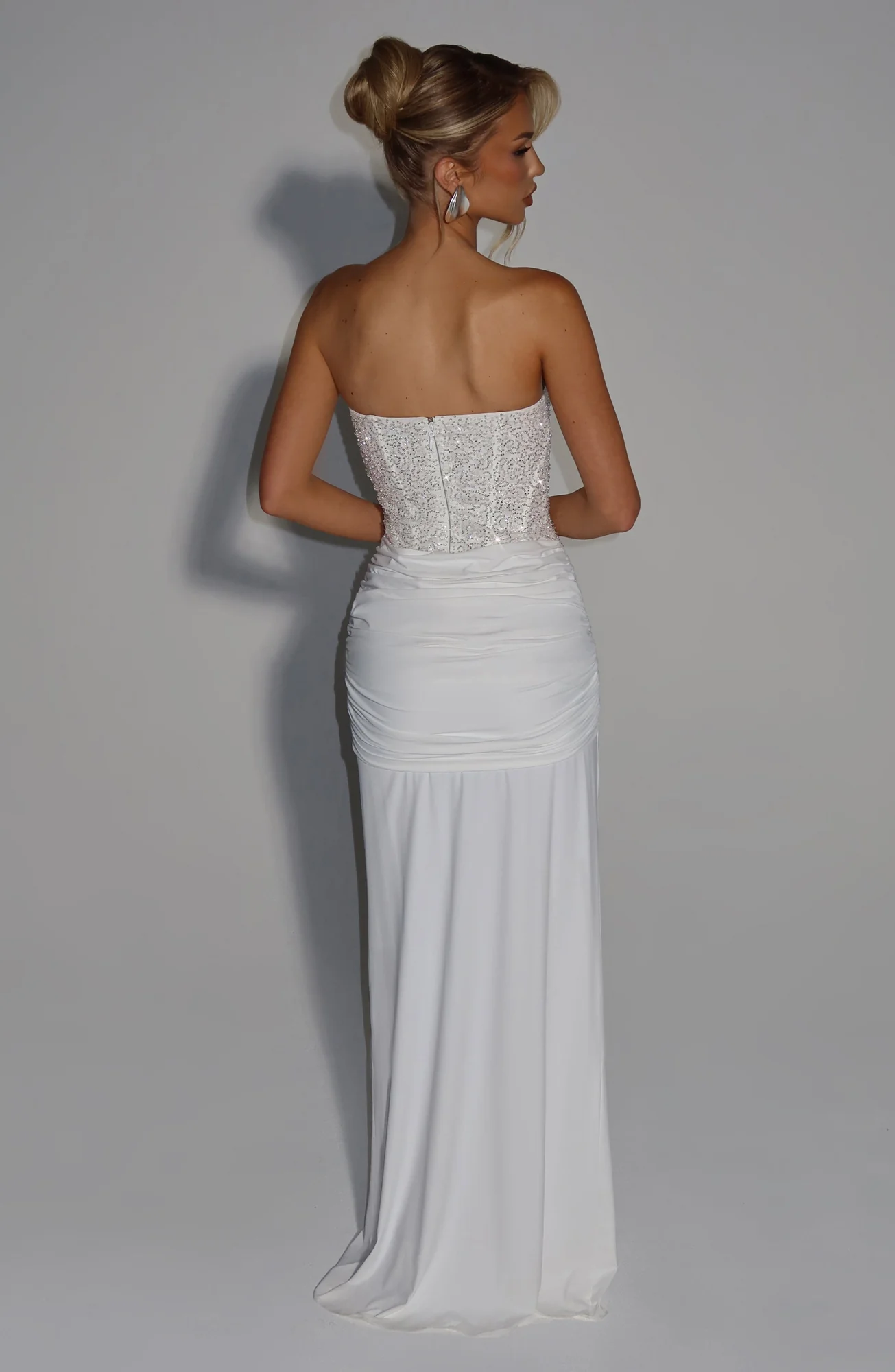 Indulge in the elegance of the Ivory Beaded Mesh Bodice Maxi Dress featuring a sleek slinky skirt, strapless design with structured boning and underbust wiring for support and shape. Enjoy pleated tie details, a draped back overlay, underwired cups, padding, tightly gathered panels, and an invisible zipper closure. Perfect for bridal parties, special occasions, and evening events. Complete the look with the Sybil Scarf (sold separately). Embrace luxury with this meticulously crafted dress.