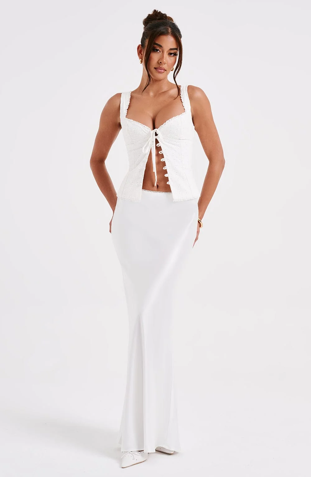 Discover the elegance of the Ivory Bias Cut Maxi Skirt crafted from premium non-stretch satin. This classic and chic piece sits higher on the waist, featuring a scalloped trim for a sophisticated touch. The skirt is cut on the bias to provide a graceful drape over your body, while the invisible zipper ensures a seamless finish. Elevate your style with this versatile piece, perfect for any occasion. Color: Ivory. Length: Maxi. Available sizes: XXL, XS, L, XL, S, M.