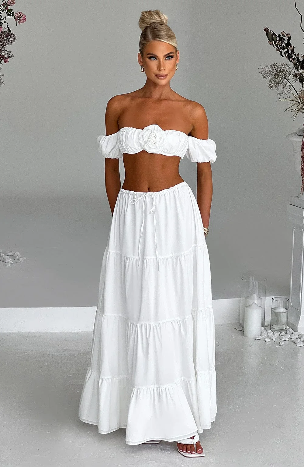 Experience the bohemian elegance with our Ivory Bohemian Tiered Maxi Skirt, crafted from a crisp white cotton blend for brunching on balmy days. This maxi skirt offers a relaxed, tiered design with a tie detail, perfect for a carefree and stylish look. Elevate your outfit by pairing it with the Carmen crop top for the ultimate feminine ensemble. Enjoy the loose, comfortable fit and the elegant maxi length. The fabric is non-stretch, ensuring a perfect silhouette. Ideal for various occasions such as parties, daytime gatherings, or bridal events. Embrace the boho chic style effortlessly. Model in the image is wearing size XS. Explore the versatility of this beautiful skirt today!