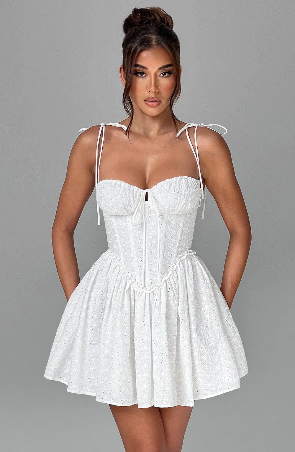 Indulge in the delicate beauty of the Ivory Broderie Anglaise Corset Mini Dress. Crafted from premium cotton, this dress features a figure-enhancing boned bodice with underwired cups, exquisite tie details, and a feminine full skirt. Perfect for garden parties, date nights, and special occasions. Elevate your style effortlessly with this alluring dress adorned with lace-up back and adjustable straps. Make a statement with this mini-length attire. Model wears XS. Feel confident and stylish in this one-of-a-kind piece.