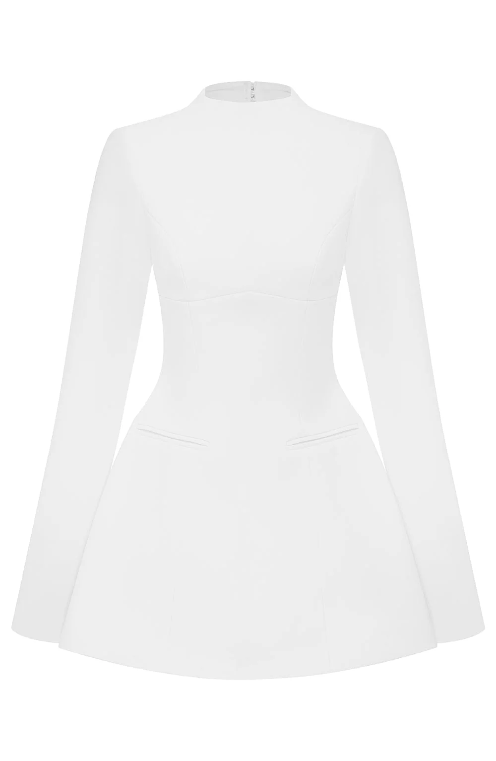 The Ivory Bubble Hem Mini Dress offers a chic style for the new season. Made from premium crepe, this dress features long sleeves, a high darted neckline, keyhole cut out detail, welt pockets, and an invisible zip. Ideal for various occasions like parties or weddings. Feel sophisticated and fashionable in this beautifully crafted dress. Embrace the elegance of this piece while enjoying the comfort it provides all day long. The model pictured is wearing a size XS. Elevate your wardrobe with this timeless classic. Available in sizes XXL, XS, S, M, L, XL.