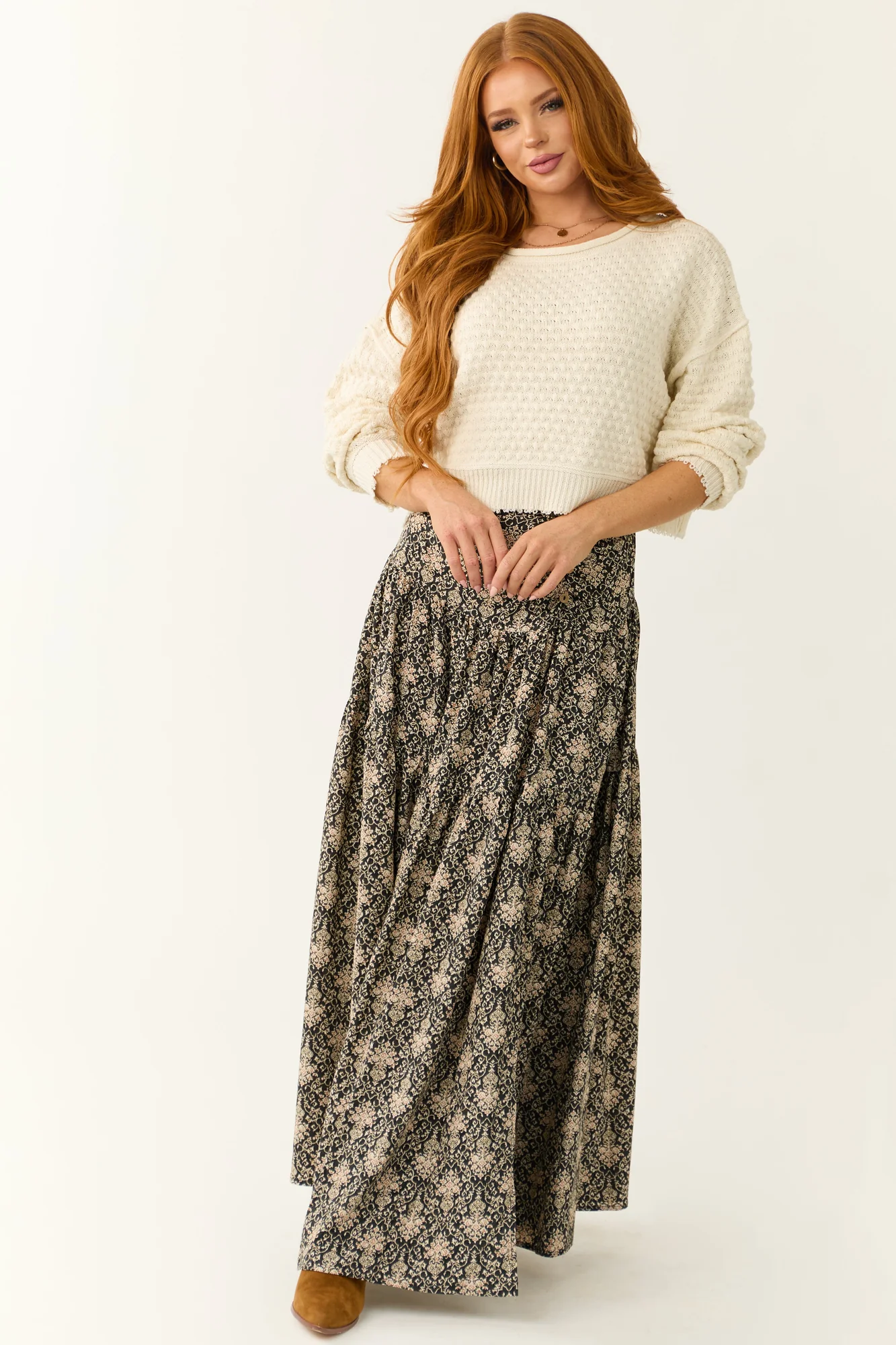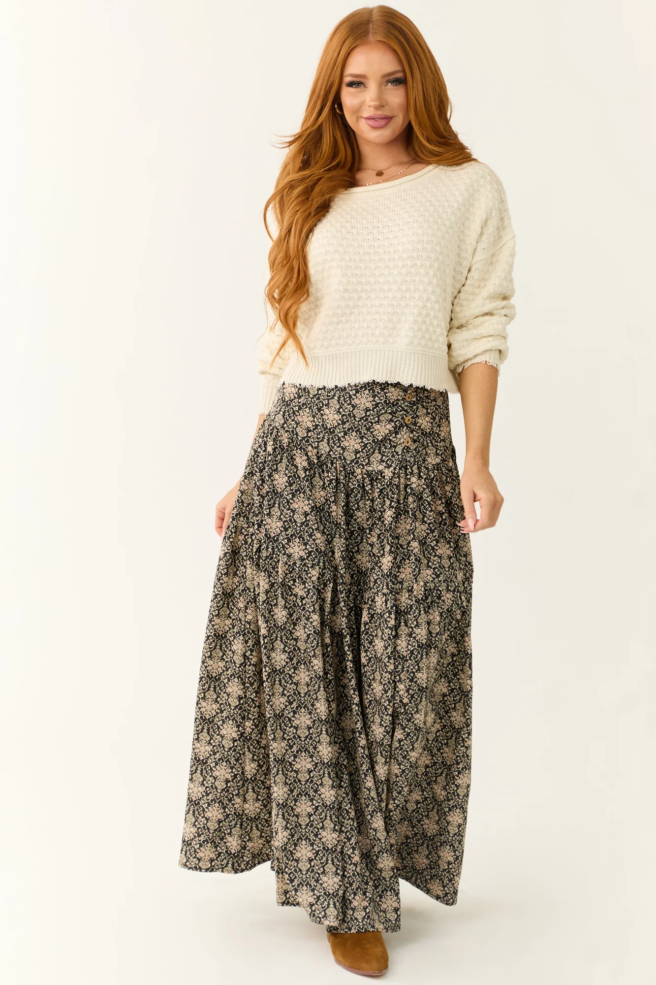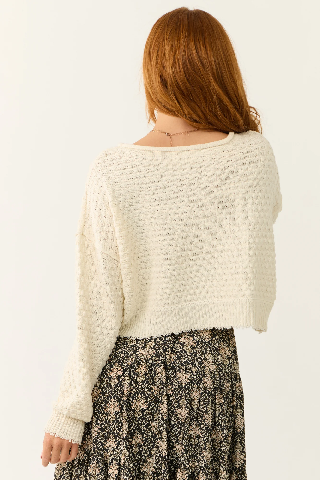 Stay cozy and stylish with our Ivory Cable Knit Sweater! This soft and stretchy bramble knit sweater features a classic boat neckline, long sleeves, drop shoulder design, raw hemline, and cuffs for a relaxed yet chic look. Enjoy all-day comfort in this unlined sweater made of 60% Cotton and 40% Acrylic. Perfect for any occasion, whether its a daytime outing or a romantic date night. Hand wash with cold water, dry flat, and avoid ironing. Available in sizes S, M, and L. Model is wearing a size Small. Model’s Profile: Size 1, Height 55″, Bust 31″, Waist 24″.