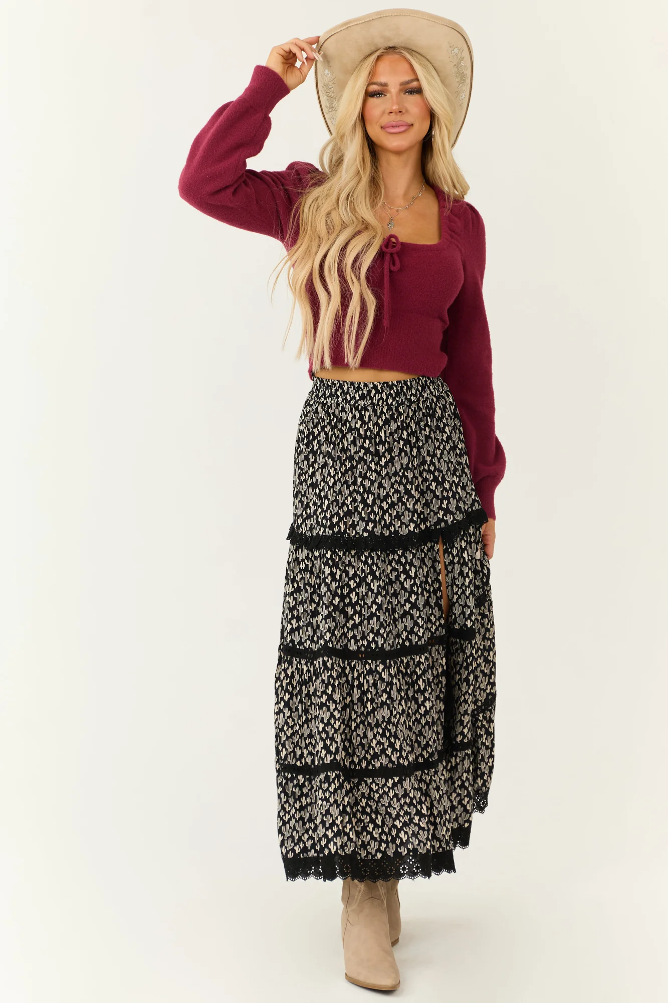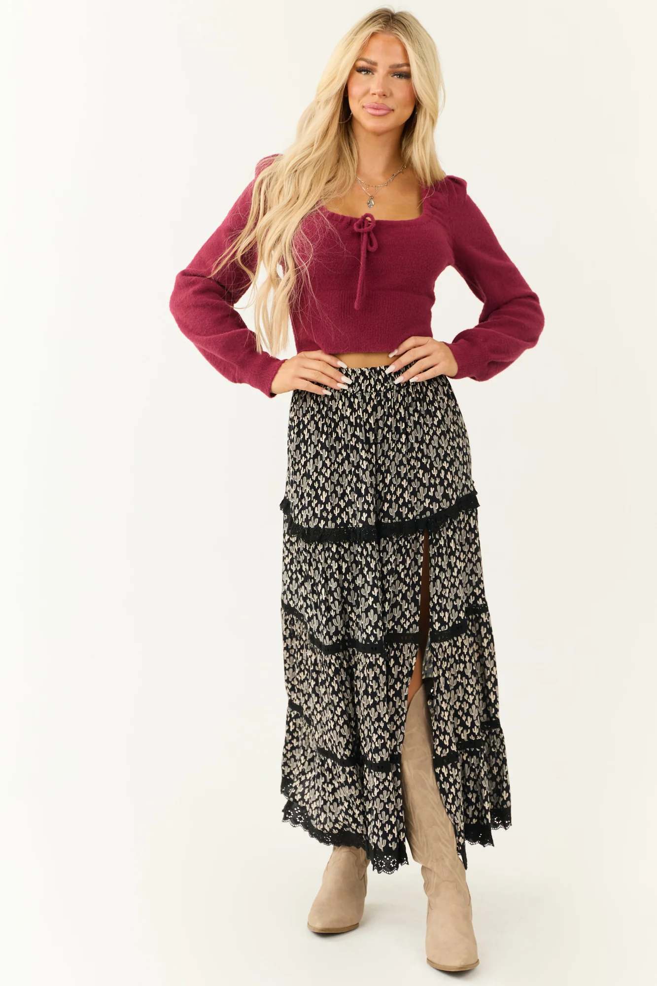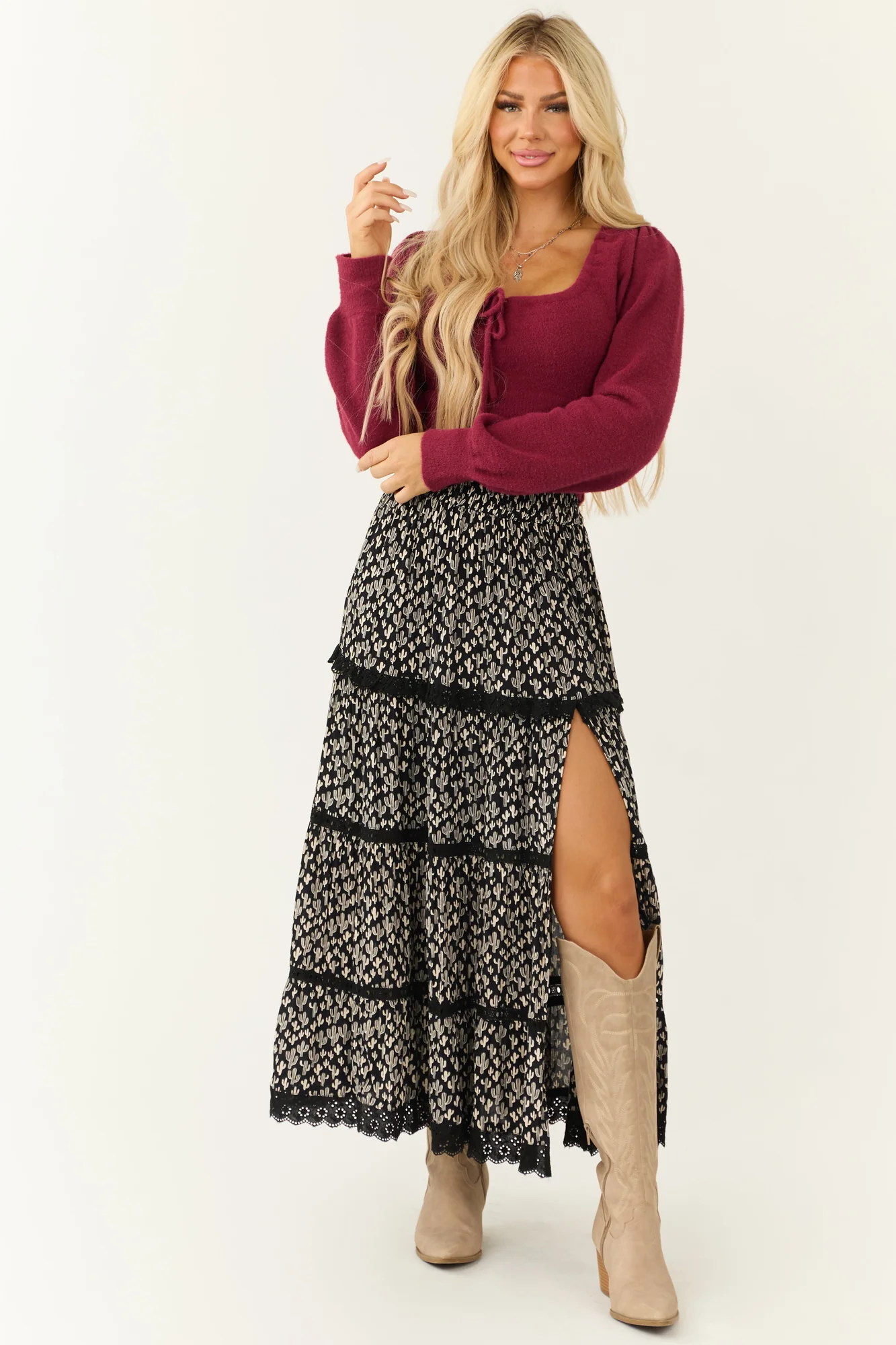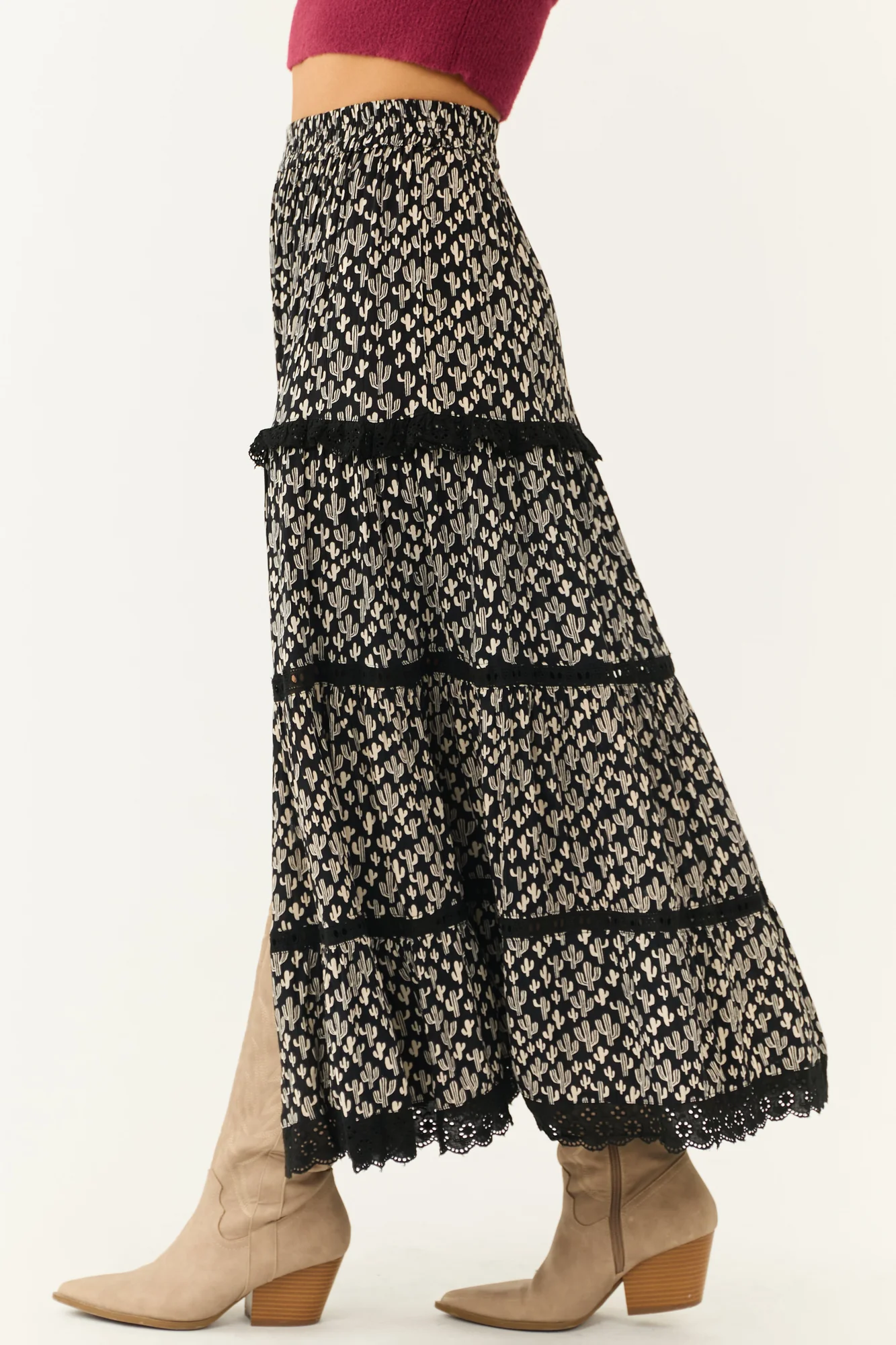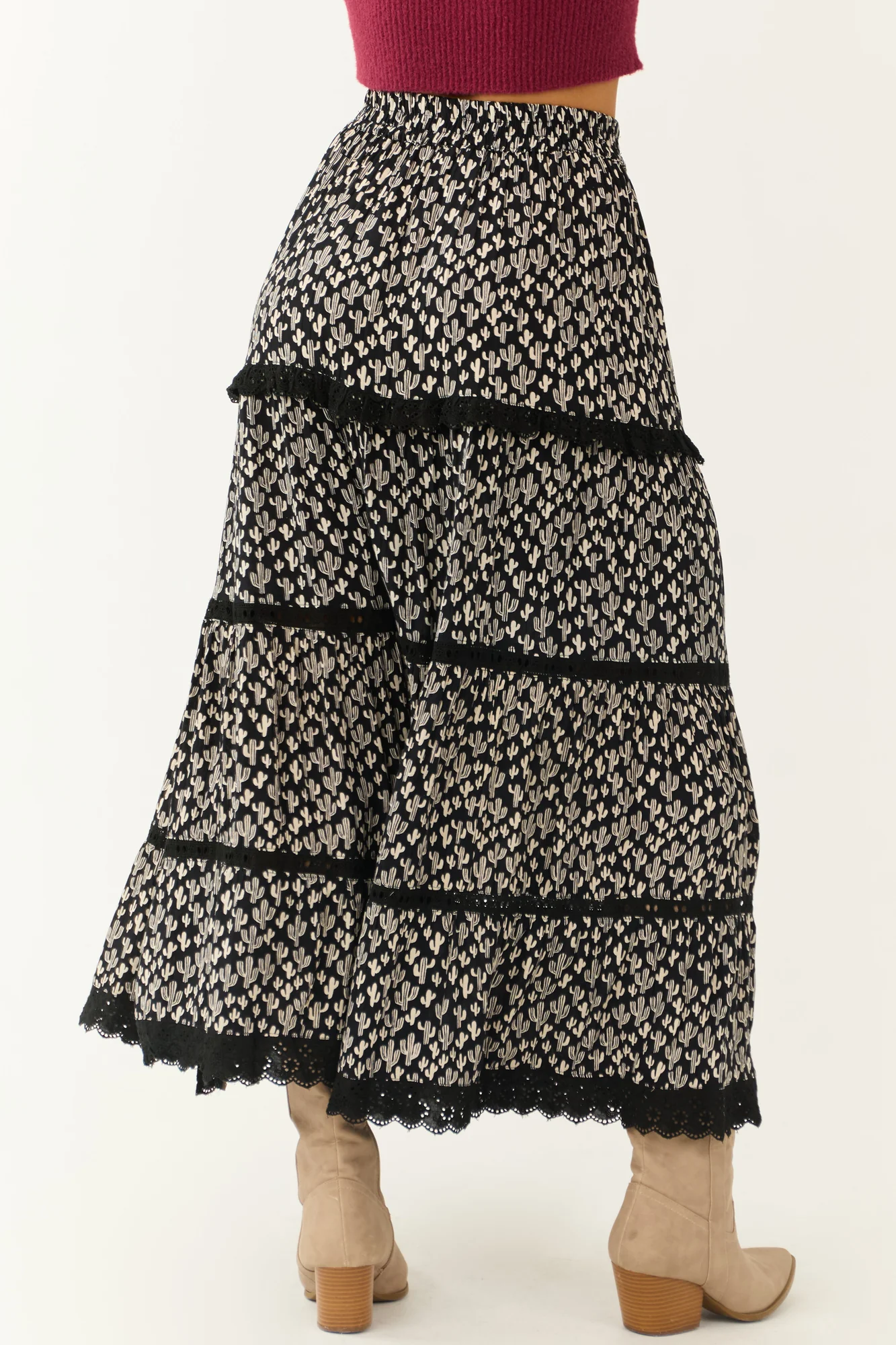 Explore the charm of the Ivory Cactus Print Lace Detail Maxi Skirt . Made from 100% Rayon, this non-stretchy woven skirt features delicate floral lace accents, an elastic waist for comfort, and an elegant slit design. Perfect for daytime occasions, this skirt can be styled effortlessly. Care instructions: Hand wash in cold water, drip dry, avoid bleach, iron on low. Embrace slight variations due to the unique print and production process. Model is wearing a size Small. Height: 57″, Bust: 34″, Waist: 26″.