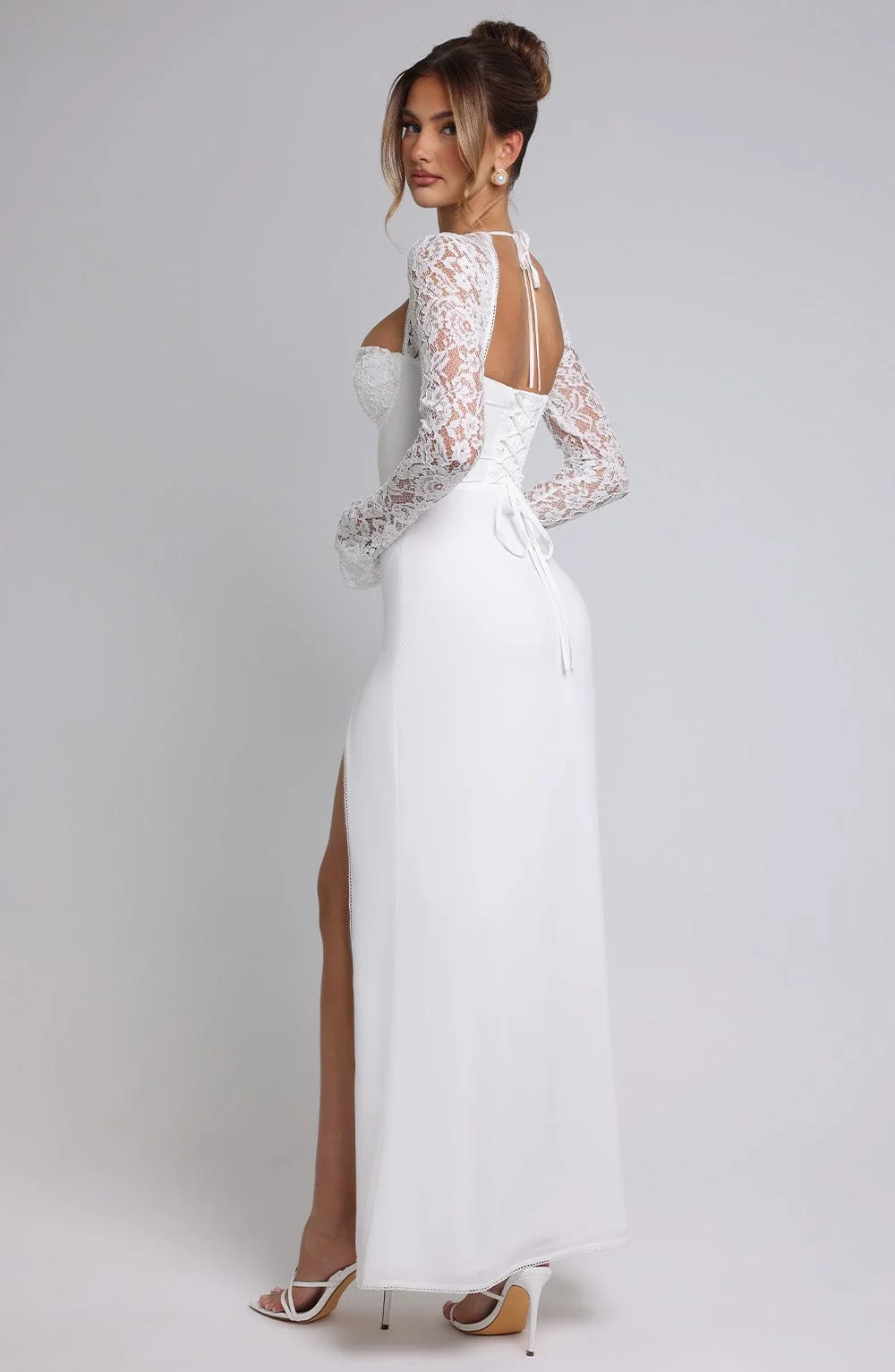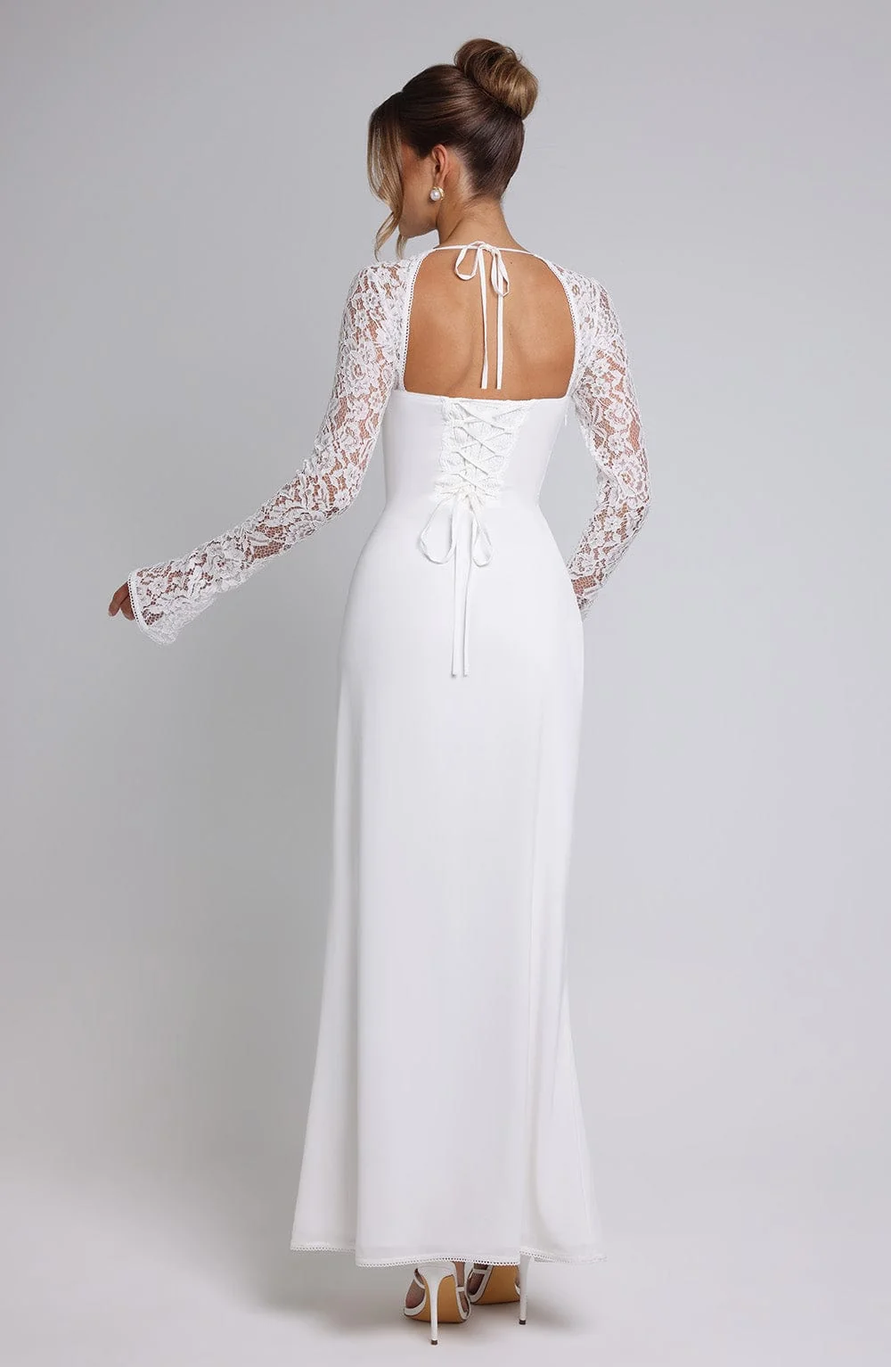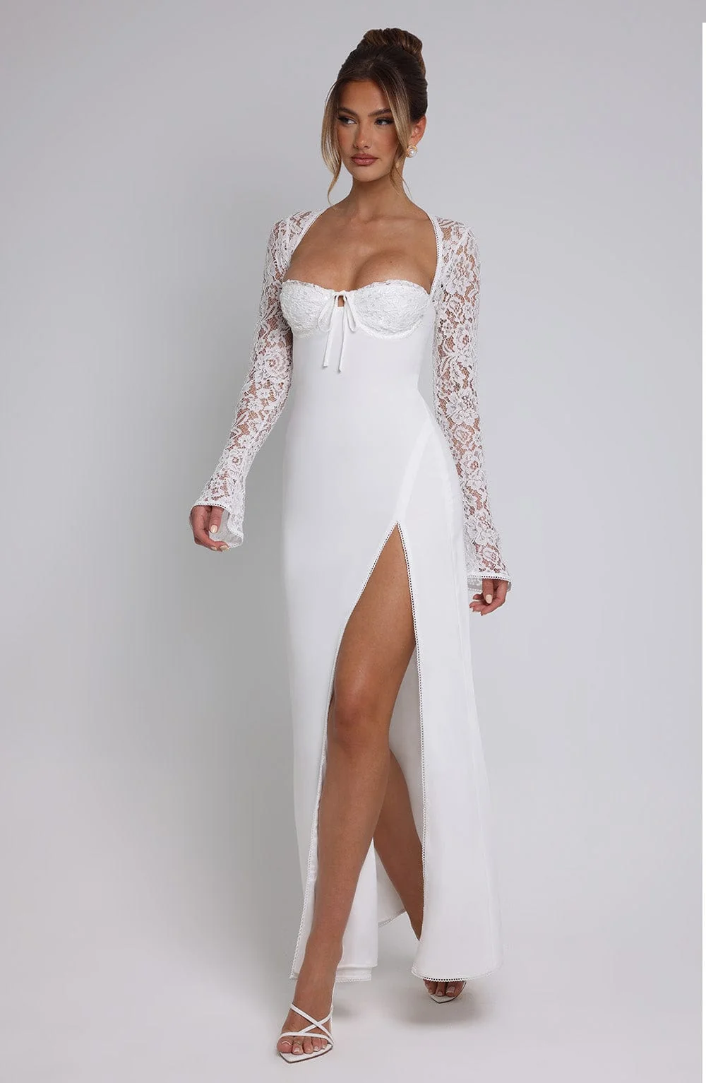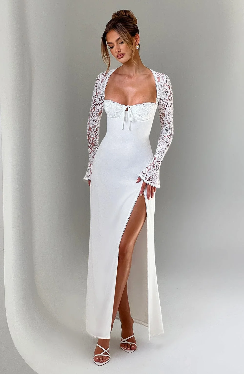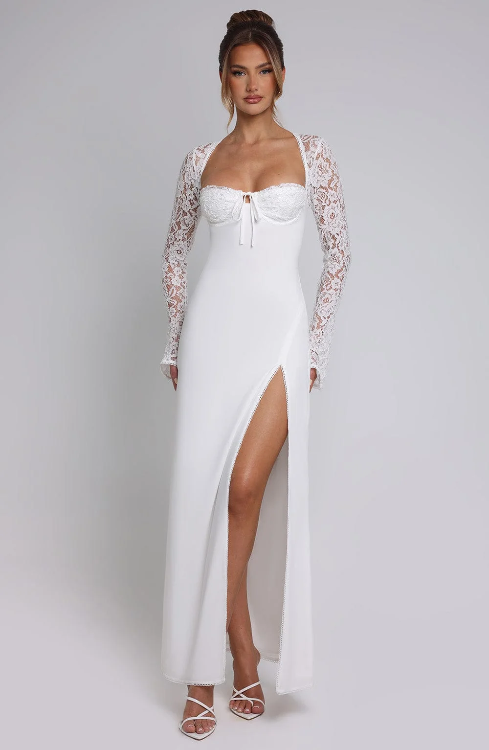 Experience ethereal elegance with our Ivory Chiffon Lace Sleeve Maxi Dress. Crafted from premium chiffon and satin lining, this dress features sheer lace sleeves, picot edge trimming, underwired cups, and a lace-up back with a shirred panel for a perfect fit. The thigh-high split, flared sleeves, and maxi length create a dreamy silhouette. Ideal for formal events and special occasions. Color: Ivory. Premium chiffon fabric. Fully lined with intricate lace details. Tie back neck.