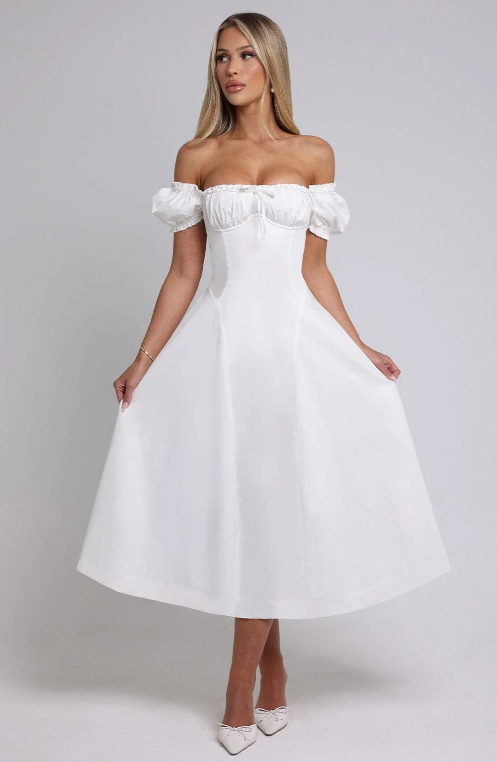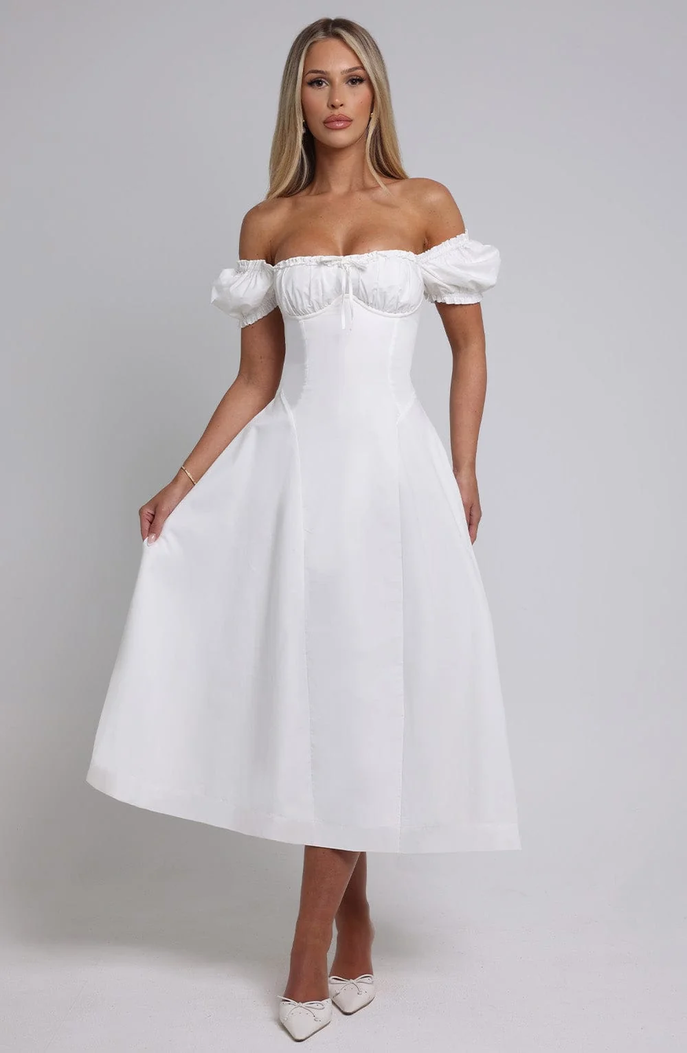 Elevate your style with the dreamy Ivory Cinched Waist Midi Dress crafted from a premium non-stretch cotton blend fabric. This ultra-feminine dress features elasticated puff sleeves, a gathered bust with tie detail, ruched underwired cups, and a lace-up back for a stunning look. The dropped waist silhouette, invisible zipper fastening, and midi length add elegance to this versatile piece. Perfect for various occasions including weddings, brunch, or formal events. Model is wearing size XS.