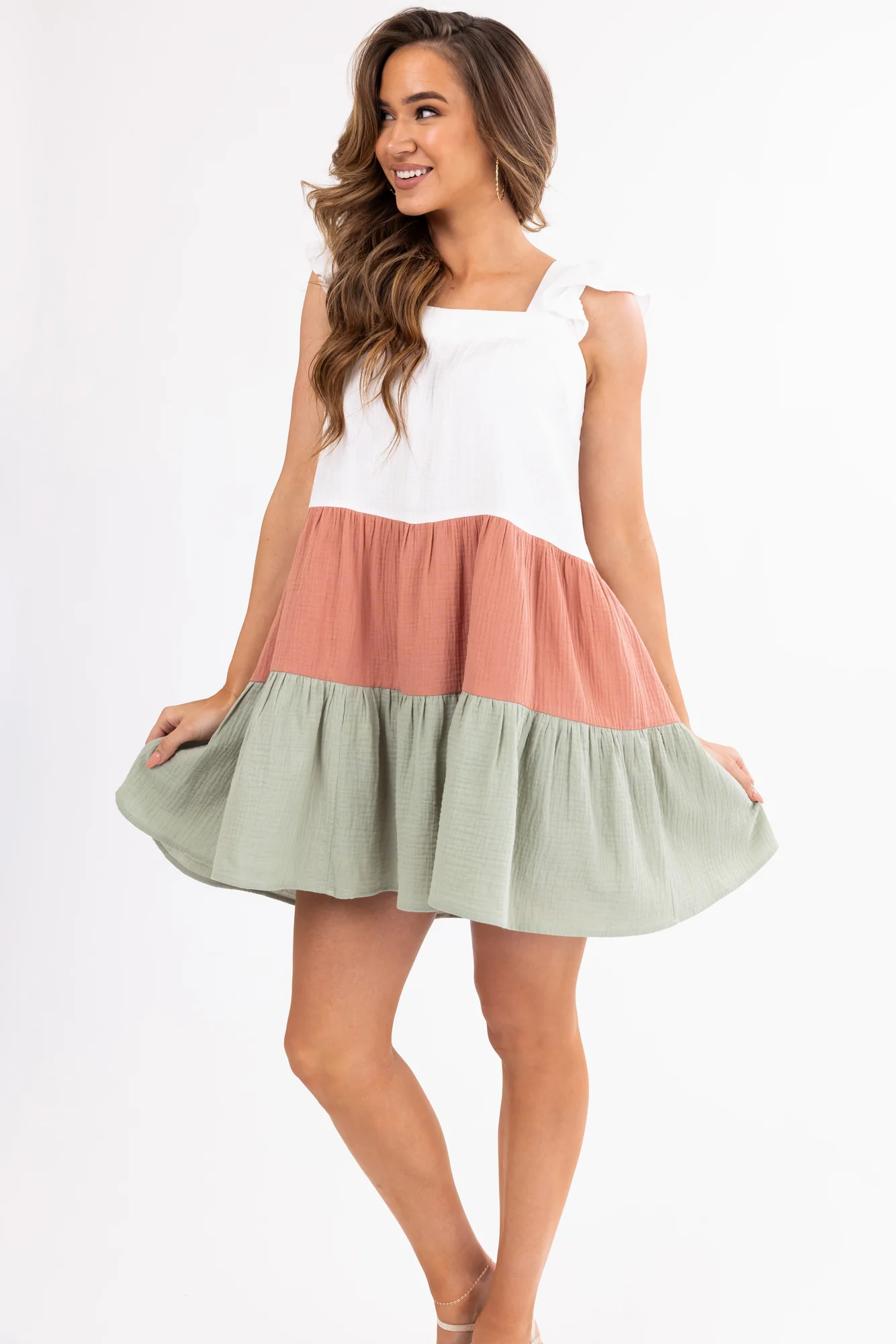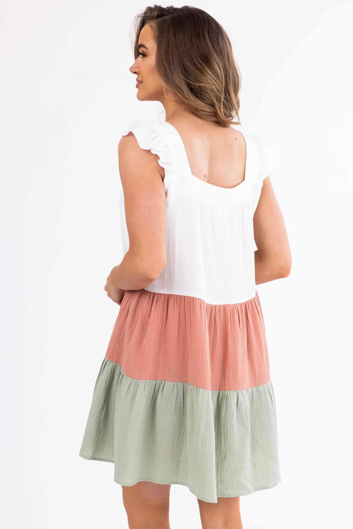 This Ivory Colorblock Short Dress in sizes S, M, L, and XL features ruffle sleeves, a loose fit, and a gauze textured woven fabric for a casual and comfortable look. With colors in Ivory, Ginger, and Sage, this dress has a square neckline and tiered design, perfect for spring or summer occasions. Made of 100% Cotton, this dress is unlined. Care instructions: Hand wash cold, lay flat to dry, cool iron. Model is wearing a size Small. Achieve a stylish and trendy outfit with this chic dress .