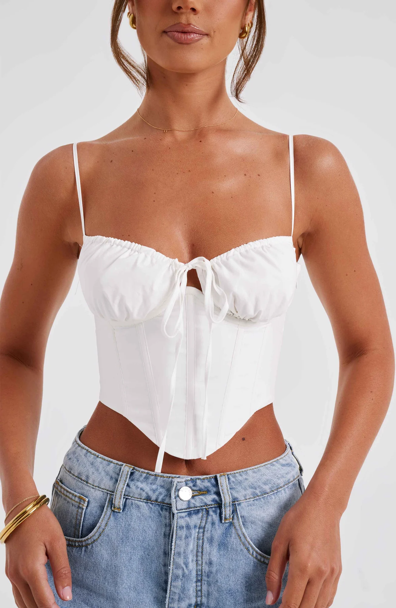 Upgrade your wardrobe with the must-have ivory corset top, Clara. This fun and flirty piece is crafted from premium non-stretch cotton, featuring underwired cups to enhance your bust. The boned body cinches the waist, while the slightly dipped hem adds flair. Complete with a zip closure at the back, this corset is perfect for pairing with denim and minimal jewelry. Available in sizes XS, S, M, L, XL, XXL. Model is wearing size XS. Channel your style effortlessly with Clara!