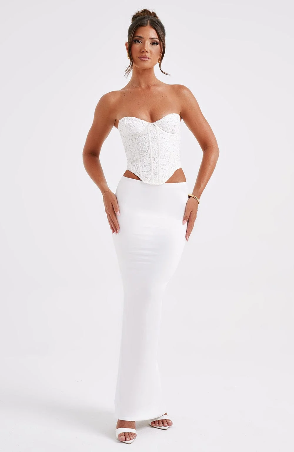 Experience the elegance and style with our Ivory Corset Top made from premium fabric. This structured top not only cinches your waist but also accentuates your bust with a lace-up tie back design. The strapless cut and dipped hem create a chic and sophisticated look that pairs beautifully with cargo pants or a maxi skirt, perfect for various occasions from parties to evening events. Elevate your fashion game with this corset top! Color: Ivory. Package includes: 1 Ivory Corset Top. Get the perfect fit with our size options: XS, S, M, L, XL, XXL.
