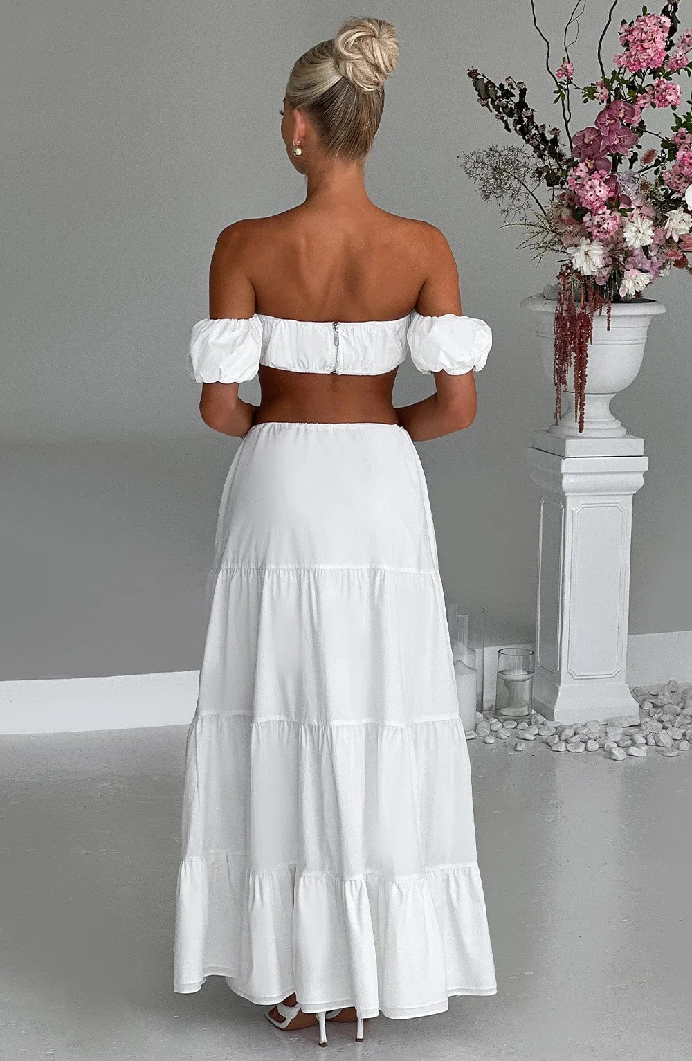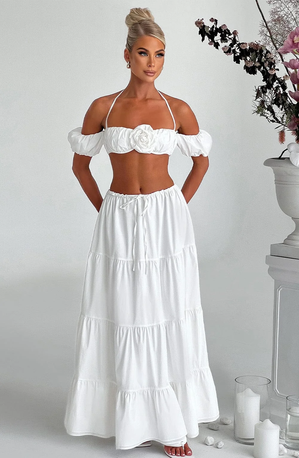 Enjoy brunches on balmy days in style with the Ivory Carmen Crop Top. Made from a crisp cotton blend, it features delicate halterneck ties, pretty puff sleeves, and all-over ruched detailing. The flirty corsage flower adds a charming touch. This top pairs perfectly with the Carmen maxi skirt for a stunning ensemble. Stay comfortable with the non-stretch fabric and look fashionable with the cropped fit. Ideal for various occasions and a must-have addition to your wardrobe. Model wears XS.