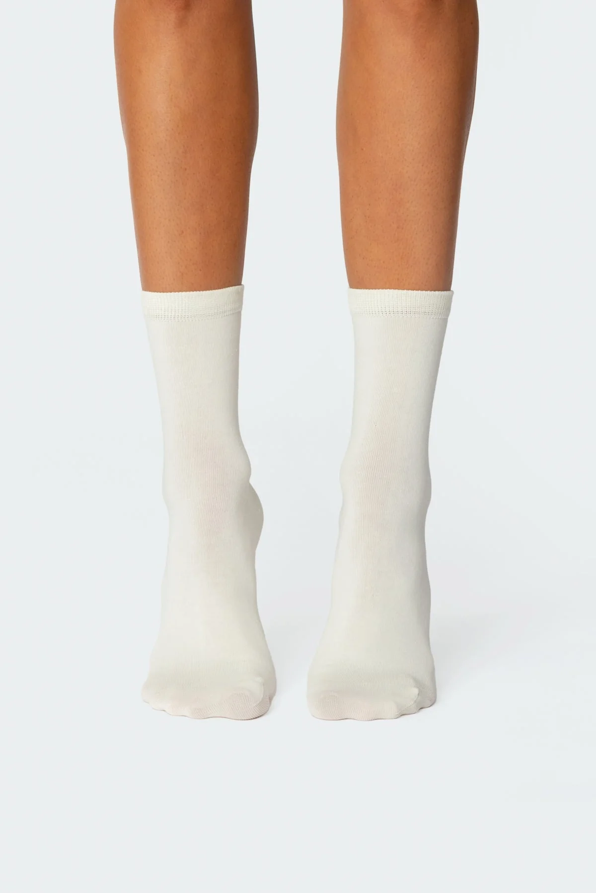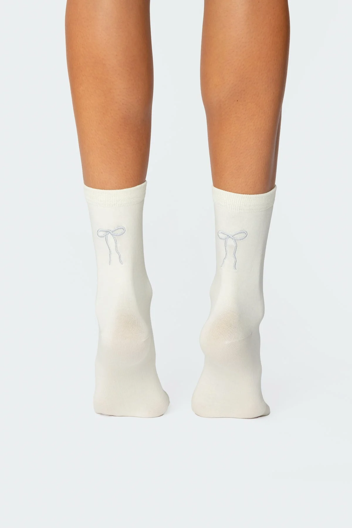Indulge in style and comfort with these Ivory Cotton Embroidered Bow Socks featuring a charming bow graphic. Made of high-quality cotton and spandex blend for a perfect fit. These socks are machine washable for easy care. Length: 12 inches.