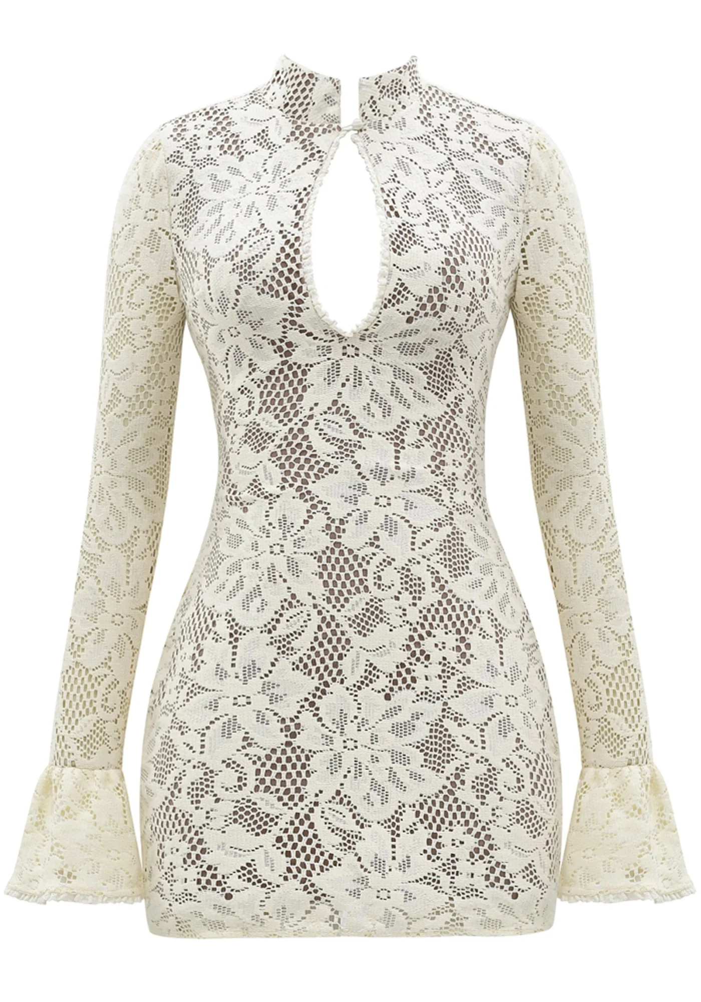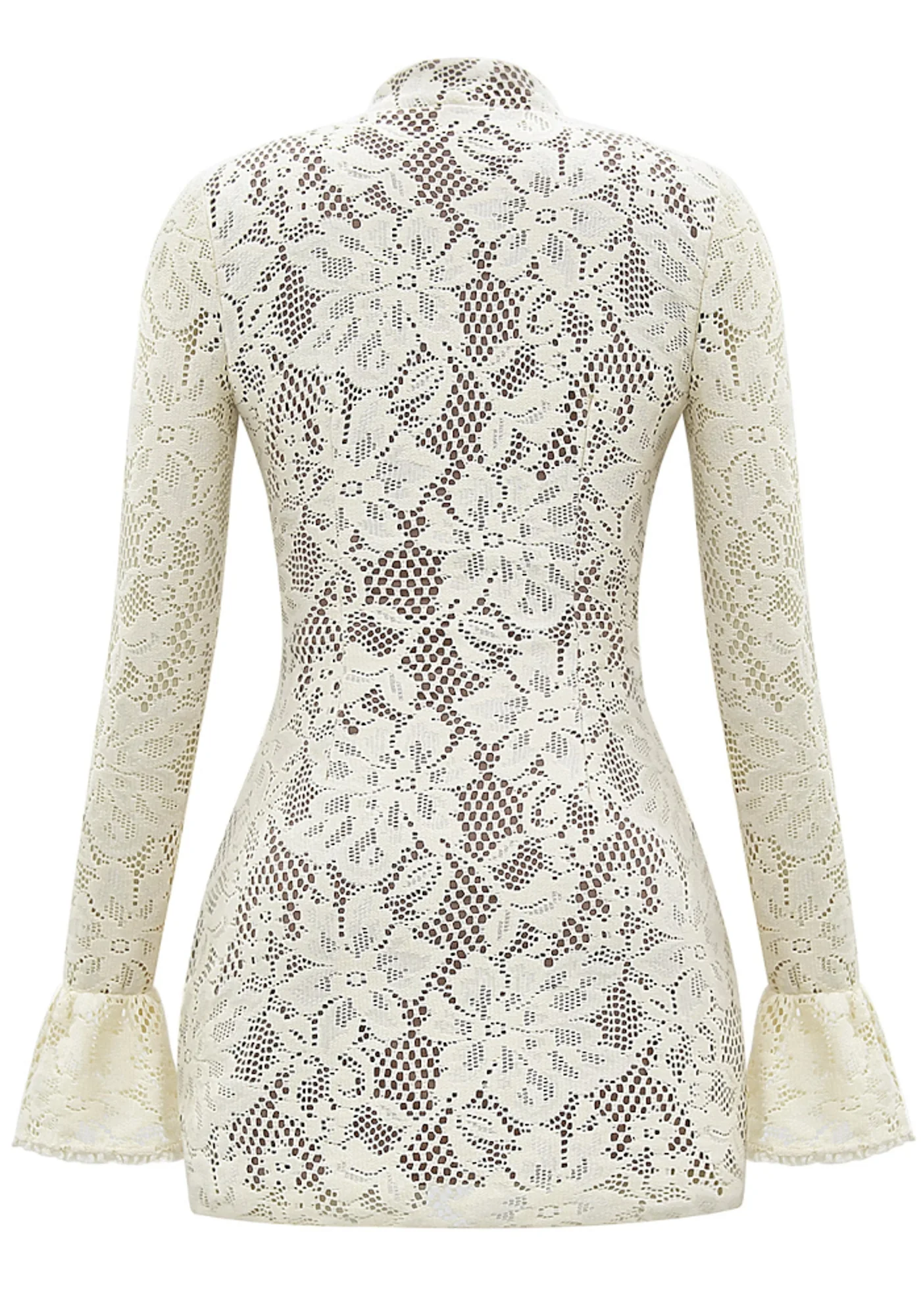 Indulge in the elegance of this ivory crochet mini dress featuring a Mao neck, long sleeves, and cut-out detail. Crafted from a blend of Polyester and Cotton with delicate sewing, YKK zipper, and back zipper closure. Gentle dry clean recommended for maintenance. Light and comfortable for any occasion.