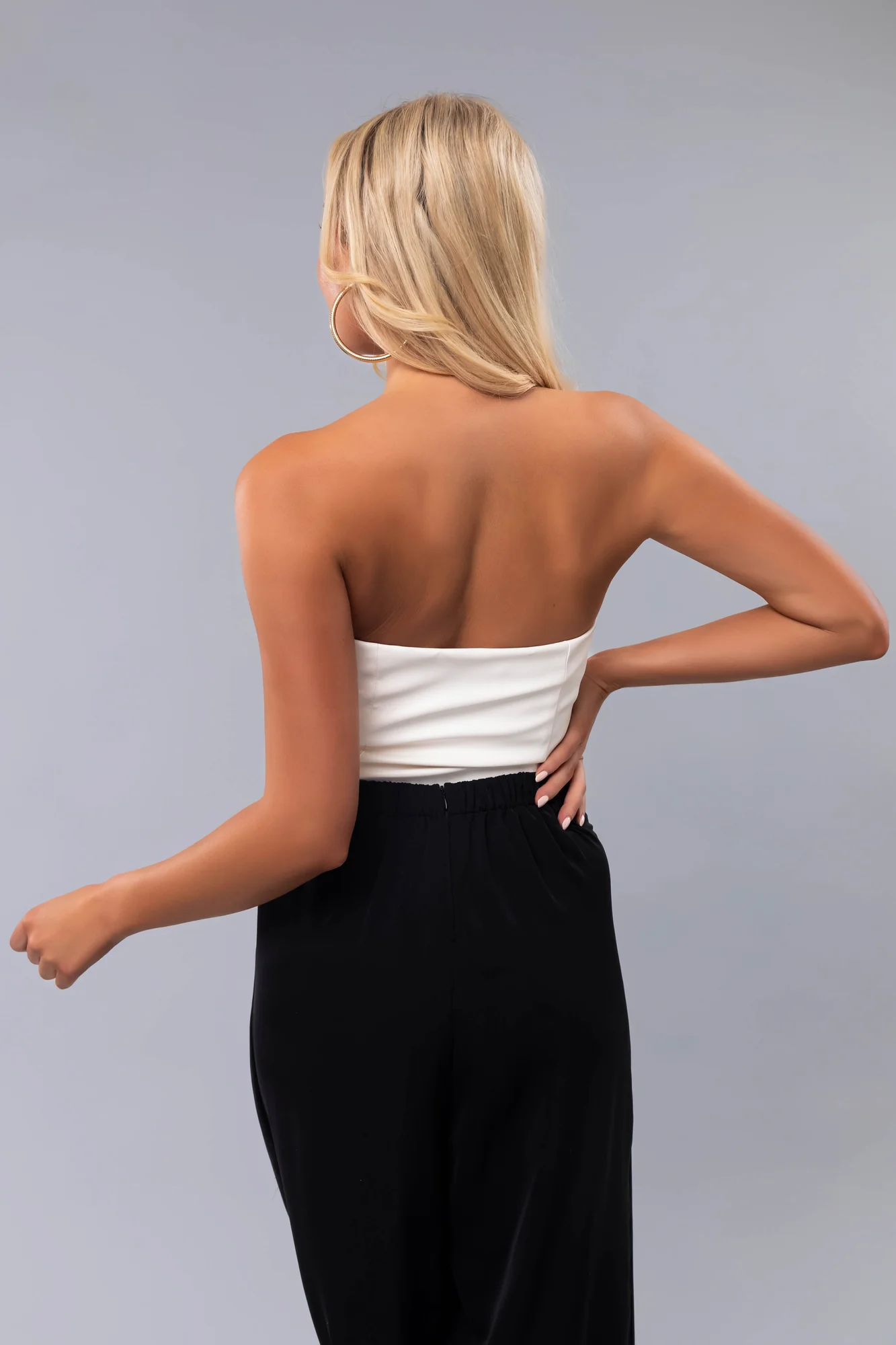 Stay chic and stylish in this ivory body suit featuring a deep V design and strapless sweetheart neckline. Crafted from a blend of Polyurethane and Cotton, it offers a non-stretchy leather top with a stretchy knit bottom for comfort. This bodysuit comes with torso lining, a side zipper, and a thong cut for a flattering fit. The snap button closure at the crotch ensures convenience. Imported and lined for quality. Please hand wash cold and avoid bleach, line dry, and iron at low heat. Model is 5’7” tall, wearing a size Small. Measurements: Bust – 28” (Size S), 31” (Size M), 34” (Size L). Torso Length: 20.5” (Size S), 21.5” (Size M), 22.5” (Size L).