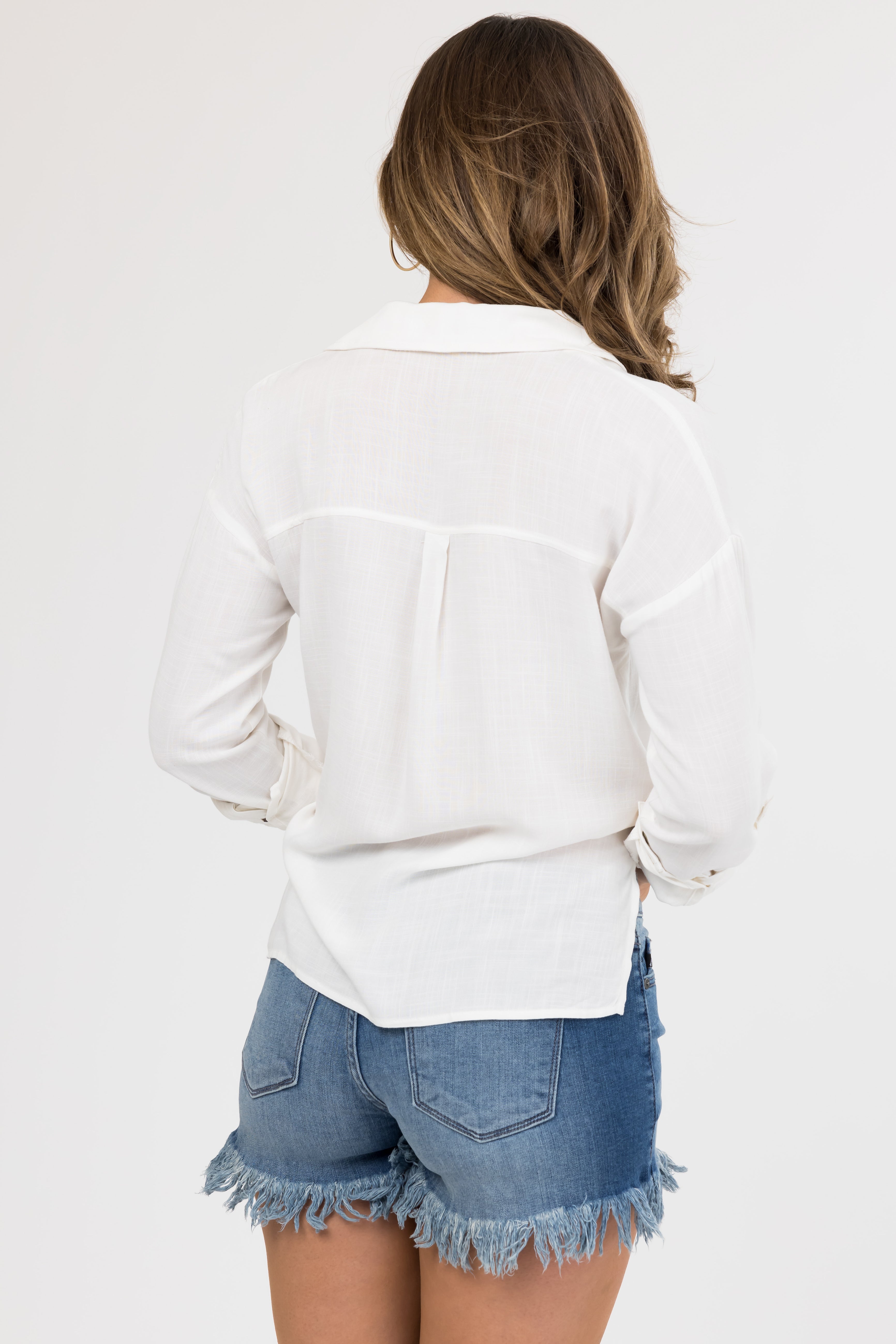 Elevate your wardrobe with this Ivory Faux Linen V-Neck Shirt featuring a Hem Tie detail. Made of lightweight and breathable faux linen for ultimate comfort. This non-stretchy woven shirt includes a collared neckline, pintuck front, drop shoulder, long sleeves with a rolled cuff option, and button fastener. Perfect for work or casual occasions. Care instructions: Hand wash cold, do not bleach, low iron, do not dry clean, line dry. Model is wearing size Small. Available in sizes S, M, and L.