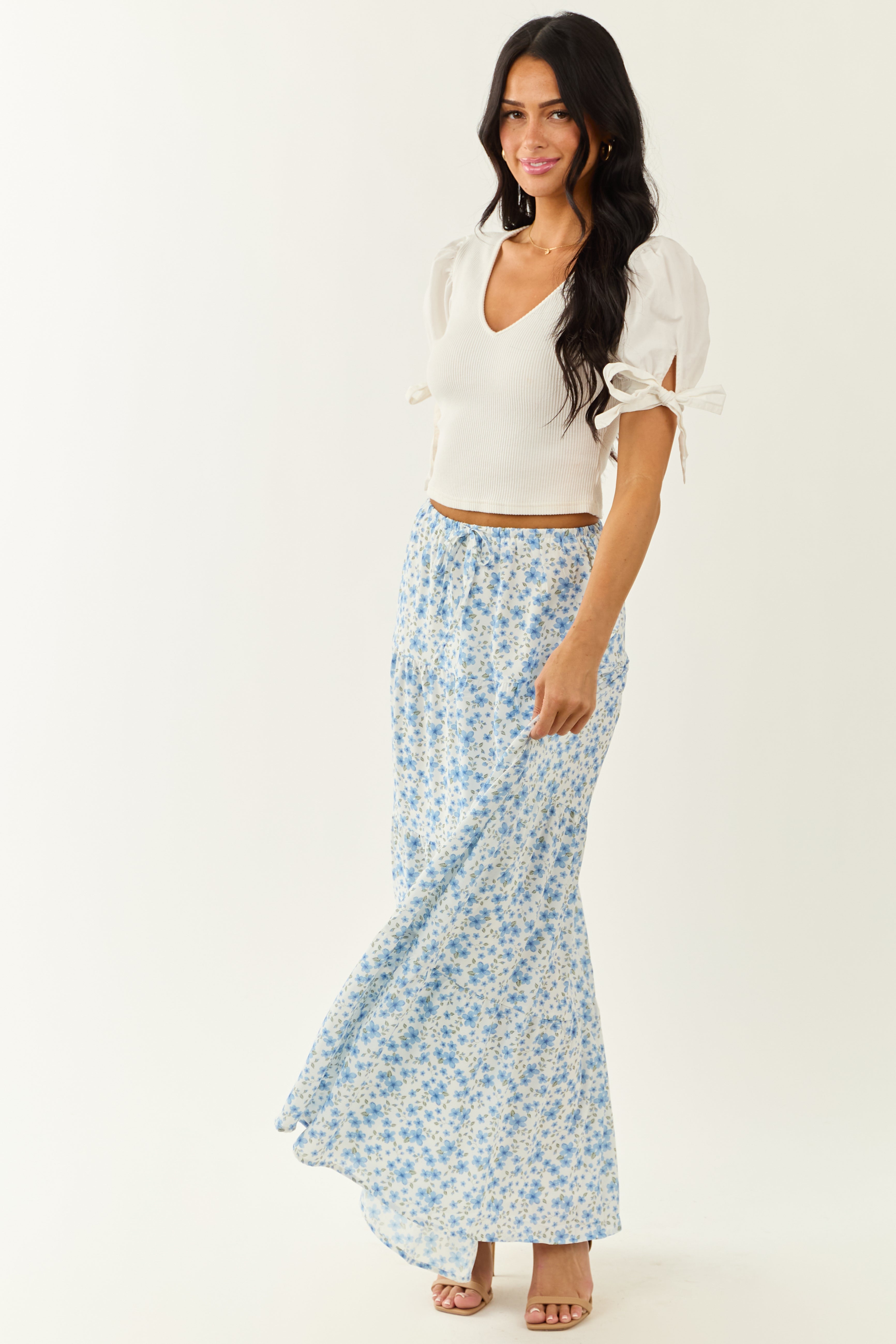Stay cool and stylish this summer with our Ivory Floral Flowy Maxi Skirt. Made with 100% polyester, this adorable skirt features a floral pattern in Cornflower and Juniper shades. The elastic waistband with an adjustable drawstring ensures a comfortable fit. Perfectly paired with our Ivory Floral Deep V Cap Sleeve Blouse for a chic ensemble. Ideal for a day out or a special occasion. Available in sizes S, M, and L. Imported. Model is 59″ tall, wearing a size Small. Embrace the whimsical charm of summer with this flowy skirt!