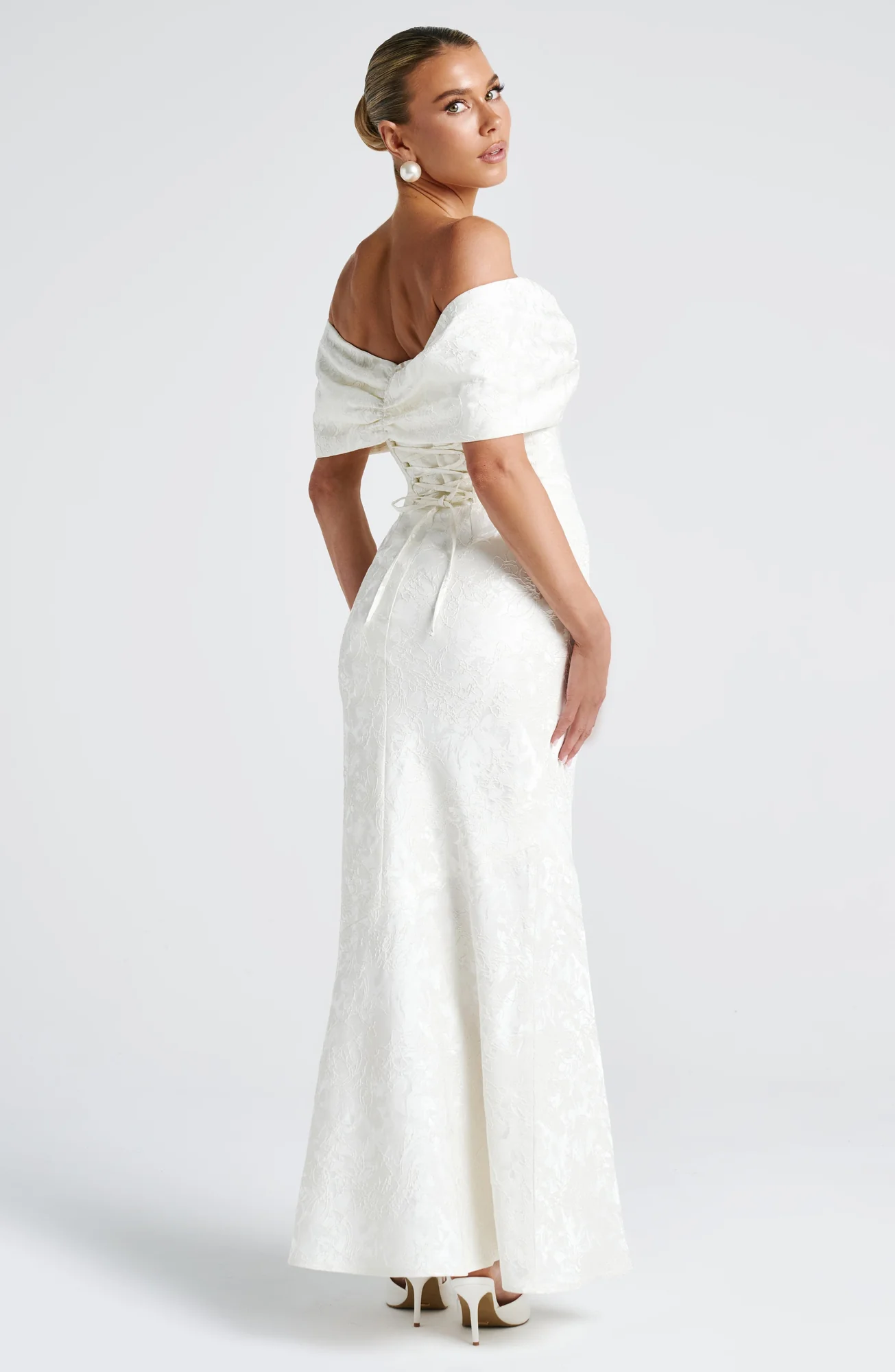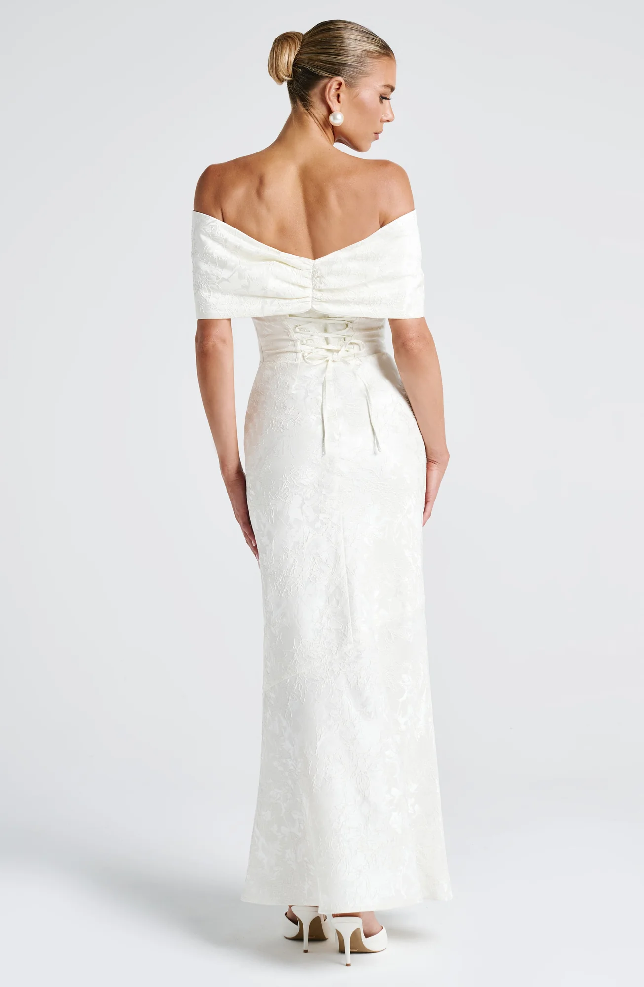 Indulge in ethereal elegance with our Ivory Floral Jacquard Maxi Dress featuring exquisite lace-up detailing for a custom fit. Embrace modern romance and sophistication through the bias-cut design, bardot bow neckline, and luxurious fabric. Perfect for special occasions like weddings or formal events. Elevate your style effortlessly!